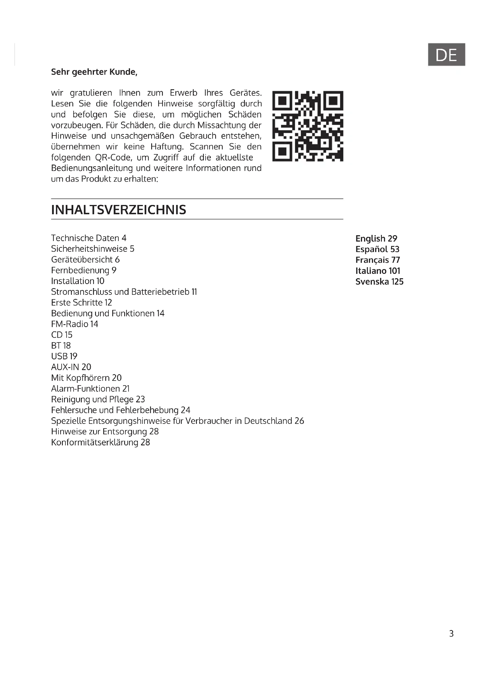 English 29 Español 53 Français 77 Italiano 101 Svenska 125 Sehr geehrter Kunde, wir gratulieren Ihnen zum Erwerb Ihres Gerätes. Lesen Sie die folgenden Hinweise sorgfältig durch und befolgen Sie diese, um möglichen Schäden vorzubeugen. Für Schäden, die durch Missachtung der Hinweise und unsachgemäßen Gebrauch entstehen, übernehmen wir keine Haftung. Scannen Sie den folgenden QR-Code, um Zugri auf die aktuellste Bedienungsanleitung und weitere Informationen rund um das Produkt zu erhalten: INHALTSVERZEICHNIS Technische Daten4 Sicherheitshinweise5 Geräteübersicht6 Fernbedienung9 Installation10 Stromanschluss und Batteriebetrieb11 Erste Schritte12 Bedienung und Funktionen14 FM-Radio14 CD15 BT18 USB19 AUX-IN20 Mit Kopfhörern20 Alarm-Funktionen21 Reinigung und Pege23 Fehlersuche und Fehlerbehebung24 Spezielle Entsorgungshinweise für Verbraucher in Deutschland26 Hinweise zur Entsorgung28 Konformitätserklärung284