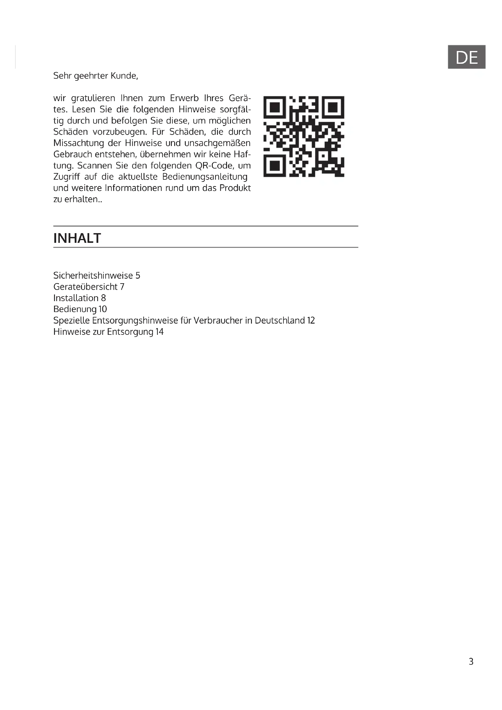 INHALT Sicherheitshinweise 5 Gerateübersicht 7 Installation 8 Bedienung 10 Spezielle Entsorgungshinweise für Verbraucher in Deutschland 12 Hinweise zur Entsorgung 14 Sehr geehrter Kunde, wir gratulieren Ihnen zum Erwerb Ihres Gerä- tes. Lesen Sie die folgenden Hinweise sorgfäl- tig durch und befolgen Sie diese, um möglichen Schäden vorzubeugen. Für Schäden, die durch Missachtung der Hinweise und unsachgemäßen Gebrauch entstehen, übernehmen wir keine Haf- tung. Scannen Sie den folgenden QR-Code, um Zugri auf die aktuellste Bedienungsanleitung und weitere Informationen rund um das Produkt zu erhalten..4