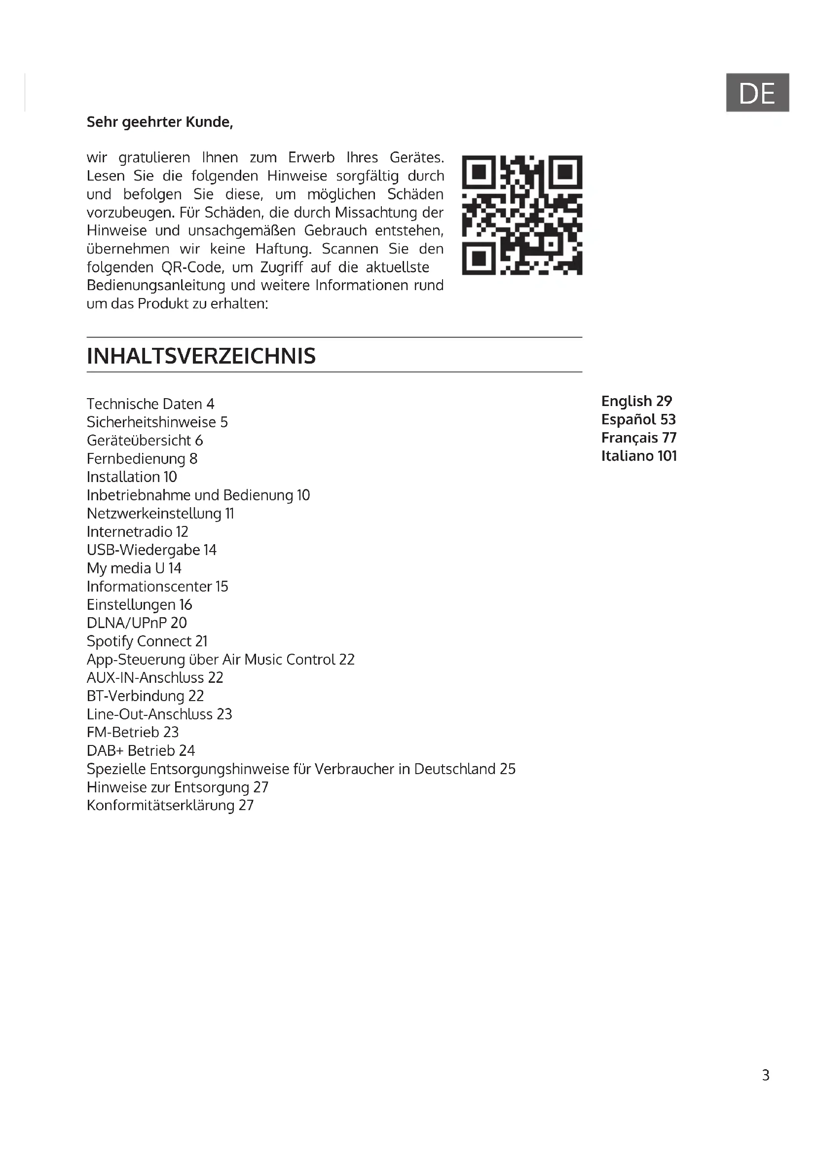 Sehr geehrter Kunde, wir gratulieren Ihnen zum Erwerb Ihres Gerätes. Lesen Sie die folgenden Hinweise sorgfältig durch und befolgen Sie diese, um möglichen Schäden vorzubeugen. Für Schäden, die durch Missachtung der Hinweise und unsachgemäßen Gebrauch entstehen, übernehmen wir keine Haftung. Scannen Sie den folgenden QR-Code, um Zugri auf die aktuellste Bedienungsanleitung und weitere Informationen rund um das Produkt zu erhalten: INHALTSVERZEICHNIS Technische Daten 4 Sicherheitshinweise 5 Geräteübersicht 6 Fernbedienung 8 Installation 10 Inbetriebnahme und Bedienung 10 Netzwerkeinstellung 11 Internetradio 12 USB-Wiedergabe 14 My media U 14 Informationscenter 15 Einstellungen 16 DLNA/UPnP 20 Spotify Connect 21 App-Steuerung über Air Music Control 22 AUX-IN-Anschluss 22 BT-Verbindung 22 Line-Out-Anschluss 23 FM-Betrieb 23 DAB+ Betrieb 24 Spezielle Entsorgungshinweise für Verbraucher in Deutschland 25 Hinweise zur Entsorgung 27 Konformitätserklärung 27 English 29 Español 53 Français 77 Italiano 1014