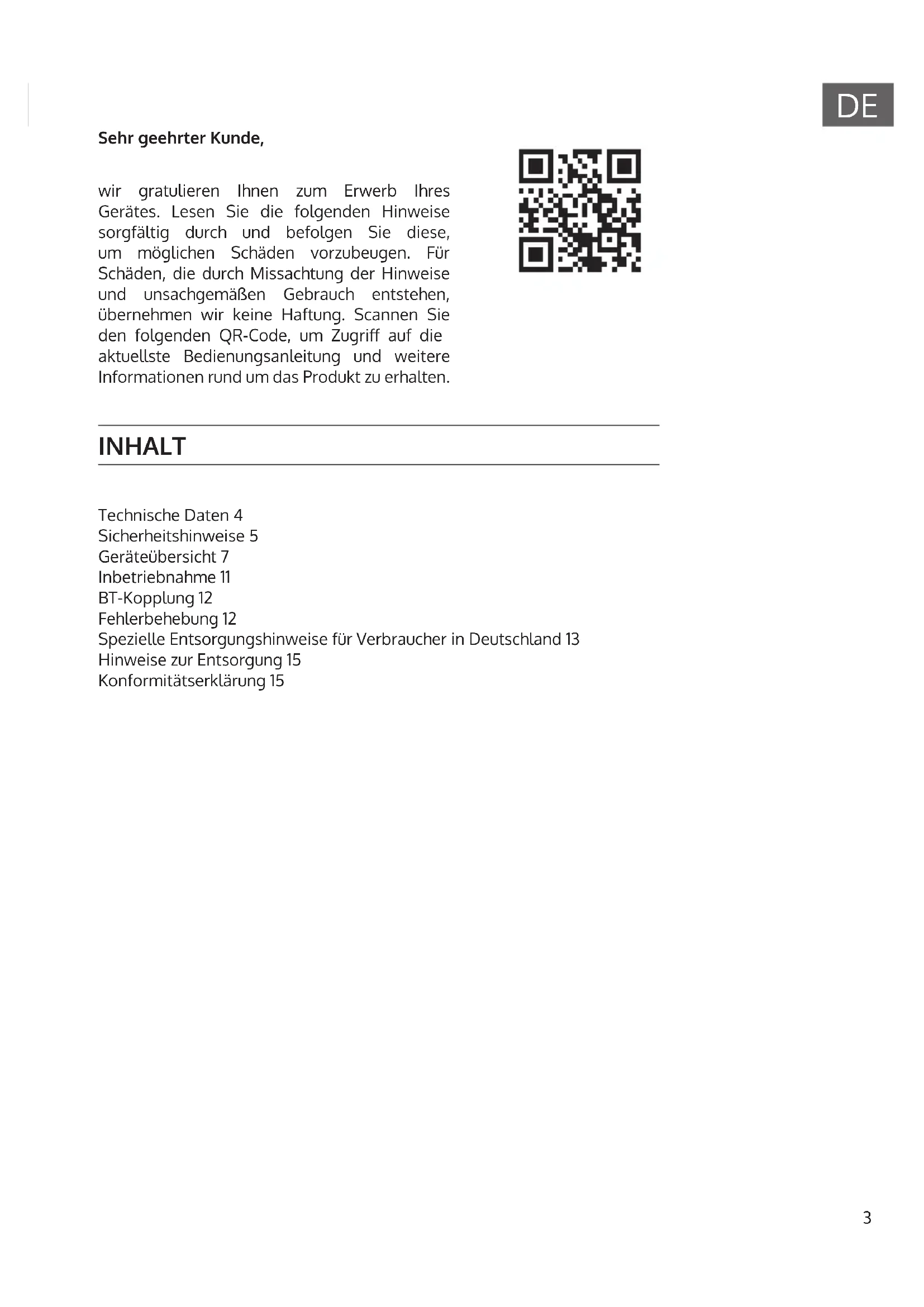 Technische Daten 4 Sicherheitshinweise 5 Geräteübersicht 7 Inbetriebnahme 11 BT-Kopplung 12 Fehlerbehebung 12 Spezielle Entsorgungshinweise für Verbraucher in Deutschland 13 Hinweise zur Entsorgung 15 Konformitätserklärung 15 INHALT Sehr geehrter Kunde, wir gratulieren Ihnen zum Erwerb Ihres Gerätes. Lesen Sie die folgenden Hinweise sorgfältig durch und befolgen Sie diese, um möglichen Schäden vorzubeugen. Für Schäden, die durch Missachtung der Hinweise und unsachgemäßen Gebrauch entstehen, übernehmen wir keine Haftung. Scannen Sie den folgenden QR-Code, um Zugri auf die aktuellste Bedienungsanleitung und weitere Informationen rund um das Produkt zu erhalten.4