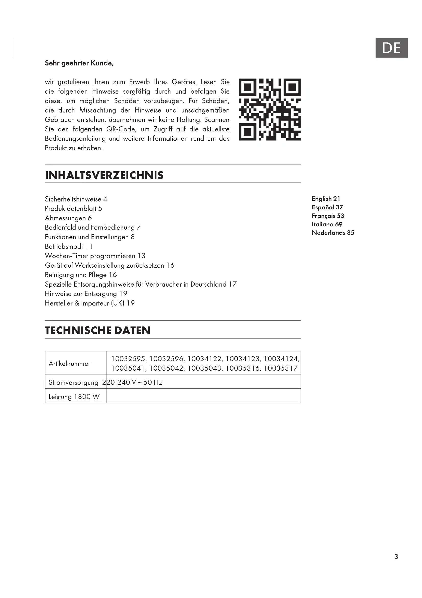 Sehr geehrter Kunde, wir gratulieren Ihnen zum Erwerb Ihres Gerätes. Lesen Sie die folgenden Hinweise sorgfältig durch und befolgen Sie diese, um möglichen Schäden vorzubeugen. Für Schäden, die durch Missachtung der Hinweise und unsachgemäßen Gebrauch entstehen, übernehmen wir keine Haftung. Scannen Sie den folgenden QR-Code, um Zugriff auf die aktuellste Bedienungsanleitung und weitere Informationen rund um das Produkt zu erhalten. INHALTSVERZEICHNIS Sicherheitshinweise4 Produktdatenblatt5 Abmessungen6 Bedienfeld und Fernbedienung7 Funktionen und Einstellungen8 Betriebsmodi11 Wochen-Timer programmieren13 Gerät auf Werkseinstellung zurücksetzen16 Reinigung und Pege16 Spezielle Entsorgungshinweise für Verbraucher in Deutschland17 Hinweise zur Entsorgung19 Hersteller & Importeur (UK)19 TECHNISCHE DATEN Artikelnummer 10032595, 10032596, 10034122, 10034123, 10034124, 10035041, 10035042, 10035043, 10035316, 10035317 Stromversorgung 220-240 V ~ 50 Hz Leistung 1800 W English 21 Español 37 Français 53 Italiano 69 Nederlands 854