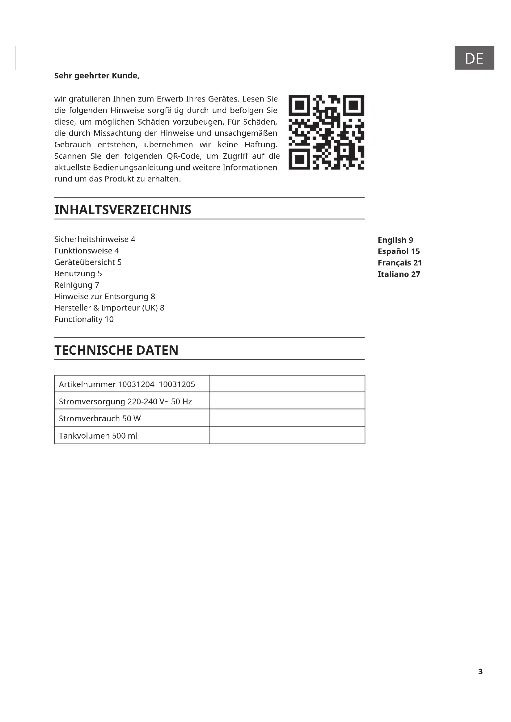Sehr geehrter Kunde, wir gratulieren Ihnen zum Erwerb Ihres Gerätes. Lesen Sie die folgenden Hinweise sorgfältig durch und befolgen Sie diese, um möglichen Schäden vorzubeugen. Für Schäden, die durch Missachtung der Hinweise und unsachgemäßen Gebrauch entstehen, übernehmen wir keine Haftung. Scannen Sie den folgenden QR-Code, um Zugri auf die aktuellste Bedienungsanleitung und weitere Informationen rund um das Produkt zu erhalten. INHALTSVERZEICHNIS Sicherheitshinweise 4 Funktionsweise 4 Geräteübersicht 5 Benutzung 5 Reinigung 7 Hinweise zur Entsorgung 8 Hersteller & Importeur (UK) 8 Functionality 10 TECHNISCHE DATEN Artikelnummer 10031204 10031205 Stromversorgung 220-240 V~ 50 Hz Stromverbrauch 50 W Tankvolumen 500 ml English 9 Español 15 Français 21 Italiano 274