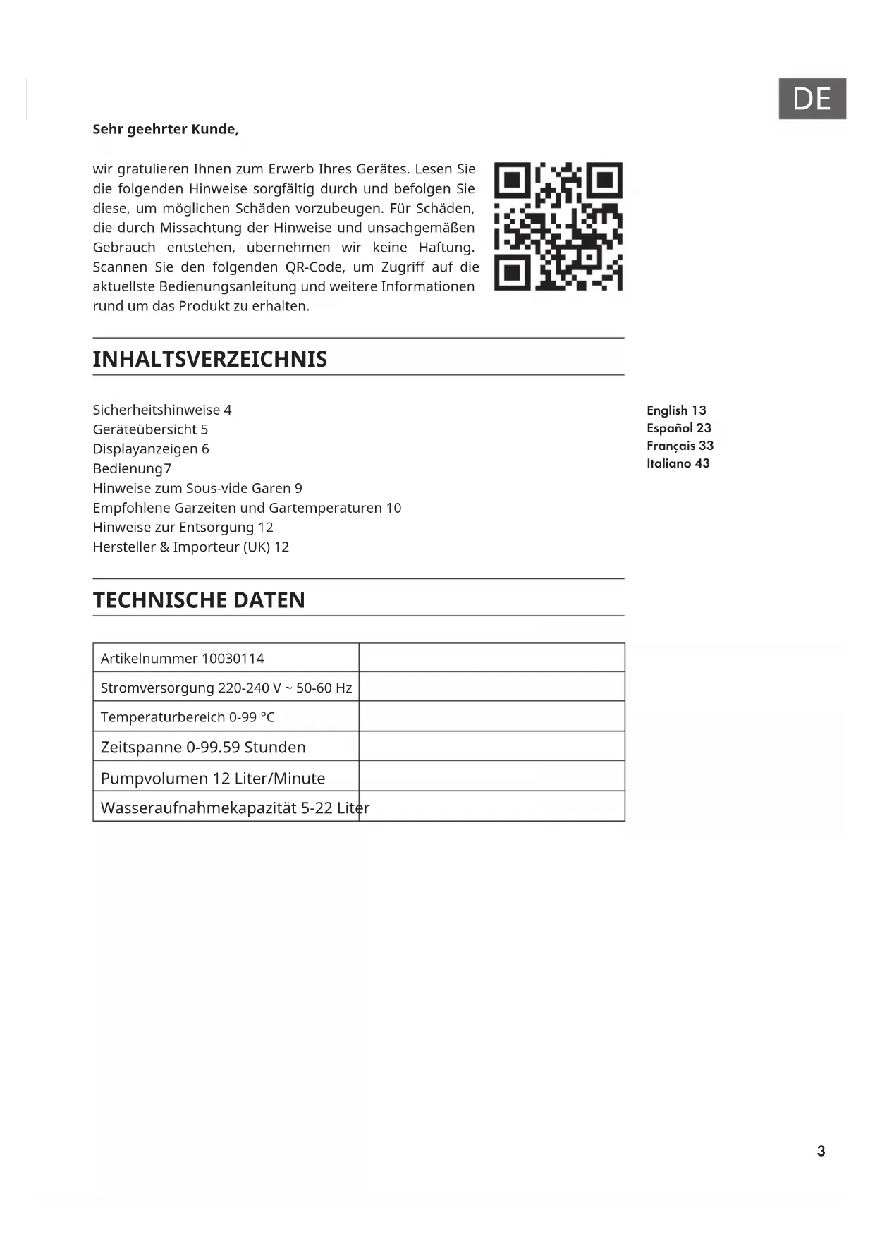 Sehr geehrter Kunde, wir gratulieren Ihnen zum Erwerb Ihres Gerätes. Lesen Sie die folgenden Hinweise sorgfältig durch und befolgen Sie diese, um möglichen Schäden vorzubeugen. Für Schäden, die durch Missachtung der Hinweise und unsachgemäßen Gebrauch entstehen, übernehmen wir keine Haftung. Scannen Sie den folgenden QR-Code, um Zugri auf die aktuellste Bedienungsanleitung und weitere Informationen rund um das Produkt zu erhalten. INHALTSVERZEICHNIS Sicherheitshinweise 4 Geräteübersicht 5 Displayanzeigen 6 Bedienung 7 Hinweise zum Sous-vide Garen 9 Empfohlene Garzeiten und Gartemperaturen 10 Hinweise zur Entsorgung 12 Hersteller & Importeur (UK) 12 TECHNISCHE DATEN Artikelnummer 10030114 Stromversorgung 220-240 V ~ 50-60 Hz Temperaturbereich 0-99 °C Zeitspanne 0-99.59 Stunden Pumpvolumen 12 Liter/Minute Wasseraufnahmekapazität 5-22 Liter English 13 Español 23 Français 33 Italiano 434