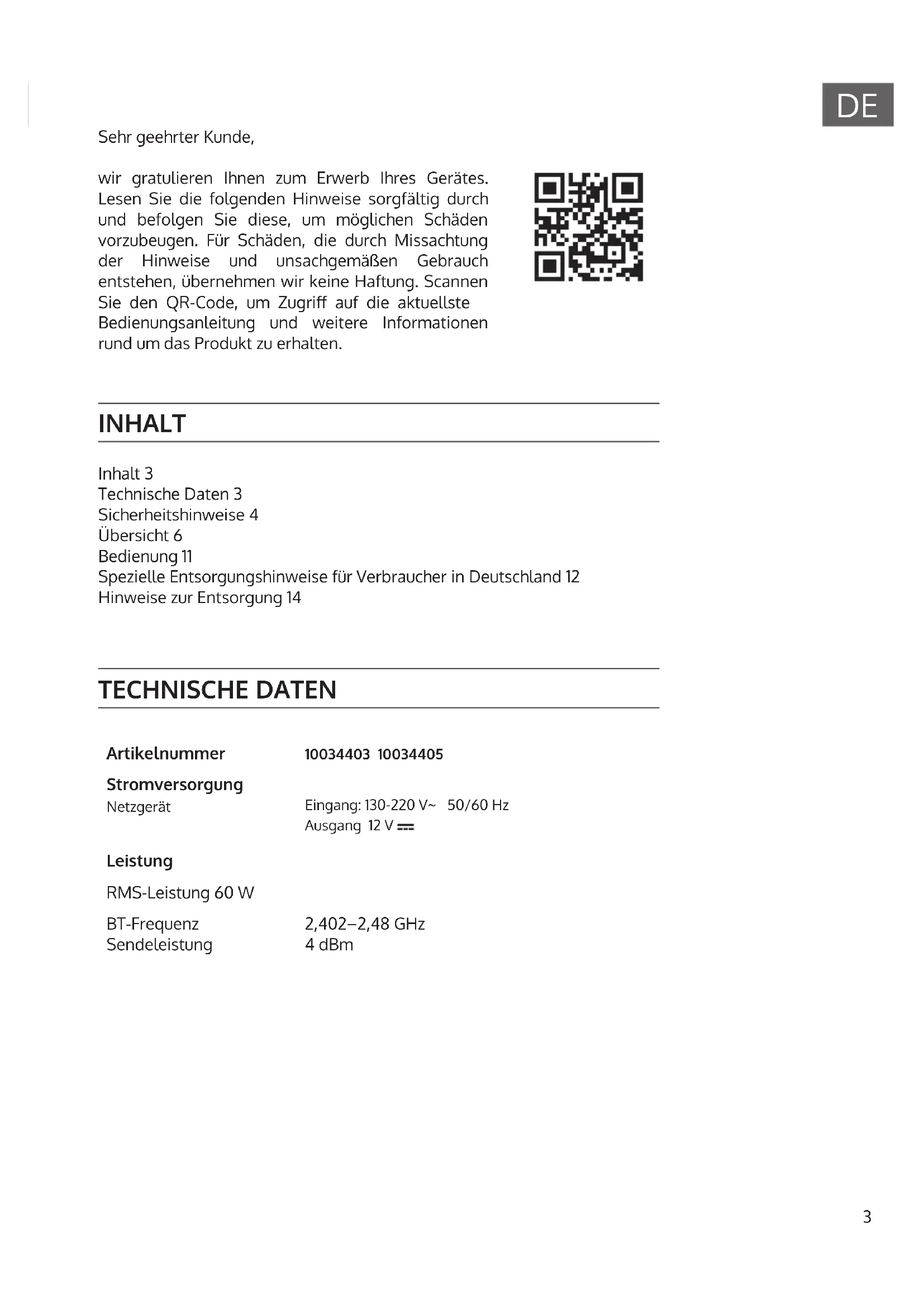 Stromversorgung Netzgerät Eingang: 130-220 V~ 50/60 Hz Ausgang 12 V Leistung RMS-Leistung 60 W BT-Frequenz Sendeleistung 2,402–2,48 GHz 4 dBm INHALT Inhalt 3 Technische Daten 3 Sicherheitshinweise 4 Übersicht 6 Bedienung 11 Spezielle Entsorgungshinweise für Verbraucher in Deutschland 12 Hinweise zur Entsorgung 144