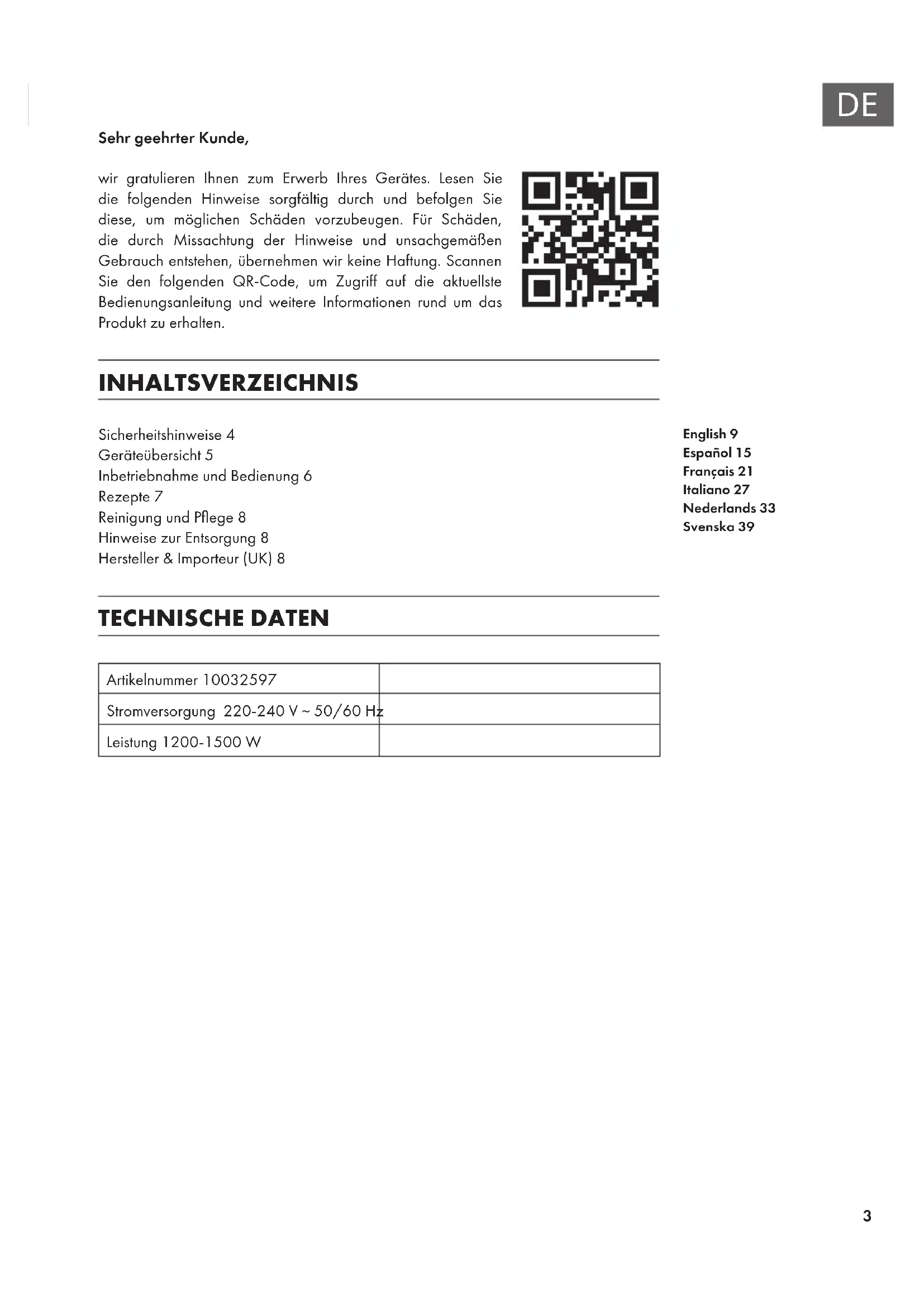 Sehr geehrter Kunde, wir gratulieren Ihnen zum Erwerb Ihres Gerätes. Lesen Sie die folgenden Hinweise sorgfältig durch und befolgen Sie diese, um möglichen Schäden vorzubeugen. Für Schäden, die durch Missachtung der Hinweise und unsachgemäßen Gebrauch entstehen, übernehmen wir keine Haftung. Scannen Sie den folgenden QR-Code, um Zugriff auf die aktuellste Bedienungsanleitung und weitere Informationen rund um das Produkt zu erhalten. INHALTSVERZEICHNIS Sicherheitshinweise4 Geräteübersicht5 Inbetriebnahme und Bedienung6 Rezepte7 Reinigung und Pege8 Hinweise zur Entsorgung8 Hersteller & Importeur (UK)8 TECHNISCHE DATEN Artikelnummer 10032597 Stromversorgung 220-240 V ~ 50/60 Hz Leistung 1200-1500 W English 9 Español 15 Français 21 Italiano 27 Nederlands 33 Svenska 394