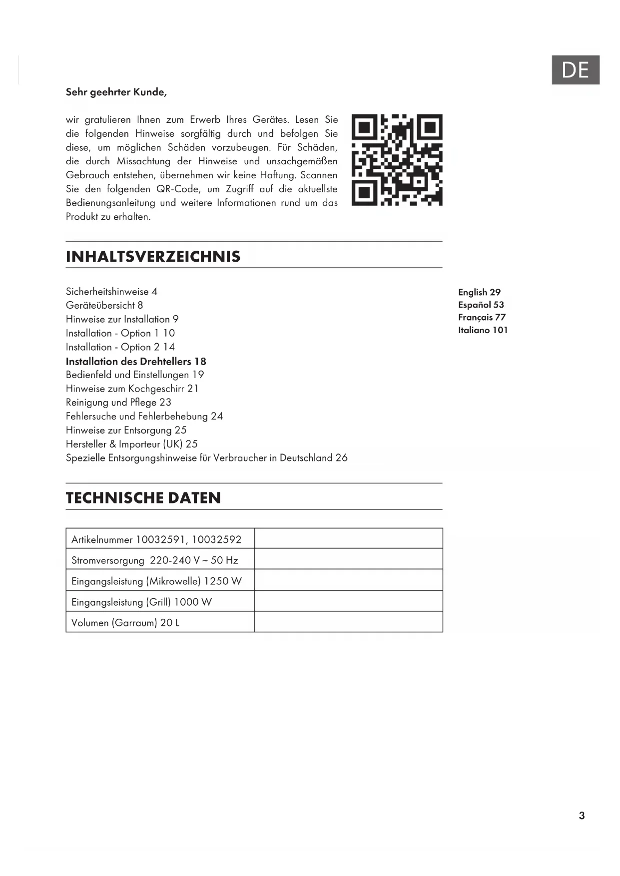 Sehr geehrter Kunde, wir gratulieren Ihnen zum Erwerb Ihres Gerätes. Lesen Sie die folgenden Hinweise sorgfältig durch und befolgen Sie diese, um möglichen Schäden vorzubeugen. Für Schäden, die durch Missachtung der Hinweise und unsachgemäßen Gebrauch entstehen, übernehmen wir keine Haftung. Scannen Sie den folgenden QR-Code, um Zugriff auf die aktuellste Bedienungsanleitung und weitere Informationen rund um das Produkt zu erhalten. INHALTSVERZEICHNIS Sicherheitshinweise4 Geräteübersicht8 Hinweise zur Installation9 Installation - Option 110 Installation - Option 214 Installation des Drehtellers18 Bedienfeld und Einstellungen19 Hinweise zum Kochgeschirr21 Reinigung und Pege23 Fehlersuche und Fehlerbehebung24 Hinweise zur Entsorgung25 Hersteller & Importeur (UK)25 Spezielle Entsorgungshinweise für Verbraucher in Deutschland26 TECHNISCHE DATEN Artikelnummer 10032591, 10032592 Stromversorgung 220-240 V ~ 50 Hz Eingangsleistung (Mikrowelle) 1250 W Eingangsleistung (Grill) 1000 W Volumen (Garraum) 20 L English 29 Español 53 Français 77 Italiano 1014