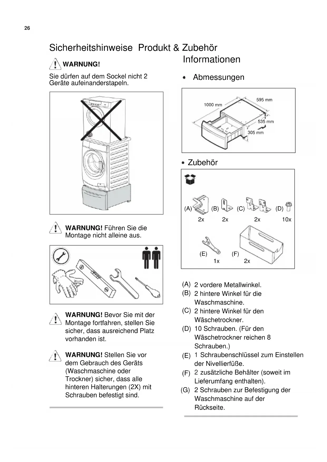WARNUNG! Bevor Sie mit der Montage fortfahren, stellen Sie sicher, dass ausreichend Platz vorhanden ist. WARNUNG! Stellen Sie vor dem Gebrauch des Geräts (Waschmaschine oder Trockner) sicher, dass alle hinteren Halterungen (2X) mit Schrauben befestigt sind.
