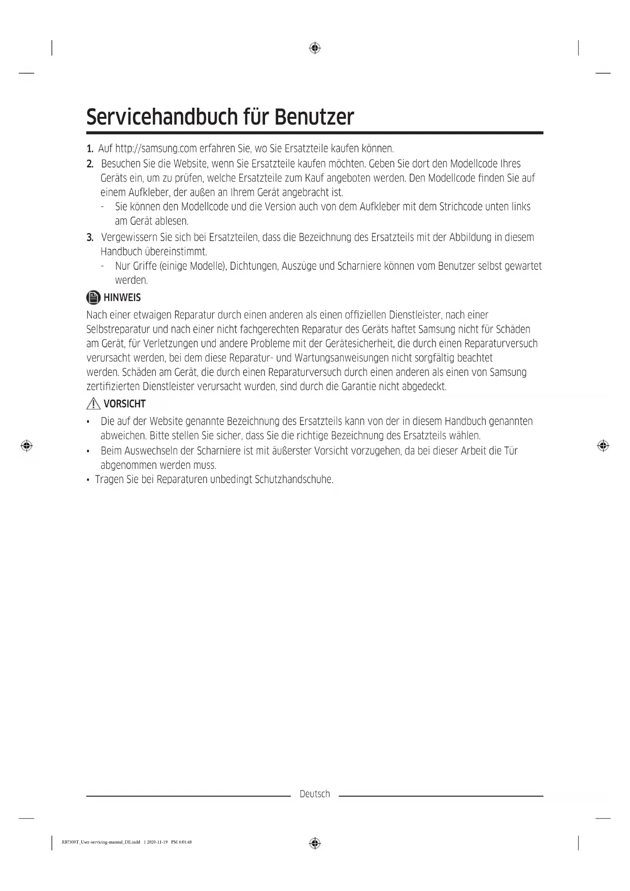- Tragen Sie bei Reparaturen unbedingt Schutzhandschuhe. RB7300T_User-servicing-manual_DE.indd 1 2020-11-19 PM 6:01:48Deutsch Das tatsächliche Aussehen und die mitgelieferten Teile der Kühl-/Gefrierkombination können sich je nach Modell und Land unterscheiden.