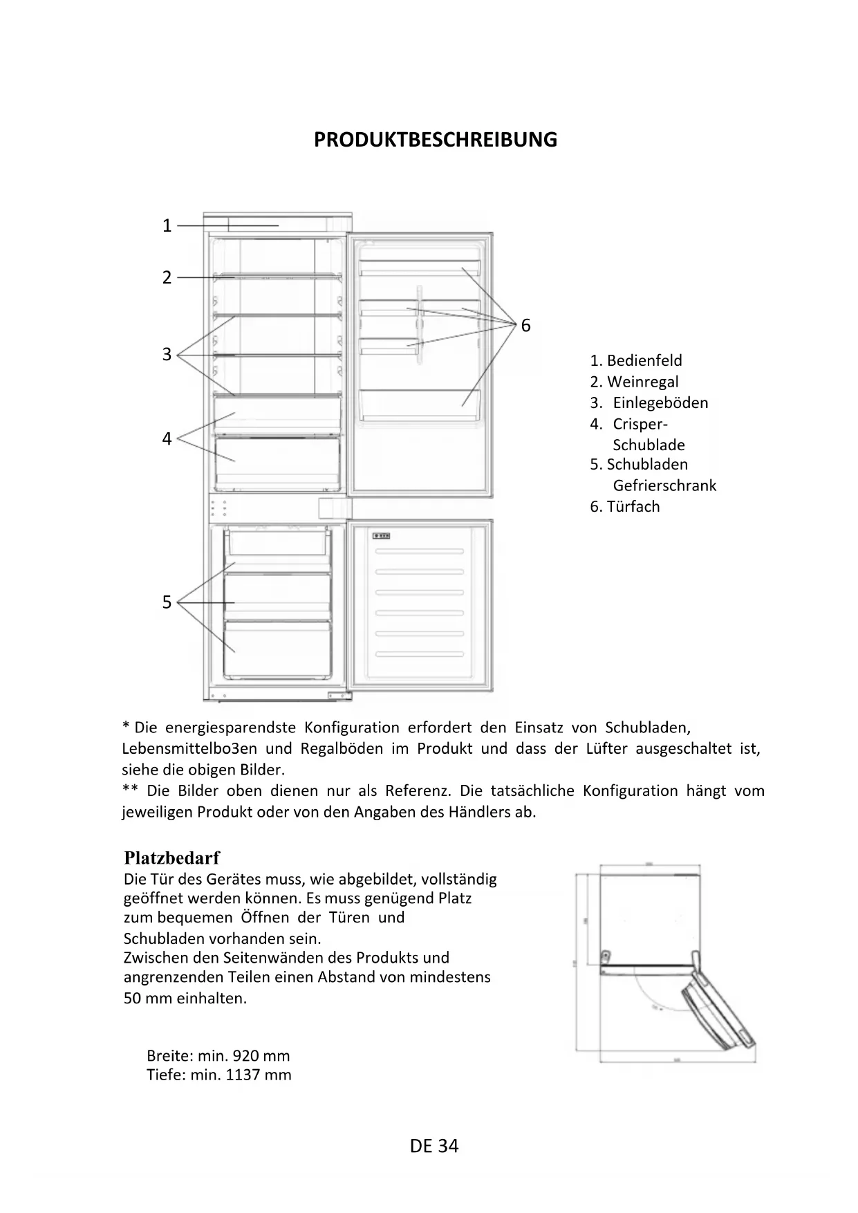 - Die energiesparendste Konfiguration erfordert den Einsatz von Schubladen,Lebensmittelbo3en und Regalböden im Produkt und dass der Lüfter ausgeschaltet ist,siehe die obigen Bilder.** Die Bilder oben dienen nur als Referenz. Die tatsächliche Konfiguration hängt vomjeweiligen Produkt oder von den Angaben des Händlers ab. Platzbedarf Die Tür des Gerätes muss, wie abgebildet, vollständig geöffnet werden können. Es muss genügend Platz zum bequemen Öffnen der Türen und Schubladen vorhanden sein. Zwischen den Seitenwänden des Produkts und angrenzenden Teilen einen Abstand von mindestens 50 mm einhalten.Breite: min. 920 mm Tiefe: min. 1137 mm1. Bedienfeld2. Weinregal