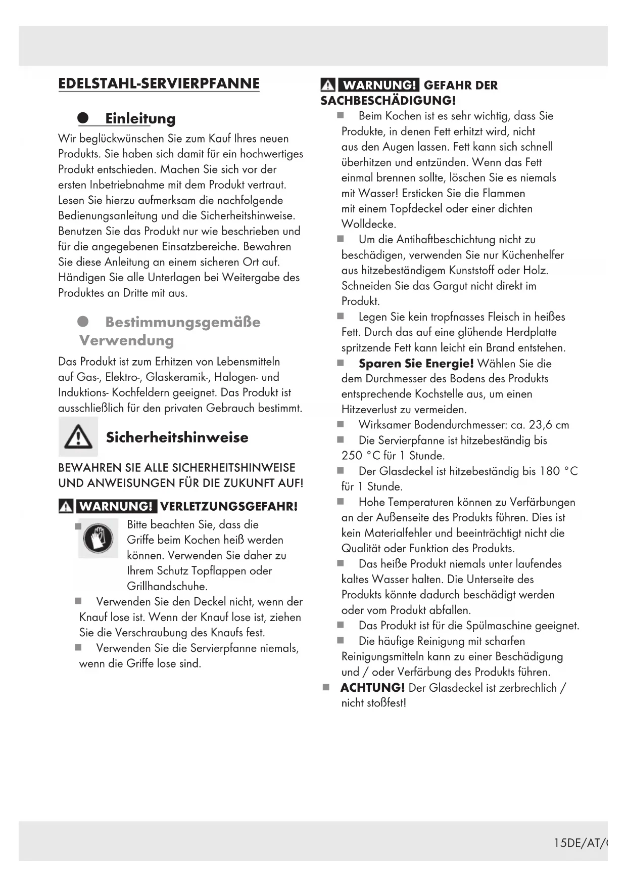 SACHBESCHÄDIGUNG! Beim Kochen ist es sehr wichtig, dass Sie Produkte, in denen Fett erhitzt wird, nicht aus den Augen lassen. Fett kann sich schnell überhitzen und entzünden. Wenn das Fett einmal brennen sollte, löschen Sie es niemals mit Wasser! Ersticken Sie die Flammen mit einem Topfdeckel oder einer dichten Wolldecke. Um die Antihaftbeschichtung nicht zu beschädigen, verwenden Sie nur Küchenhelfer aus hitzebeständigem Kunststoff oder Holz. Schneiden Sie das Gargut nicht direkt im Produkt. Legen Sie kein tropfnasses Fleisch in heißes Fett. Durch das auf eine glühende Herdplatte spritzende Fett kann leicht ein Brand entstehen. Sparen Sie Energie! Wählen Sie die dem Durchmesser des Bodens des Produkts entsprechende Kochstelle aus, um einen Hitzeverlust zu vermeiden. Wirksamer Bodendurchmesser: ca. 23,6cm Die Servierpfanne ist hitzebeständig bis 250°C für 1 Stunde. Der Glasdeckel ist hitzebeständig bis 180°C für 1 Stunde. Hohe Temperaturen können zu Verfärbungen an der Außenseite des Produkts führen. Dies ist kein Materialfehler und beeinträchtigt nicht die Qualität oder Funktion des Produkts. Das heiße Produkt niemals unter laufendes kaltes Wasser halten. Die Unterseite des Produkts könnte dadurch beschädigt werden oder vom Produkt abfallen. Das Produkt ist für die Spülmaschine geeignet. Die häufige Reinigung mit scharfen Reinigungsmitteln kann zu einer Beschädigung und/ oder Verfärbung des Produkts führen. ACHTUNG! Der Glasdeckel ist zerbrechlich/ nicht stoßfest!16 DE/AT/CH Beim Spülen von Hand reinigen Sie das Produkt mit heißem Wasser und handelsüblichem Spülmittel. Vermeiden Sie dabei den Gebrauch von scharfen und spitzen Gegenständen, um das Material nicht zu beschädigen. Ziehen oder schieben Sie das Produkt nicht über die Glaskeramik- und Halogen- Kochfelder. Bei Nichtbeachtung kann es zu Beschädigungen durch Kratzer kommen. Hinweis für Induktionskochfelder Hinweis: Unter bestimmten Umständen kann ein Geräusch auftreten, dass auf die elektro- magnetischen Eigenschaften der Heizquelle und des Produkts zurückzuführen ist. Dies ist normal und deutet nicht auf einen Defekt Ihres Induktionskochfeldes oder des Kochgeschirrs hin. Das Produkt ist mittig auf dem Induktionskochfeld anzuordnen. ACHTUNG! Hohe Aufheizgeschwindigkeit! Kochgeschirr beim Vorheizen nicht überhitzen. Im Fall einer Überhitzung muss der Raum gründlich gelüftet werden. Damit das Produkt einwandfrei funktioniert, stellen Sie es bitte immer auf das Kochfeld, das dem in dieser Anleitung angegebenen effektiven Bodendurchmesser entspricht. Gebrauch Bitte entfernen Sie vor dem ersten Gebrauch eventuelle Aufkleber von dem Produkt und spülen Sie es mit heißem Wasser aus. Kochen Sie das Produkt vor dem ersten Gebrauch 2 bis 3 mal mit Wasser aus, um eventuelle Produktionsrückstände vollständig zu entfernen. Leeres oder mit Bratgut gefülltes Produkt nicht überhitzen, da sonst der Antihafteffekt nachlässt, bzw. die Beschichtung beschädigt wird. Entsorgung Die Verpackung besteht aus umweltfreundlichen Materialien, die Sie über die örtlichen Recyclingstellen entsorgen können. Möglichkeiten zur Entsorgung des ausgedienten Produkts erfahren Sie bei Ihrer Gemeinde- oder Stadtverwaltung. Garantie Das Produkt wurde nach strengen Qualitätsrichtlinien sorgfältig produziert und vor Anlieferung gewissenhaft geprüft. Im Falle von Mängeln dieses Produkts stehen Ihnen gegen den Verkäufer des Produkts gesetzliche Rechte zu. Diese gesetzlichen Rechte werden durch unsere im Folgenden dargestellte Garantie nicht eingeschränkt. Sie erhalten auf dieses Produkt 3 Jahre Garantie ab Kaufdatum. Die Garantiefrist beginnt mit dem Kaufdatum. Bitte bewahren Sie den Original- Kassenbon gut auf. Diese Unterlage wird als Nachweis für den Kauf benötigt. Tritt innerhalb von 3 Jahren ab dem Kaufdatum dieses Produkts ein Material- oder Fabrikationsfehler auf, wird das Produkt von uns – nach unserer Wahl – für Sie kostenlos repariert oder ersetzt. Diese Garantie verfällt, wenn das Produkt beschädigt, nicht sachgemäß benutzt oder gewartet wurde. Die Garantieleistung gilt für Material- oder Fabrikationsfehler. Diese Garantie erstreckt sich nicht auf Produktteile, die normaler Abnutzung ausgesetzt sind (z. B. Batterien) und daher als Verschleißteile angesehen werden können oder Beschädigungen an zerbrechlichen Teilen, z. B. Schalter, Akkus oder die aus Glas gefertigt sind.17DE/AT/CH Abwicklung im Garantiefall Um eine schnelle Bearbeitung Ihres Anliegens zu gewährleisten, folgen Sie bitte den folgenden Hinweisen: Bitte halten Sie für alle Anfragen den Kassenbon und die Artikelnummer (z. B. IAN 123456_7890) als Nachweis für den Kauf bereit. Die Artikelnummer entnehmen Sie bitte dem Typenschild, einer Gravur, auf dem Titelblatt Ihrer Bedienungsanleitung (unten links) oder als Aufkleber auf der Rück- oder Unterseite des Produkts. Sollten Funktionsfehler oder sonstige Mängel auftreten, kontaktieren Sie zunächst die nachfolgend benannte Serviceabteilung telefonisch oder per E-Mail. Ein als defekt erfasstes Produkt können Sie dann unter Beifügung des Kaufbelegs (Kassenbon) und der Angabe, worin der Mangel besteht und wann er aufgetreten ist, für Sie portofrei an die Ihnen mitgeteilte Service-Anschrift übersenden. Service Service Deutschland Tel.: 0800 5435 111 E-Mail: owim@lidl.de Service Österreich Tel.: 0800 292726 E-Mail: owim@lidl.at Service Schweiz Tel.: 0800562153 E-Mail: owim@lidl.chIAN 364981_2101 IAN Model No. Product size Effective bottom size Version 364981_2101 HG06433 Ø 280 mm Ø 236 mm 08/2021 OWIM GmbH & Co. KG Stiftsbergstraße 1 74167 Neckarsulm GERMANY Model No.: HG06433 Version: 08/2021