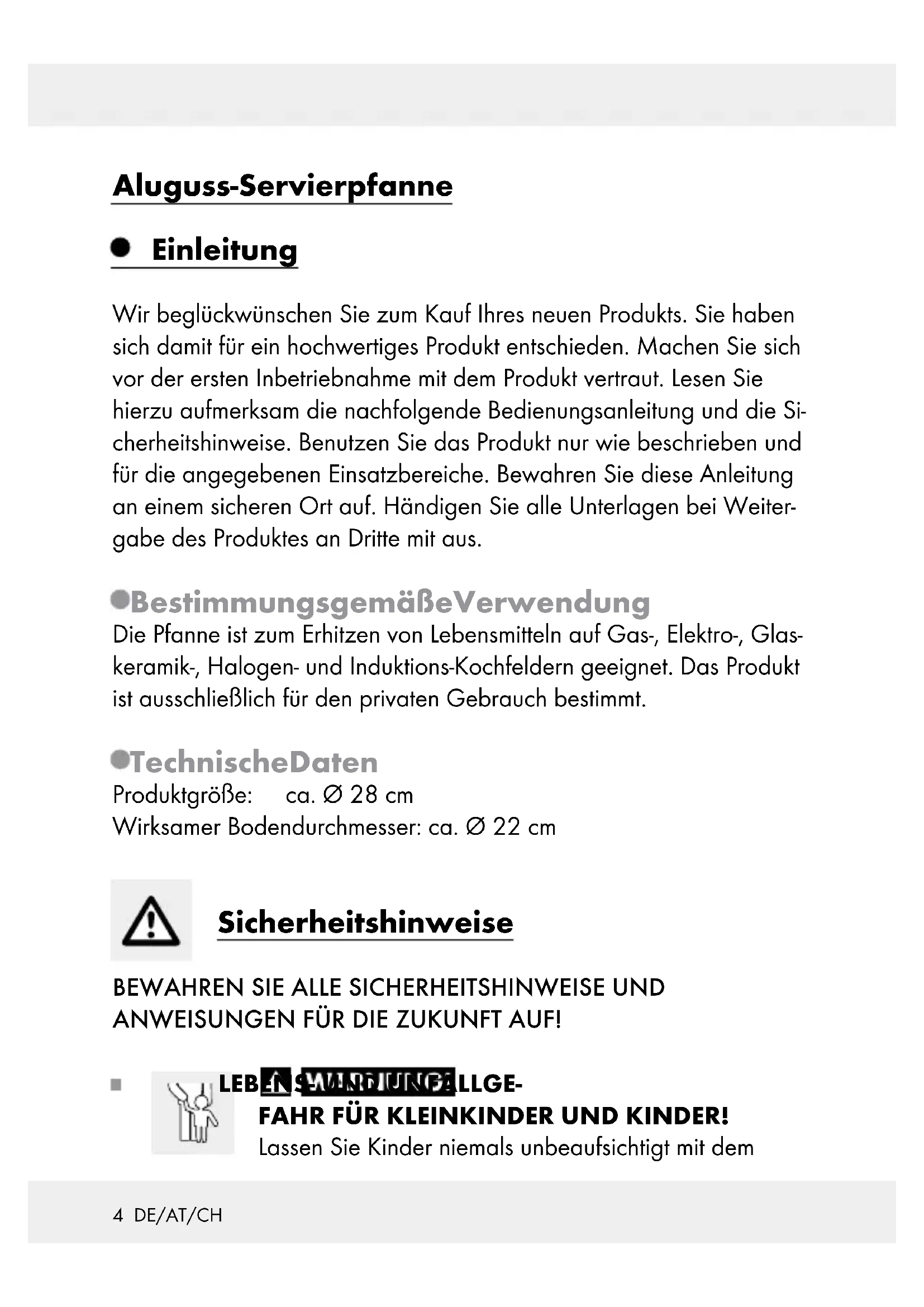 Pokyny pro obsluhu a bezpečnostní pokyny IAN 344016_2004DE / AT / CH Bedienungs- und Sicherheitshinweise Seite 3 GB / IE Operation and safety notes Page 10 FR / BE Instructions d‘utilisation et consignes de sécurité Page 17 NL / BE Bedienings- en veiligheidsinstructies Pagina 26 PL Wskazówki dotyczące obsługi i bezpieczeństwa Strona 33 CZ Pokyny pro obsluhu a bezpečnostní pokyny Strana 40 SK Pokyny pre obsluhu a bezpečnostné pokyny Strana 463 DE/AT/CH Einleitung ............................................................................. Seite 4 Bestimmungsgemäße Verwendung ........................................ Seite 4 Technische Daten .................................................................... Seite 4 Sicherheitshinweise .................................................... Seite 4 Hinweis für Induktionskochfelder ................. Seite 6 Gebrauch ............................................................................. Seite 7 Entsorgung ......................................................................... Seite 7 Garantie ............................................................................... Seite 8 Abwicklung im Garantiefall .................................................... Seite 9 Service ..................................................................................... Seite 94 DE/AT/CH Aluguss-Servierpfanne Einleitung Wir beglückwünschen Sie zum Kauf Ihres neuen Produkts. Sie haben sich damit für ein hochwertiges Produkt entschieden. Machen Sie sich vor der ersten Inbetriebnahme mit dem Produkt vertraut. Lesen Sie hierzu aufmerksam die nachfolgende Bedienungsanleitung und die Si- cherheitshinweise. Benutzen Sie das Produkt nur wie beschrieben und für die angegebenen Einsatzbereiche. Bewahren Sie diese Anleitung an einem sicheren Ort auf. Händigen Sie alle Unterlagen bei Weiter- gabe des Produktes an Dritte mit aus. Bestimmungsgemäße Verwendung Die Pfanne ist zum Erhitzen von Lebensmitteln auf Gas-, Elektro-, Glas- keramik-, Halogen- und Induktions-Kochfeldern geeignet. Das Produkt ist ausschließlich für den privaten Gebrauch bestimmt. Technische Daten Produktgröße: ca. Ø 28 cm Wirksamer Bodendurchmesser: ca. Ø 22 cm Sicherheitshinweise