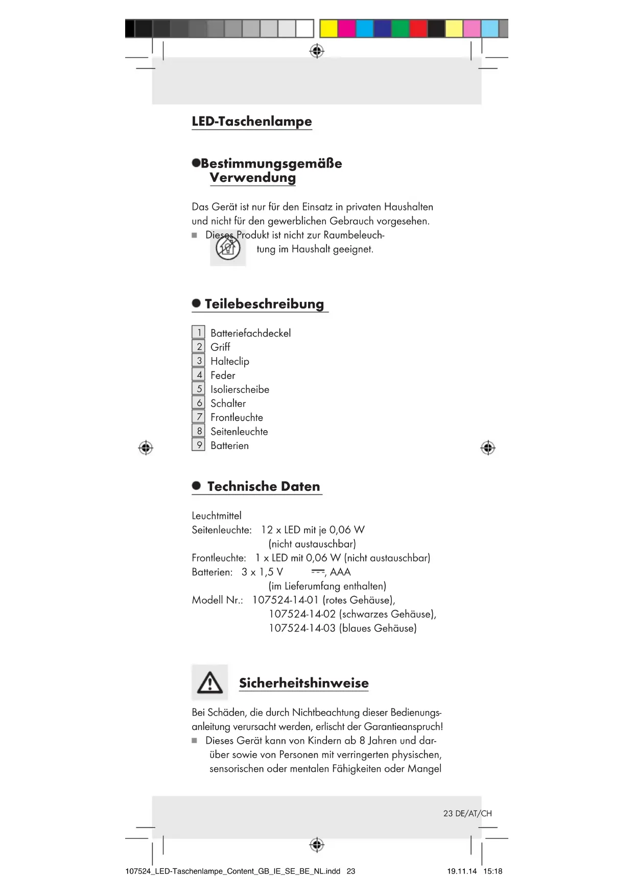 Batterien Technische Daten Leuchtmittel Seitenleuchte: 12 x LED mit je 0,06 W (nicht austauschbar) Frontleuchte: 1 x LED mit 0,06 W (nicht austauschbar) Batterien: 3 x 1,5 V , AAA (im Lieferumfang enthalten) Modell Nr.: 107524-14-01 (rotes Gehäuse), 107524-14-02 (schwarzes Gehäuse), 107524-14-03 (blaues Gehäuse) Sicherheitshinweise Bei Schäden, die durch Nichtbeachtung dieser Bedienungs- anleitung verursacht werden, erlischt der Garantieanspruch! Dieses Gerät kann von Kindern ab 8 Jahren und dar- über sowie von Personen mit verringerten physischen, sensorischen oder mentalen Fähigkeiten oder Mangel 107524_LED-Taschenlampe_Content_GB_IE_SE_BE_NL.indd 23 19.11.14 15:1824 DE/AT/CH an Erfahrung und Wissen benutzt werden, wenn sie beaufsichtigt oder bezüglich des sicheren Gebrauchs des Gerätes unterwiesen wurden und die daraus resultierenden Gefahren verstehen. Kinder dürfen nicht mit dem Gerät spielen. Reinigung und Benutzer- wartung dürfen nicht von Kindern ohne Beaufsichtigung durchgeführt werden. Nehmen Sie das Gerät nicht in Betrieb, wenn es beschädigt ist. Schützen Sie das Gerät vor Nässe und Feuchtigkeit. Niemals in Wasser oder andere Flüssigkeiten tauchen! Sicherheitshinweise zu Batterien LEBENSGEFAHR! Batterien können verschluckt werden, was lebensgefährlich sein kann. Ist eine Batterie verschluckt worden, muss sofort medizinische Hilfe in Anspruch genommen werden. Entfernen Sie die Batterien, wenn sie längere Zeit nicht verwendet worden sind, aus dem Gerät. VORSICHT! EXPLOSIONSGEFAHR! Laden Sie Batterien niemals wieder auf! Reinigen Sie Batterie- und Gerätekontakt vor dem Einlegen falls erforderlich. Entfernen Sie erschöpfte Batterien umgehend aus dem Gerät. Es besteht erhöhte Auslaufgefahr! Halten Sie Batterien von Kindern fern, werfen Sie Batterien nicht ins Feuer, schließen Sie Batterien nicht kurz und nehmen Sie sie nicht auseinander. Bei Nichtbeachtung der Hinweise können die Batterien über ihre Endspannung hinaus entladen werden. Es besteht dann die Gefahr des Auslaufens. Falls die Batterien in Ihrem Gerät ausgelaufen sein sollten, entnehmen Sie diese sofort, um Schäden am Gerät vorzubeugen! Vermeiden Sie den Kontakt mit Haut, Augen und Schleimhäuten. Bei Kontakt mit Batteriesäure spülen Sie die betroffene Stelle mit reichlich Wasser ab und / oder suchen Sie einen Arzt auf! Wechseln Sie immer alle Batterien gleichzeitig aus und setzen Sie nur Batterien des gleichen Typs ein. 107524_LED-Taschenlampe_Content_GB_IE_SE_BE_NL.indd 24 19.11.14 15:1825 DE/AT/CH Vor der Inbetriebnahme Drehen Sie den Batteriefachdeckel