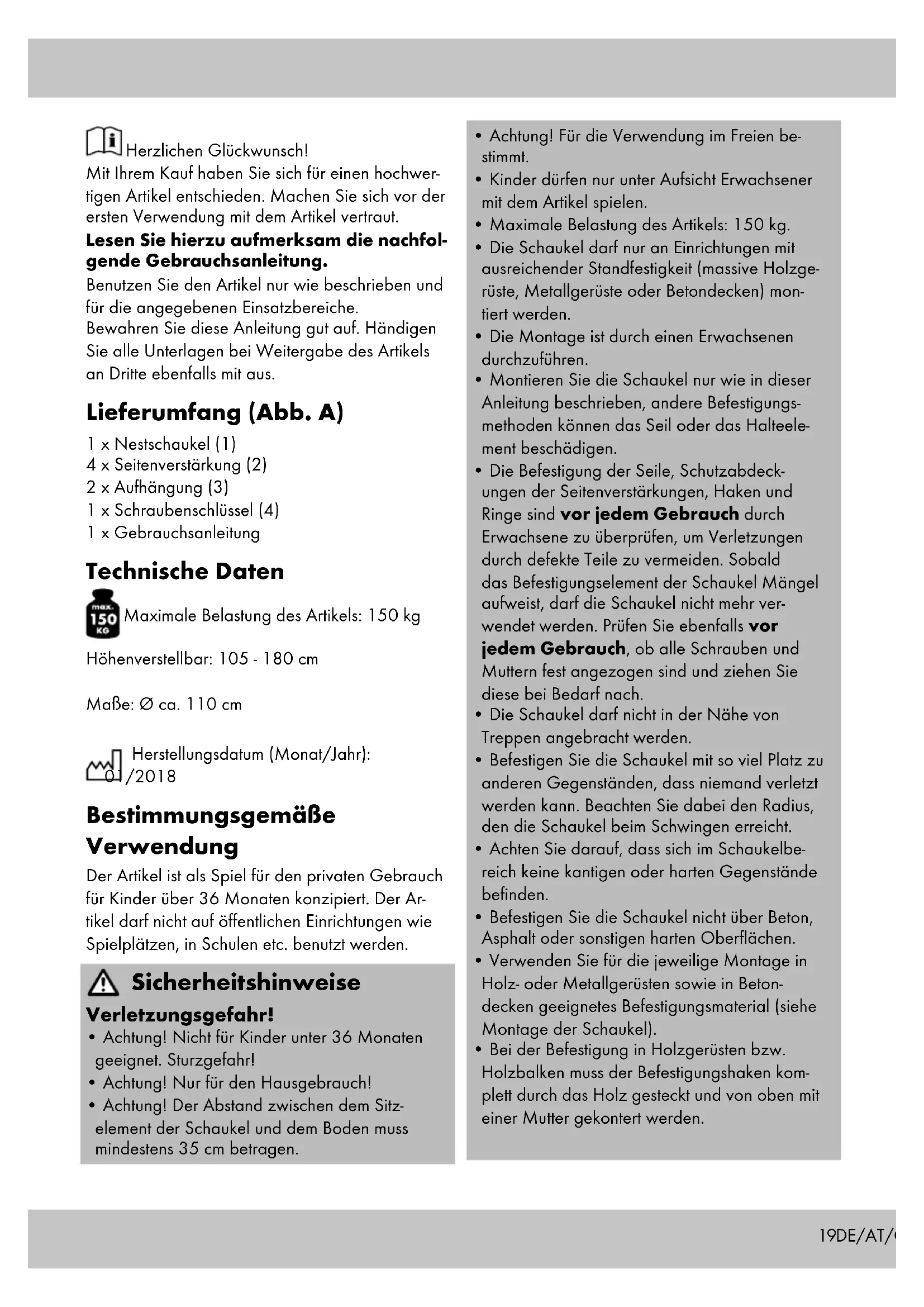 - Bei der Befestigung in Holzgerüsten bzw. Holzbalken muss der Befestigungshaken kom- plett durch das Holz gesteckt und von oben mit einer Mutter gekontert werden. Herzlichen Glückwunsch! Mit Ihrem Kauf haben Sie sich für einen hochwer- tigen Artikel entschieden. Machen Sie sich vor der ersten Verwendung mit dem Artikel vertraut. Lesen Sie hierzu aufmerksam die nachfol- gende Gebrauchsanleitung. Benutzen Sie den Artikel nur wie beschrieben und für die angegebenen Einsatzbereiche. Bewahren Sie diese Anleitung gut auf. Händigen Sie alle Unterlagen bei Weitergabe des Artikels an Dritte ebenfalls mit aus. Lieferumfang (Abb. A) 1 x Nestschaukel (1) 4 x Seitenverstärkung (2) 2 x Aufhängung (3) 1 x Schraubenschlüssel (4) 1 x Gebrauchsanleitung Technische Daten Maximale Belastung des Artikels: 150 kg Höhenverstellbar: 105 - 180 cm Maße: Ø ca. 110 cm Herstellungsdatum (Monat/Jahr): 01/2018 Bestimmungsgemäße Verwendung Der Artikel ist als Spiel für den privaten Gebrauch für Kinder über 36 Monaten konzipiert. Der Ar- tikel darf nicht auf öffentlichen Einrichtungen wie Spielplätzen, in Schulen etc. benutzt werden. Sicherheitshinweise Verletzungsgefahr!