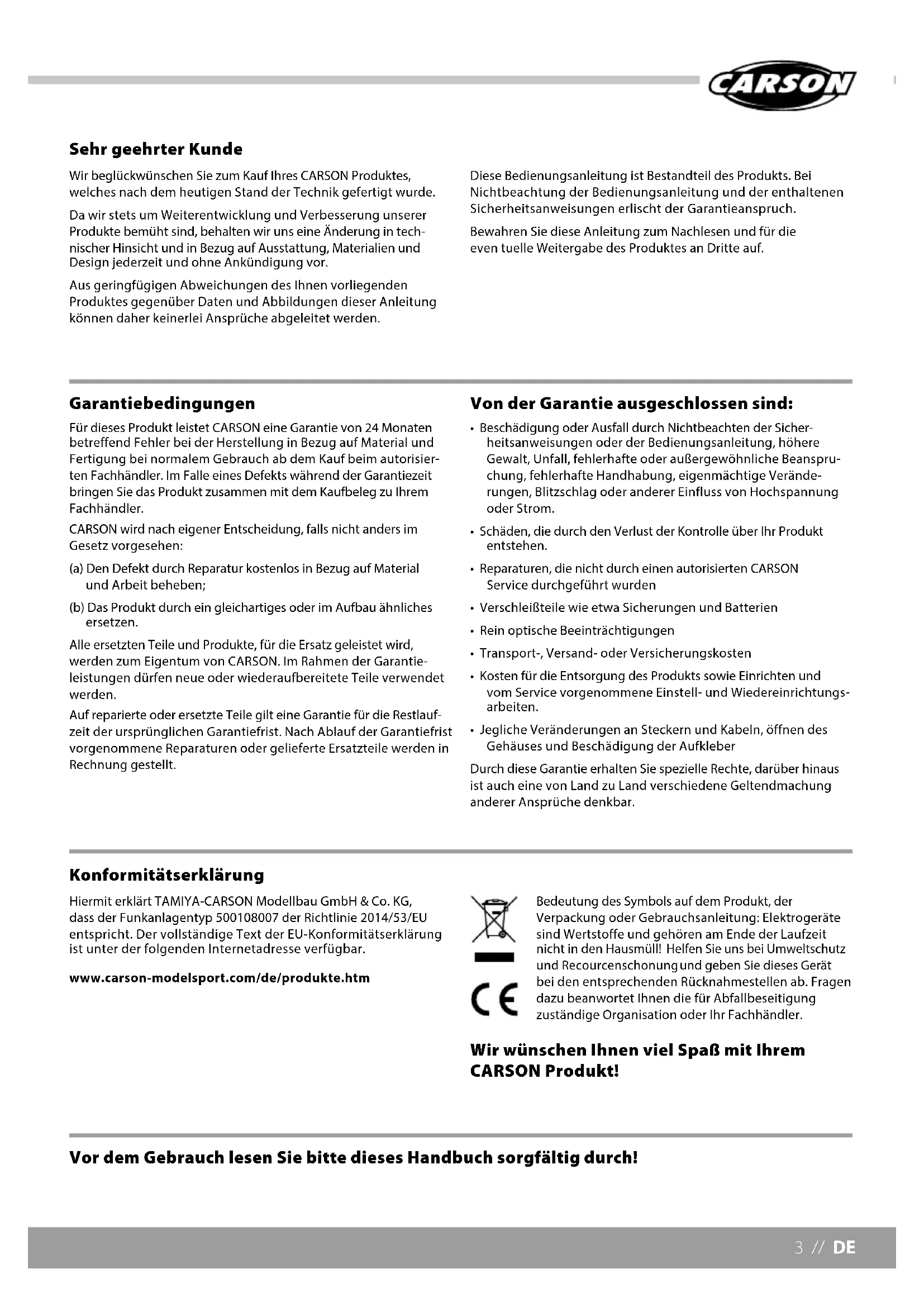 DE // Wichtiger Hinweis GB // Important information FR // Remarque importante IT // Nota importante ES // Nota importante NL // Belangrijke aanwijzing Bitte überprüfen sie vor der ersten Inbetriebnahme ihres Produktes oder vor jeder Ersatzteilbestellung, ob sich ihr Handbuch auf dem aktuellsten Stand befindet. Dieses Handbuch enthält die technischen Anlagen, wichtige Anleitungen zur korrekten Inbetriebnahme und Nutzung sowie Produktinformation entsprechend dem aktuellen Stand vor der Drucklegung. Der Inhalt dieses Handbuchs und die technischen Daten des Produkts können ohne vorherige Ankündigung geändert werden. Den aktuellsten Stand ihres Handbuches finden sie unter: www.carson-modelsport.com Before using your product for the first time or ordering any spare parts, check that your manual is fully up-to-date. This manual contains the technical appendices, important instructions for correct start-up and use and product information, all fully up-to- date before going to press. The contents of this manual and the technical data of the product can change without prior notice. For the latest version of your manual, see: www.carson-modelsport.com Avant de mettre en service le produit ou de commander des pièces détachées, assurez-vous que vous possédez bien la dernière version du manuel. Ce manuel contient des indications techniques, des instructions importantes pour bien mettre en service et utiliser l’appareil, ainsi que des informations sur le produit correspondant à l’état des connaissances à la date d’impression. Le contenu du manuel et les caractéristiques techniques du produit peuvent être modifiées sans annonce préalable. Vous trouverez la version actuelle du manuel à l’adresse suivante: www.carson-modelsport.com Prima della prima messa in funzione del prodotto o prima di ogni ordinazione di ricambi verificare se il manuale a disposizione corrisponde alla versione più recente. Il presente manuale contiene gli allegati tecnici, le istruzioni importanti per la corretta messa in funzione e il corretto utilizzo, nonché le informazioni sul prodotto che corrispondono allo stato attuale prima della stampa. Il contenuto del presente manuale e i dati tecnici del prodotto possono essere modificati senza preavviso. La versione più aggiornata del presente manuale è disponibile al seguente link: www.carson-modelsport.com Antes de la primera puesta en funcionamiento de su producto y cada vez que solicite piezas de recambio compruebe que su manual se encuentra actualizado. Este manual contiene datos técnicos, instrucciones importantes para una puesta en funcionamiento adecuada y el uso así como información del producto conforme al estado más actual antes de la impresión. El contenido de este manual y los datos técnicos del producto pueden modificarse sin previo aviso. Encontrará la versión actualizada del manual en: www.carson-modelsport.com Controleer voor de eerste ingebruikneming van uw product of voor elke bestelling van vervangende onderdelen of uw handboek up-to-date is. Dit handboek bevat de technische bijlagen, belangrijke aanwijzingen voor de juiste inbedrijfstelling en het gebruik, alsmede productie-informatie volgens de actuele stand voor het ter perse gaan. De inhoud van dit handboek en de technische productspecificaties kunnen zonder voorafgaande aankondiging worden gewijzigd. De meest actuele stand van uw handboek is te vinden onder: www.carson-modelsport.com3 // DE Sehr geehrter Kunde Wir beglückwünschen Sie zum Kauf Ihres CARSON Produktes, welches nach dem heutigen Stand der Technik gefertigt wurde. Da wir stets um Weiterentwicklung und Verbesserung unserer Produkte bemüht sind, behalten wir uns eine Änderung in tech- nischer Hinsicht und in Bezug auf Ausstattung, Materialien und Design jederzeit und ohne Ankündigung vor. Aus geringfügigen Abweichungen des Ihnen vorliegenden Produktes gegenüber Daten und Abbildungen dieser Anleitung können daher keinerlei Ansprüche abgeleitet werden. Diese Bedienungsanleitung ist Bestandteil des Produkts. Bei Nichtbeachtung der Bedienungsanleitung und der enthaltenen Sicherheitsanweisungen erlischt der Garantieanspruch. Bewahren Sie diese Anleitung zum Nachlesen und für die even tuelle Weitergabe des Produktes an Dritte auf. Garantiebedingungen Für dieses Produkt leistet CARSON eine Garantie von 24 Monaten betreffend Fehler bei der Herstellung in Bezug auf Material und Fertigung bei normalem Gebrauch ab dem Kauf beim autorisier- ten Fachhändler. Im Falle eines Defekts während der Garantiezeit bringen Sie das Produkt zusammen mit dem Kaufbeleg zu Ihrem Fachhändler. CARSON wird nach eigener Entscheidung, falls nicht anders im Gesetz vorgesehen: (a) Den Defekt durch Reparatur kostenlos in Bezug auf Material und Arbeit beheben; (b) Das Produkt durch ein gleichartiges oder im Aufbau ähnliches ersetzen. Alle ersetzten Teile und Produkte, für die Ersatz geleistet wird, werden zum Eigentum von CARSON. Im Rahmen der Garantie- leistungen dürfen neue oder wiederaufbereitete Teile verwendet werden. Auf reparierte oder ersetzte Teile gilt eine Garantie für die Restlauf- zeit der ursprünglichen Garantiefrist. Nach Ablauf der Garantiefrist vorgenommene Reparaturen oder gelieferte Ersatzteile werden in Rechnung gestellt. Von der Garantie ausgeschlossen sind: