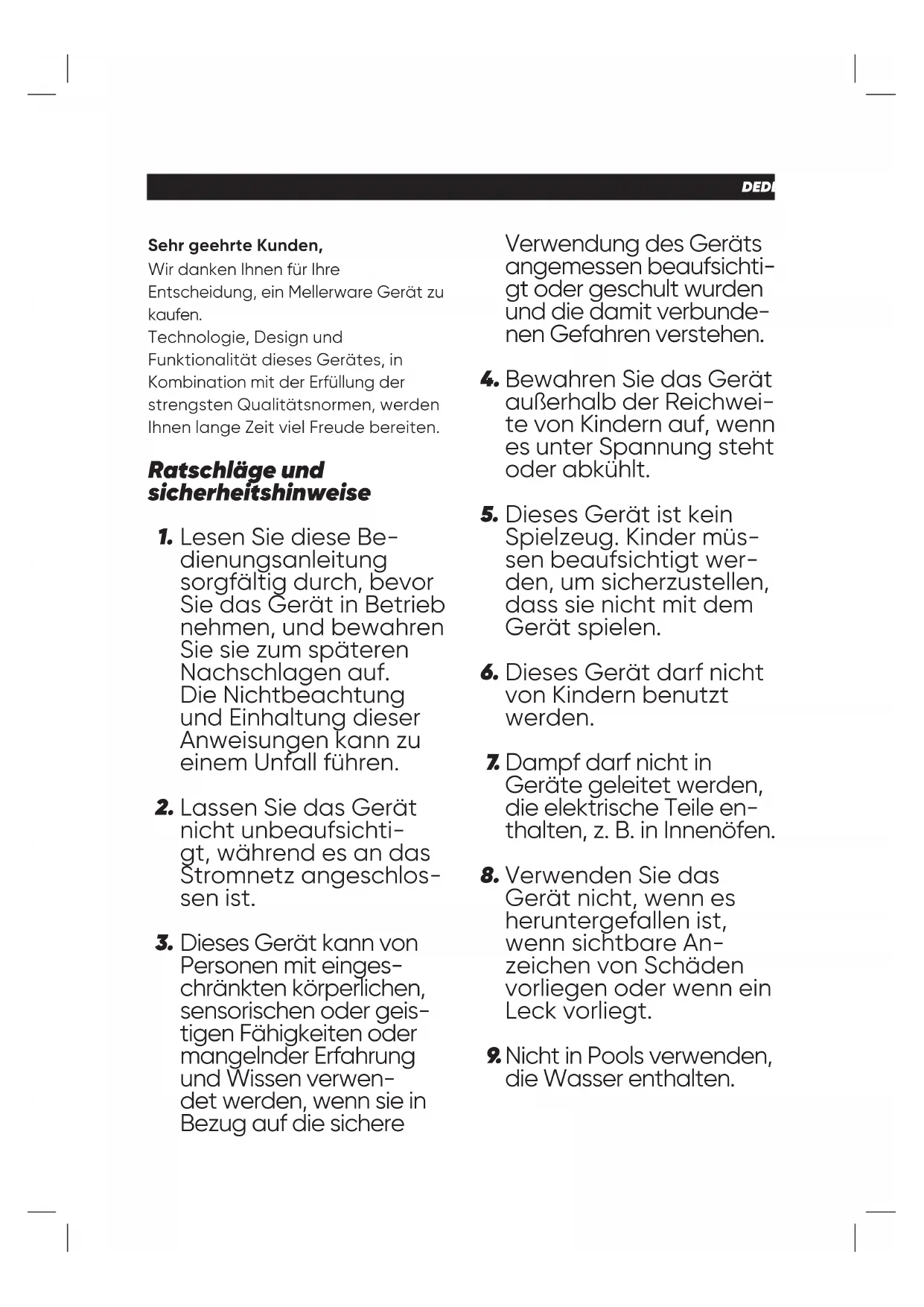 –ES DEDEUTSCH Sehr geehrte Kunden, Wir danken Ihnen für Ihre Entscheidung, ein Mellerware Gerät zu kaufen. Technologie, Design und Funktionalität dieses Gerätes, in Kombination mit der Erfüllung der strengsten Qualitätsnormen, werden Ihnen lange Zeit viel Freude bereiten. Lesen Sie diese Be- dienungsanleitung sorgfältig durch, bevor Sie das Gerät in Betrieb nehmen, und bewahren Sie sie zum späteren Nachschlagen auf. Die Nichtbeachtung und Einhaltung dieser Anweisungen kann zu einem Unfall führen. Lassen Sie das Gerät nicht unbeaufsichti- gt, während es an das Stromnetz angeschlos- sen ist. Dieses Gerät kann von Personen mit einges- chränkten körperlichen, sensorischen oder geis- tigen Fähigkeiten oder mangelnder Erfahrung und Wissen verwen- det werden, wenn sie in Bezug auf die sichere Ratschläge und sicherheitshinweise Verwendung des Geräts angemessen beaufsichti- gt oder geschult wurden und die damit verbunde- nen Gefahren verstehen. Bewahren Sie das Gerät außerhalb der Reichwei- te von Kindern auf, wenn es unter Spannung steht oder abkühlt. Dieses Gerät ist kein Spielzeug. Kinder müs- sen beaufsichtigt wer- den, um sicherzustellen, dass sie nicht mit dem Gerät spielen. Dieses Gerät darf nicht von Kindern benutzt werden. Dampf darf nicht in Geräte geleitet werden, die elektrische Teile en- thalten, z. B. in Innenöfen. Verwenden Sie das Gerät nicht, wenn es heruntergefallen ist, wenn sichtbare An- zeichen von Schäden vorliegen oder wenn ein Leck vorliegt. Nicht in Pools verwenden, die Wasser enthalten.