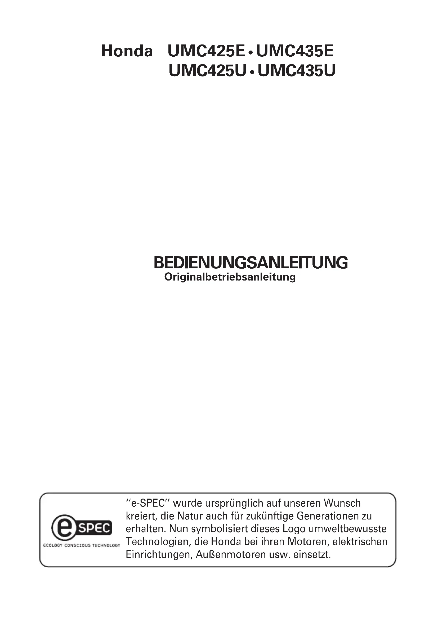 - UMC435U BEDIENUNGSANLEITUNG Originalbetriebsanleitung ‘‘e-SPEC’’ wurde ursprünglich auf unseren Wunsch kreiert, die Natur auch für zukünftige Generationen zu erhalten. Nun symbolisiert dieses Logo umweltbewusste Technologien, die Honda bei ihren Motoren, elektrischen Einrichtungen, Außenmotoren usw. einsetzt. 34VP8600.book Page -1 Tuesday, November 6, 2012 8:49 AMEINFÜHRUNG Vielen Dank für den Kauf dieses Honda-Antriebskopfs. An die Honda-Antriebsköpfe UMC425E, UMC435E, UMC425U und UMC435U lassen sich verschiedene von Honda zugelassene Anbaugeräte anbringen, um so unterschiedliche Arbeiten ausführen zu können. Dieses Handbuch stellt Angaben zu Betrieb und Wartung folgender Honda- Antriebsköpfe bereit: UMC425E