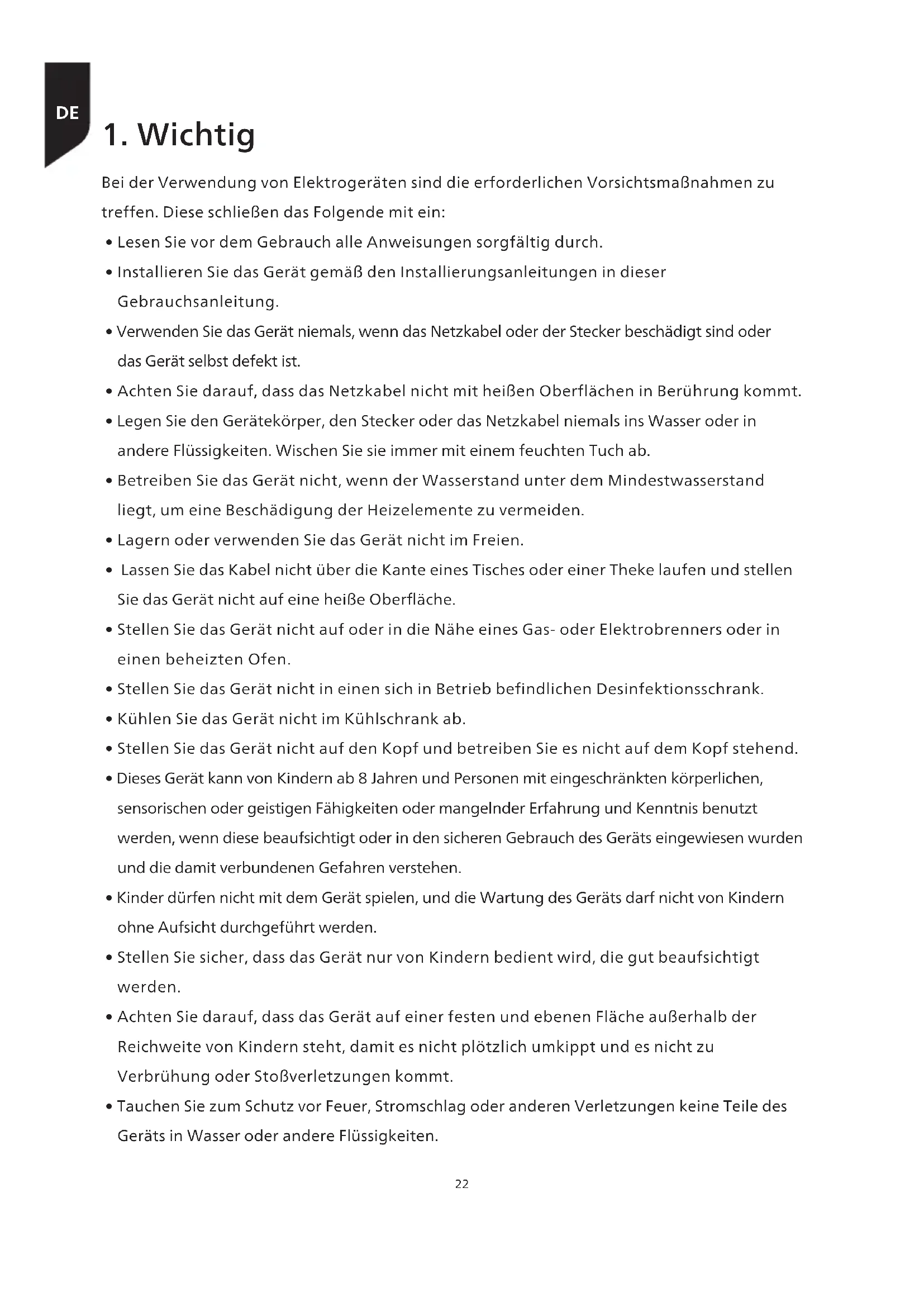 DE• Berühren Sie nicht die heiße Oberfläche oder den Wasserauslauf, wenn das Gerät in Betrieb ist.
