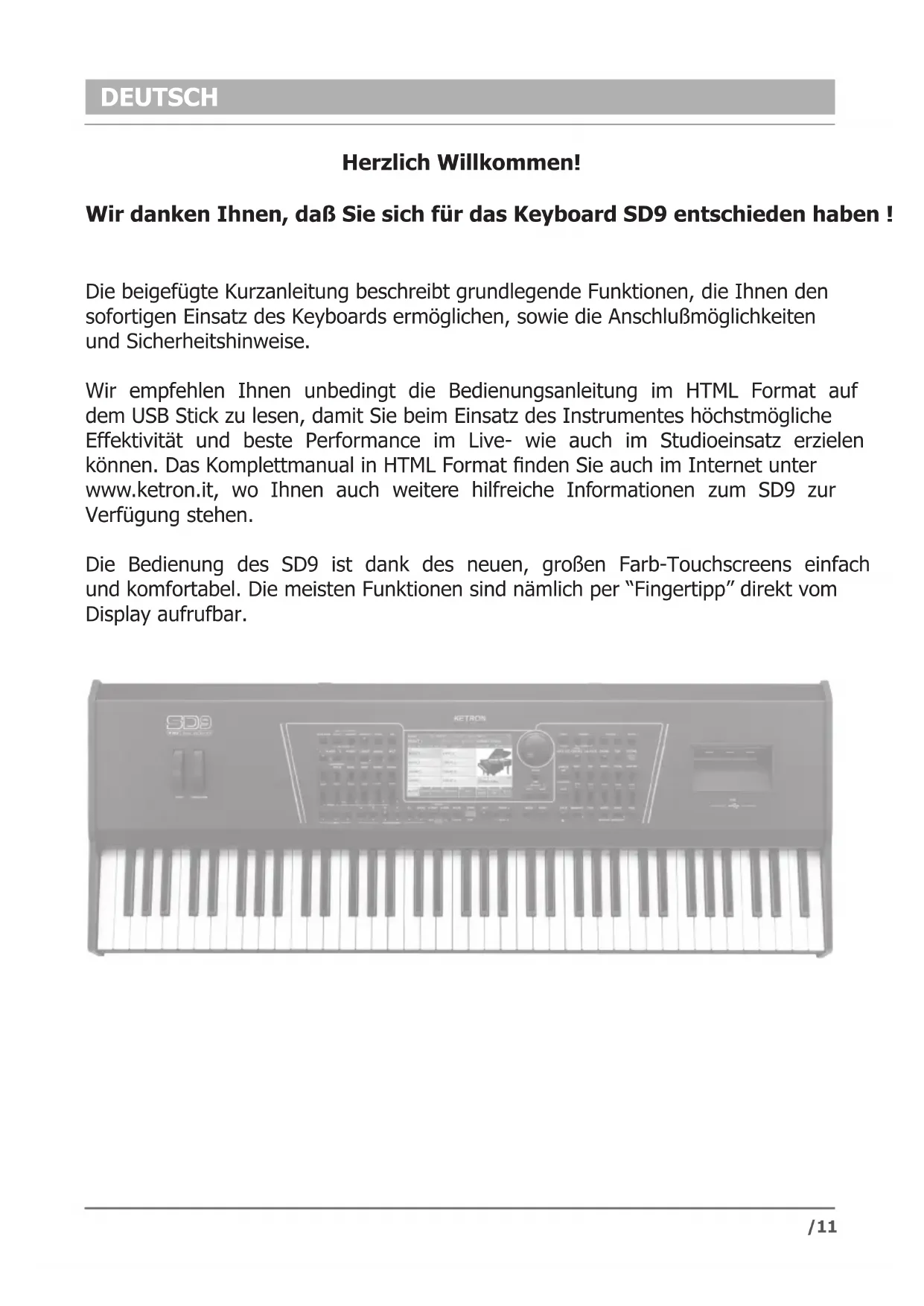 “ Die äußeren Oberächen des Geräts dürfen nur mit einem weichen, trockenen Tuch gereinigt werden. Verwenden Sie niemals Benzin, Verdünner oder Lösungsmittel im Allgemeinen. ANDERE VORSICHTSMASSNAHMEN Wenn Sie das Gerät im Ausland verwenden wollen und Zweifel hinsichtlich der Versorgung haben, wenden Sie sich im Vorfeld an einen qualizierten Techniker. Das Gerät darf keinen starken Erschütterungen ausgesetzt werden. ADAPTER Um das Gerät an eine Steckdose anzuschließen, verwenden Sie ausschließlich den mitgelieferten KETRON-Adapter. Der Einsatz anderer Adapter könnte die Versorgungskreise des Geräts beschädigen. Es ist daher von grundlegender Wichtigkeit, Original-Adapter zu verwenden und den richtigen Adaptertyp im Bedarfsfall nachzubestellen./13 BENUTZERINFORMATION “UmsetzungderEuropäischenRichtlinien2002/95/EG,2002/96/EGund2003/108/EGzurBeschränkungderVerwendung bestimmtergefährlicherStoffeinElektro-undElektronikgerätensowieüberElektro-undElektronik-Altgeräte.” Das Symbol der durchgestrichenen Mülltonne auf dem Gerät oder dessen Verpackung weist darauf hin, dass das Produkt am Ende seines Lebenszyklus einer getrennten Abfallentsorgung zuzuführen ist. Der Benutzer muss daher das Gerät bei den entsprechenden Sammelstellen für Elektro- und Elektronik-Altgeräte abgeben oder beim Kauf eines neuen gleichartigen Geräts dem Händler zurückzugeben. Die getrennte Sammlung der Altgeräte trägt im Hinblick auf deren Recycling, Aufbereitung und umweltverträgliche Entsorgung dazu bei, negative Auswirkungen auf die Umwelt und menschliche Gesundheit zu vermeiden, und fördert die Verwertung bzw. das Recycling der Materialien, aus denen sich das Gerät zusammensetzt. Die nicht rechtmäßige Entsorgung des Produkts unterliegt den von den geltenden Gesetzen vorgesehenen Verwaltungsstrafen. Dieses Symbol bedeutet, dass dieses Produkt in EU-Ländern getrennt vom Hausmüll gesammelt werden muss gemäß den regionalen Bestimmungen. Mit diesem Symbol gekennzeichnete Produkte dürfen nicht zusammen mit den Hausmüll entsorgt werden./14 DC 9 V 4A Netzteilbuchse Verwenden Sie ausschließlich das mit dem Gerät gelieferte Netzteil. Output: 9 V, 4 A. ON/OFF Ein/Aus-Taster Das Hochfahren kann bis zu 30 Sekunden dauern. Zum Herunterfahren drücken Sie den EIN/AUS-Taster und warten dann, bis das Gerät ausgeschaltet wird. Dieser Vorgang kann bis zu 10 Sekunden dauern. SUSTAIN PEDAL Jackbuchse für den Anschluss eines Sustain-Pedals (optional). VOLUME PEDAL Stereo-Klinkenbuchse für den Anschluss eines Volumenpedals (optional). VIDEO DVI DVI-Buchse für den Anschluss an einen externen Monitor. USB DEVICE USB-Anschluss für Computer oder andere Geräte, die mit denen der SD9 extern gesteuert werden kann. FOOTSWITCH Mehrpolige Standard-Buchse für den Anschluss eines optionalen Fußschalters zur Steuerung bestimmter residenter Funktionen. Mit Ketron FS6/FS13 kompatibel. MIDI Buchsen für MIDI IN1 (GM), MIDI IN 2 (Key) -, MIDI OUT- und MIDI THRU-Anschlüsse. MAIN OUT Mono-Klinkenbuchsen für den allgemeinen Ausgang zum Anschluss an eine PA- bzw. STEREO-Anlage: links (Left Mono), rechts (Right Mono). Wir empfehlen Ihnen, den Stereo-Anschluss für eine bessere Wiedergabe des Geräts und der Effekte zu verwenden. Der eventuelle Mono-Anschluss (d.h. die alleinige Verwendung des Left- oder Right-Ausgangs) führt zu einer minderwertigeren Wiedergabequalität und wird den Merkmalen von Sounds und EFX nicht gerecht. HEADPHONE (Aux) SWird hier ein Kopfhörer (oder eine Jackbuchse für andere Zwecke) angeschlossen, so werden die internen Aux trennen Out Assign. MICRO 1 IN Mono-XLR/Klinkenbuchse für den Anschluss eines dynamischen Mikrofons. MICRO 1 GAIN Potentiometer für die Regelung der Verstärkung des Eingangssignals an der Micro 1-Buchse. MICRO 1 OUT Mono-Klinkenbuchse für den Micro 1 -Ausgang. INPUT Mono-Jackbuchse für den Anschluss eines zusätzlichen Instruments (Keyboard, Expander), eine Gitarre oder eines dynamischen Mikrofons. Auf der rechten Seite des Geräts ndet 3 USB Host-Buchsen für den Anschluss von externen USB-Geräten wie Stick, externe Festplatte usw. ANSCHLÜSSE/15 FRANÇAIS Bienvenus! Merci d’avoir acheté Ketron SD9 Multimedia Player! En ce “Manuel d’instructions” on a décrit les opérations principales pour un emploie immédiat du player multimédia. Nous vous prions de lire attentivement ce manuel d’instructions pour obtenir le rendement max. et des performances élevées pendant son utilisation en direct et en studio. Le même manuel en html est disponible également sur le site web www.ketron. it où vous pourrez trouver aussi d’autres informations et utilitaires relatifs au SD9. SD9 révolutionne complètement la manière d’utilisation grâce au nouvel et grand afcheur tactile. En effet la plupart des fonctions est accessible par un “coup de doigt” directement sur l’écran, en correspondance des touches intéressées./16