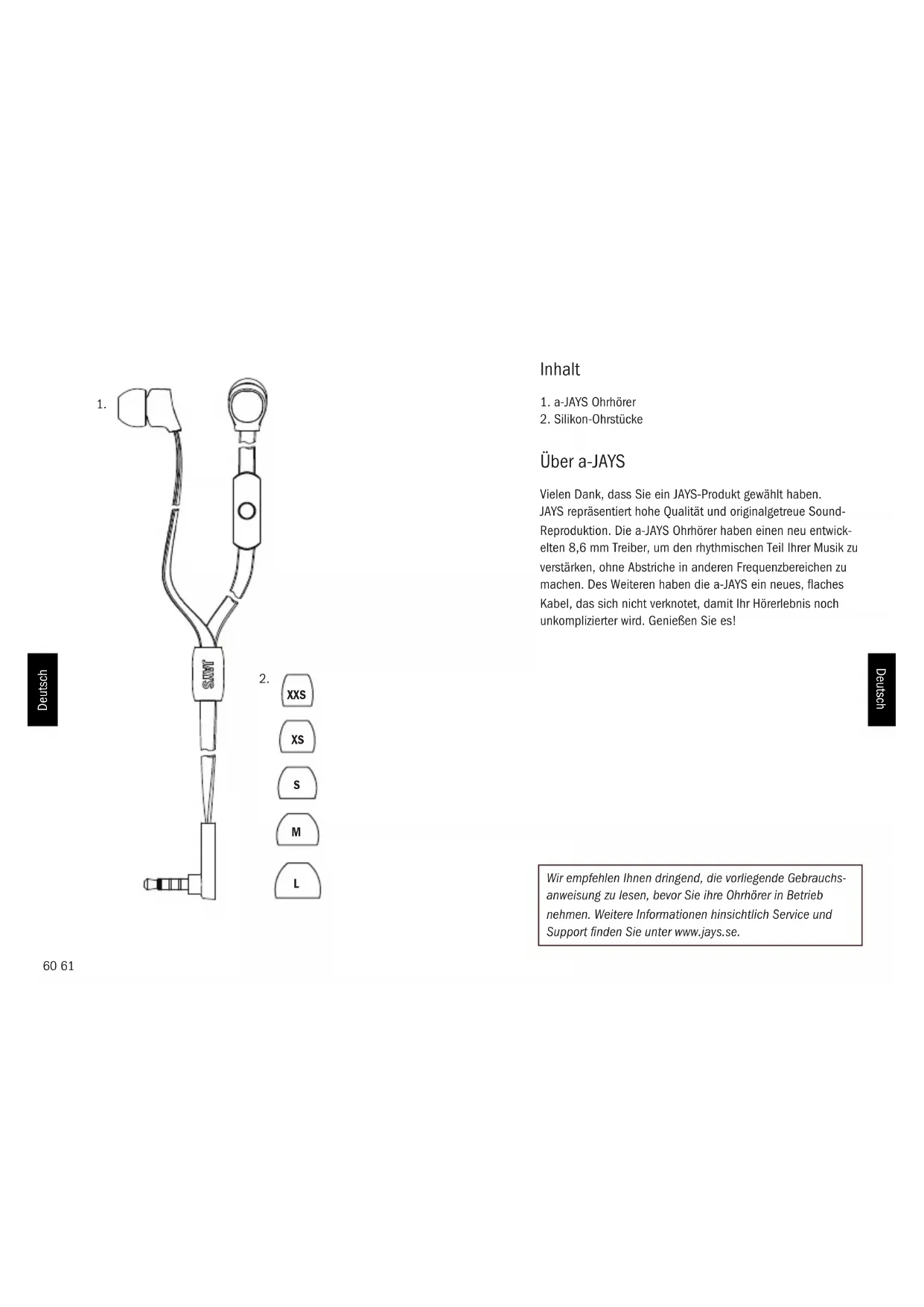 Über a-JAYS Vielen Dank, dass Sie ein JAYS-Produkt gewählt haben. JAYS repräsentiert hohe Qualität und originalgetreue Sound- Reproduktion. Die a-JAYS Ohrhörer haben einen neu entwick- elten 8,6 mm Treiber, um den rhythmischen Teil Ihrer Musik zu verstärken, ohne Abstriche in anderen Frequenzbereichen zu machen. Des Weiteren haben die a-JAYS ein neues, aches Kabel, das sich nicht verknotet, damit Ihr Hörerlebnis noch unkomplizierter wird. Genießen Sie es! Wir empfehlen Ihnen dringend, die vorliegende Gebrauchs- anweisung zu lesen, bevor Sie ihre Ohrhörer in Betrieb nehmen. Weitere Informationen hinsichtlich Service und Support nden Sie unter www.jays.se. XXS