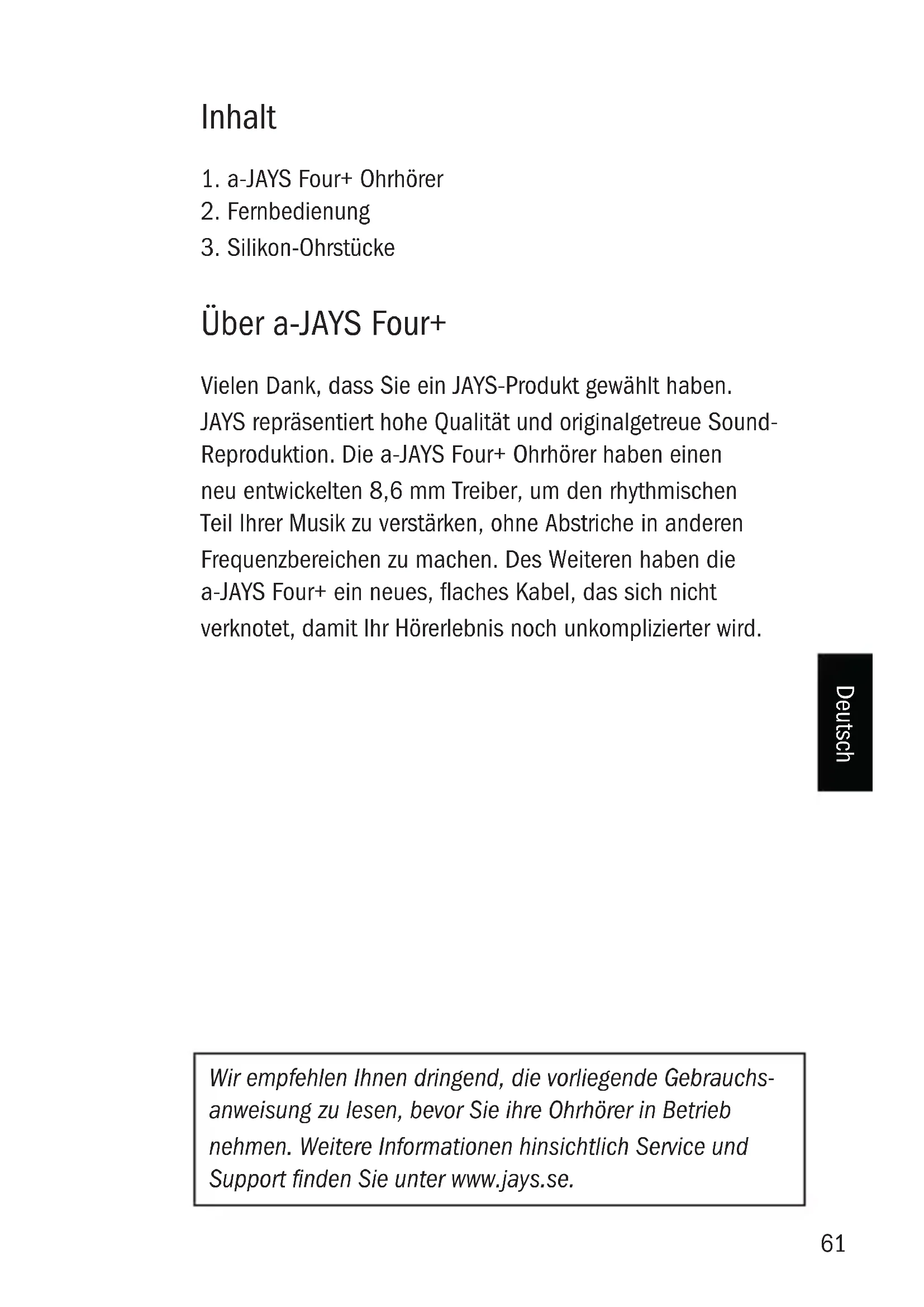 Über a-JAYS Four+ Vielen Dank, dass Sie ein JAYS-Produkt gewählt haben. JAYS repräsentiert hohe Qualität und originalgetreue Sound- Reproduktion. Die a-JAYS Four+ Ohrhörer haben einen neu entwickelten 8,6 mm Treiber, um den rhythmischen Teil Ihrer Musik zu verstärken, ohne Abstriche in anderen Frequenzbereichen zu machen. Des Weiteren haben die a-JAYS Four+ ein neues, aches Kabel, das sich nicht verknotet, damit Ihr Hörerlebnis noch unkomplizierter wird. Wir empfehlen Ihnen dringend, die vorliegende Gebrauchs- anweisung zu lesen, bevor Sie ihre Ohrhörer in Betrieb nehmen. Weitere Informationen hinsichtlich Service und Support nden Sie unter www.jays.se.62 Deutsch Technische details Treiber: 8,6 mm Dynamic Speaker Dämmung: JAYS Sound Isolating System Sensibilität: 96dB SPL @ 1kHz Impedanz: 16 Ohm Frequenzreichweite: 20 - 21 000 Hz Kabellänge: 115 cm Gewicht: 17 gramm Stecker: Versilberter 3.5 mm Stereo-Stecker Mikrofon: MEMS-Technologie63 Deutsch Erklärung zu den technischen Details Schalldruck, Dezibel und Hz Sound besteht aus unsichtbaren Vibrationen, bestehend aus Frequenzen, die sich in Wellenbewegungen, so genannten Schallwellen, bewegen. Die Bandbreite der von einem Objekt (zum Beispiel einem Lautsprecher) produzierten Vibrationen stehen in proportionalem Verhältnis zu der Veränderungen des erzeugten Drucks, wenn diese Wellen sich durch ein umgebendes Medium (zum Beispiel Luft) bewegen. Aus diesem Grund wird die Bandbreite von Schallwellen für gewöhnlich anhand ihres Drucks gemessen. Dezibel ist eine nichtdimensionale, auf einem Logarithmus basierende Skala, die Veränderungen in der Signalstärke oder Welle beschreibt. Im Zusammenhang mit Schalldruckstufen misst man damit den nominalen Grenzwert des menschlichen Hörvermögens in Bezug auf den leisesten Ton, den das menschliche Ohr noch wahrnehmen kann. Die Frequenz in dem Moment, in dem die Schallwelle über einen bestimmten Zeitpunkt ihren Höhepunkt erreicht, wird in Hz (Hertz) gemessen. Dabei handelt es sich um die Anzahl der vollständigen Zyklen pro Sekunde. Das menschliche Gehör ist auf Frequenzen zwischen ungefähr 20 und 20.000 Hz beschränkt. Sensibilität und Impedanz Die Sensibilität von Ohrhörern wird in Schalldruckpegel (Sound Pressure Level - SPL) gemessen. Dabei wird im Prin- zip gemessen, wie laut oder wie einfach ein Paar Ohrhörer betrieben werden. Die Sensibilität wird außerdem von der Impedanz des Spulentreibers beeinusst, der über die Fre- quenzreichweite variiert. Je höher der SPL und je niedriger die64 Deutsch Impedanz, desto einfacher werden Ihre Ohrhörer betrieben. Warnhinweise