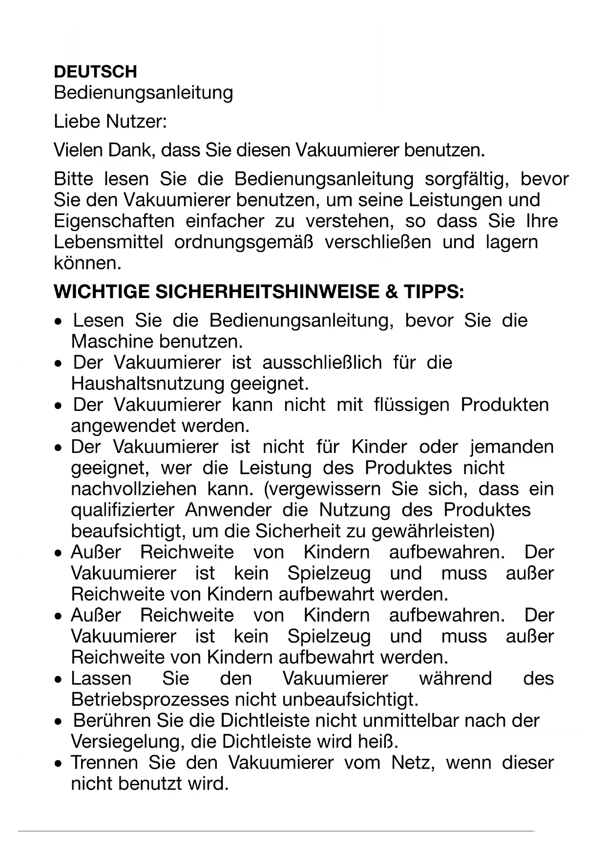 - Der Vakuumierer ist nicht für Kinder oder jemanden geeignet, wer die Leistung des Produktes nicht nachvollziehen kann. (vergewissern Sie sich, dass ein qualifizierter Anwender die Nutzung des Produktes beaufsichtigt, um die Sicherheit zu gewährleisten)