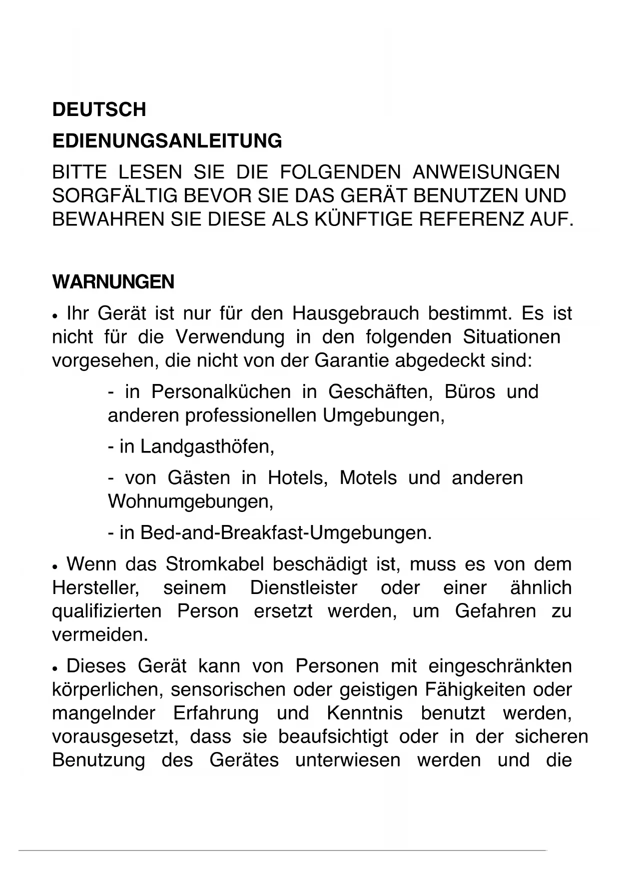 SORGFÄLTIG BEVOR SIE DAS GERÄT BENUTZEN UND BEWAHREN SIE DIESE ALS KÜNFTIGE REFERENZ AUF. WARNUNGEN