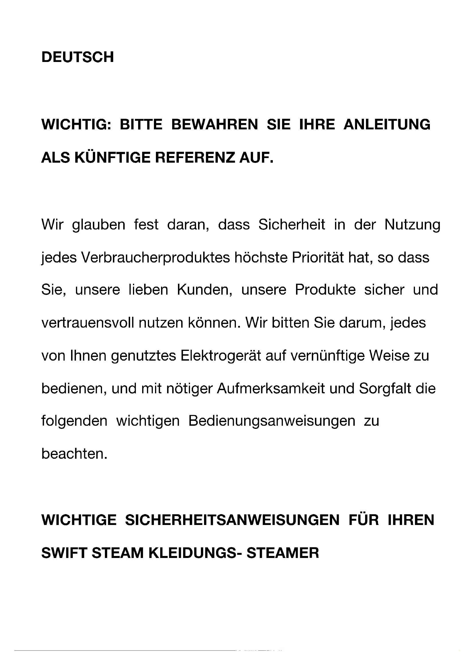 SWIFT STEAM KLEIDUNGS- STEAMER● Dieses Gerät kann von Personen mit eingeschränkten körperlichen, sensorischen oder geistigen Fähigkeiten oder mangelnder Erfahrung und Kenntnis benutzt werden, vorausgesetzt, dass sie beaufsichtigt oder in der sicheren Benutzung des Gerätes unterwiesen werden und die möglichen Gefahren vollständig verstehen. ● Bedienen Sie das Gerät nicht, wenn das Kabel oder der Stecker beschädigt ist, wenn das Gerät nicht richtig funktioniert, beschädigt oder fallengelassen wurde. Wenn das Stromkabel beschädigt ist, muss es von dem Hersteller, seinem Dienstleister oder einer ähnlich qualifizierten Person ersetzt werden, um Gefahren zu vermeiden. ● Vorsicht wird während der Nutzung des Gerätes wegen der Dampferzeugung geboten. ● Trennen Sie den Kleidungs-Steamer immer vom Netz, wenn Sie die Kleiderbürste montieren oder abnehmen,während des Auffüllens, der Reinigung und Entkalkung. ● Vor dem ersten Gebrauch des mobilen Kleidungs- Steamers lesen Sie alle Anweisungen sorgfältig und bewahren Sie diese als künftige Referenz auf. ● Jegliche Wartung, außer Reinigung, muss in einem autorisierten Servicezentrum durchgeführt werden. ● Vor dem ersten Gebrauch des Kleidungs-Steamers entfernen und entsorgen Sie ordnungsgemäß alle Verpackungsmaterialien und Aktionsetikette. ● Um die Erstickungsgefahr von kleinen Kindern auszuschließen, entfernen und entsorgen Sie ordnungsgemäß die Schutzabdeckung, mit der der Stromstecker dieses Kleidungs-Steamers ausgestattet ist. ● Platzieren Sie den Kleidungs-Steamer während des Betriebs nicht am Rand einer Bank oder eines Tisches. Stellen Sie sicher, dass die Fläche eben, sauber und frei von Wasser und anderen Stoffen ist.● Vergewissern Sie sich immer, dass der Kleidungs- Steamer stets vor dem Gebrauch ordnungsgemäß montiert ist. Benutzen Sie ausschließlich die Teile und das Zubehör, die zur Verfügung gestellt und in diesem Heft angegeben worden sind. Befolgen Sie die in diesem Buch angegebenen Anweisungen. ● Benutzen Sie das Gerät nicht draußen oder in Badezimmern. ● Lassen Sie den Kleidungs-Steamer nicht unbeaufsichtigt, während dieser angeschlossen oder im Betrieb ist. ● Wenn der Kleidungs-Steamer für einen längeren Zeitraum nicht benutzt wird, trennen Sie den Kleidungs- Steamer vom Netz. ● Lassen Sie den Kleidungs-Steamer komplett abkühlen, bevor die diesen lagern. ● Platzieren Sie den Kleidungs-Steamer immer auf seiner Grundlage während der Lagerung. Lassen Sie denangeschlossenen Kleidungs-Steamer nicht unbeaufsichtigt. ● Lagern Sie den Kleidungs-Steamer nicht mit Wasser im Wasserbehälter. Entleeren Sie immer den Behälter nach dem Gebrauch. ● Berühren Sie heiße Flächen nicht. Dieser Kleidungs- Steamer erlaubt dem Nutzer, Kleidung mit einem starken Durchfluss von Dampf zu bügeln. Hohe Temperaturen werden während der Nutzung erzeugt, was zu Verbrennungen führen könnte. Positionieren Sie immer Ihre Hände auf dem Hals des Kleidungs-Steamers, wenn Sie diesen halten, und warnen Sie andere (insbesondere Kinder) vor möglichen Verbrennungsgefahren durch Dampf, heißes Wasser und heiße Teile, besonders wenn Kleidung senkrecht gebügelt wird. ● Bewahren Sie den Kleidungs-Steamer außer Reichweite von Kindern auf. ● Der Kleidungs-Steamer muss auf einer stabilen Flächebenutzt und abgestellt werden. ● Wenn Sie den Kleidungs-Steamer auf seiner Grundlage platzieren, vergewissern Sie sich, dass die Fläche, auf der sich die Grundlage befindet, stabil ist. ● Der Kleidungs-Steamer darf nicht benutzt werden, wenn dieser fallen gelassen wurde, wenn es sichtbare Anzeichnen einer Beschädigung gibt oder wenn das Gerät undicht ist. ● Der Kleidungs-Steamer ist für die Haushaltsnutzung entwickelt worden und ist mit Leitungswasser zu benutzen. Gießen Sie kein Parfüm, keinen Essig oder keine anderen Chemikalien in den Behälter. Dieses Gerät ist nicht dafür geeignet, mit diesen Chemikalien zu funktionieren. ● Fassen Sie den Dampfkopf während der Nutzung nicht an. Bei der Nutzung des Kleindungs-Steamers, vergewissern Sie sich, dass dieser von Ihnen abgewandt ist und sich in der aufrechten Position befindet.● Testen Sie den Kleidungs-Steamer immer auf einer kleinen, unauffälligen Stelle des Stoffes, der gebügelt werden muss, um sicherzustellen, dass die Temperatur nicht zu hoch für den Stoff ist. ● Um eine Beschädigung des Kleidungs-Steamers zu vermeiden, benutzen Sie keine alkalischen Reinigungsmittel bei der Reinigung; Benutzen Sie ein weiches und mildes Reinigungsmittel. ● Der Kleidungs-Steamer erzeugt Dampft mit hohen Temperaturen. Fassen Sie den Dampfkopf während der Nutzung nicht an. Bei der Nutzung des Kleindungs- Steamers, vergewissern Sie sich, dass dieser von Ihnen abgewandt ist und sich in der aufrechten Position befindet. ● Der Kleidungs-Steamer enthält eine Thermosicherung, um das Gerät vor einer Überhitzung zu schützen. Dennoch darf der Kleidungs-Steamer nicht unbeaufsichtigt gelassen werden, während dieser ansNetz angeschlossen ist. Seien Sie besonders vorsichtig, wenn sich Kinder zu Hause/ in der Nähe von dem Kleidungs-Steamer befinden. ● Befüllen Sie den Wasserbehälter nicht über die MAX Markierung, da dies das Überlaufen von Wasser zur Folge haben kann. ● Es kann eine Leckage auf dem Dampfkopf entstehen, wenn die Temperatur von dem Kleidungs-Steamer nicht hoch genug ist, um Wasser zu verdunsten und Dampf zu erzeugen. Deswegen vergewissern Sie sich, dass der Kleidungs-Steamer immer für 2-3 Minuten vor dem Gebrauch vorgeheizt wird. ● Benutzen Sie niemals den Kleidungs-Steamer, während die Kleidung sich auf dem Körper befindet, und richten Sie den Dampf niemals auf Menschen oder Tiere. ● Lassen Sie das Kabel nicht mit heißen Flächen in Berührung kommen. ● Halten Sie den Kleidungs-Steamer sauber. Befolgen Siedie in diesem Heft angegebenen Reinigungsanweisungen. ● Verwenden Sie niemals das Eisen zugewandten Mensche