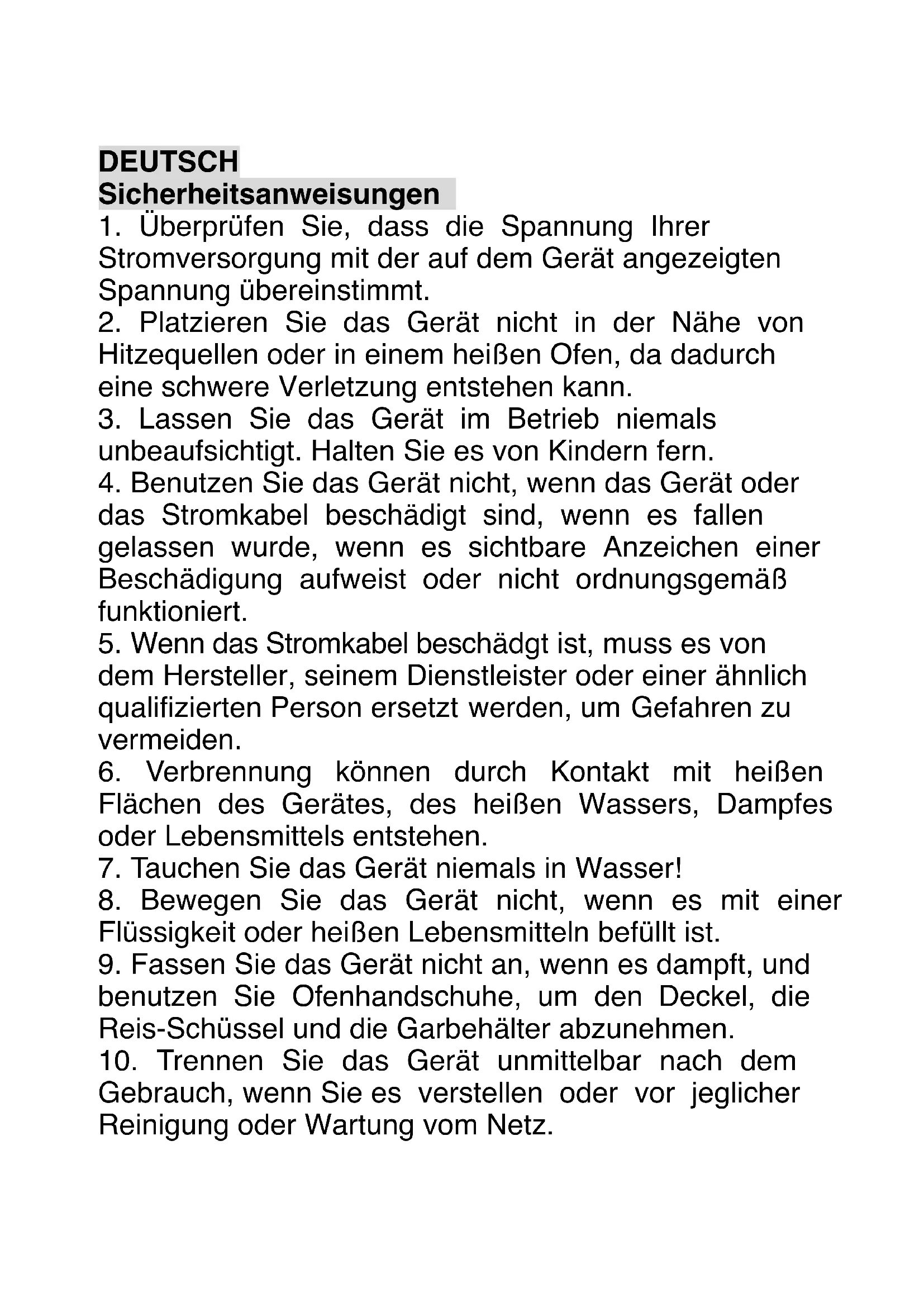 7. Tauchen Sie das Gerät niemals in Wasser!