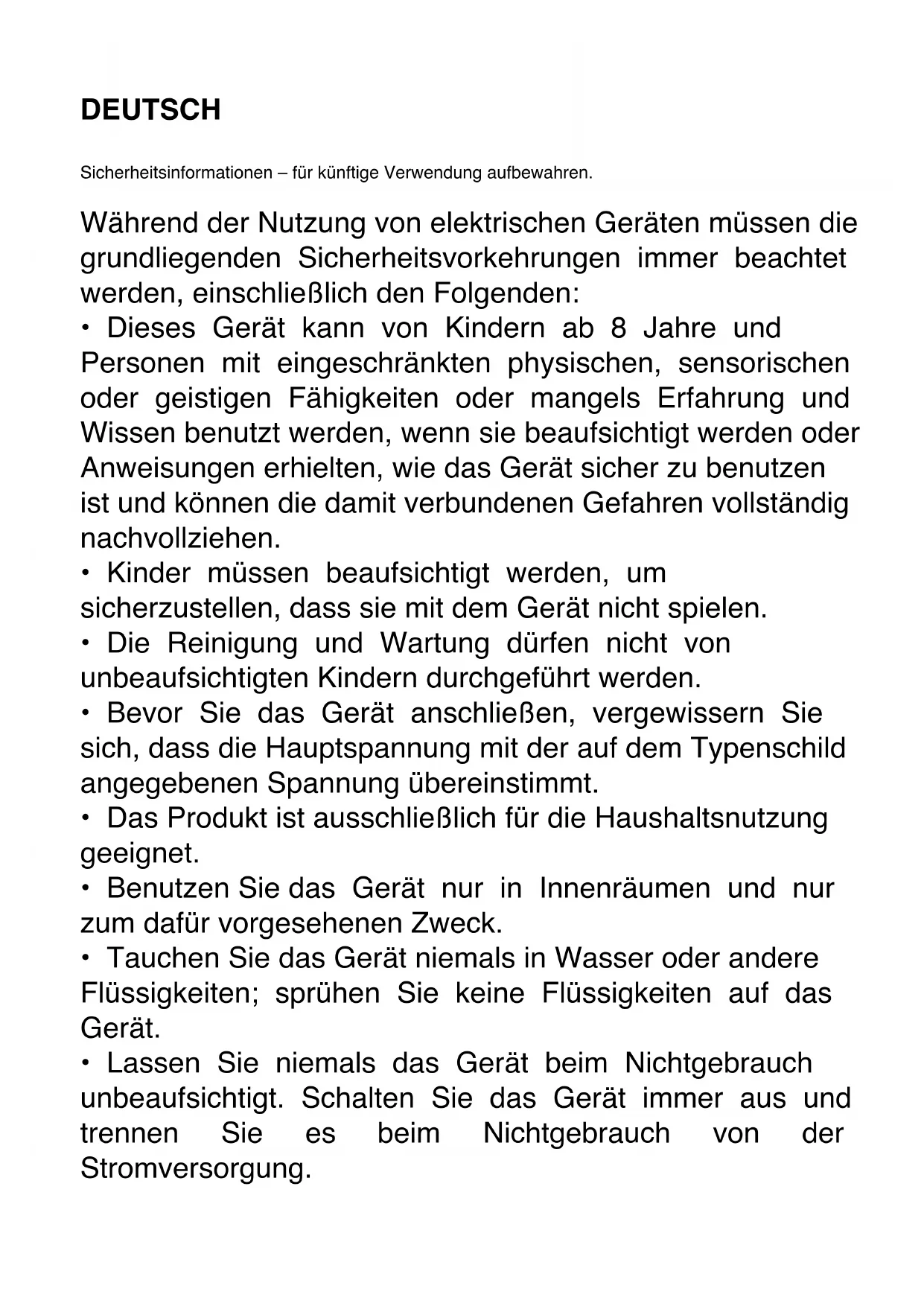 - Das Produkt ist ausschließlich für die Haushaltsnutzung geeignet.