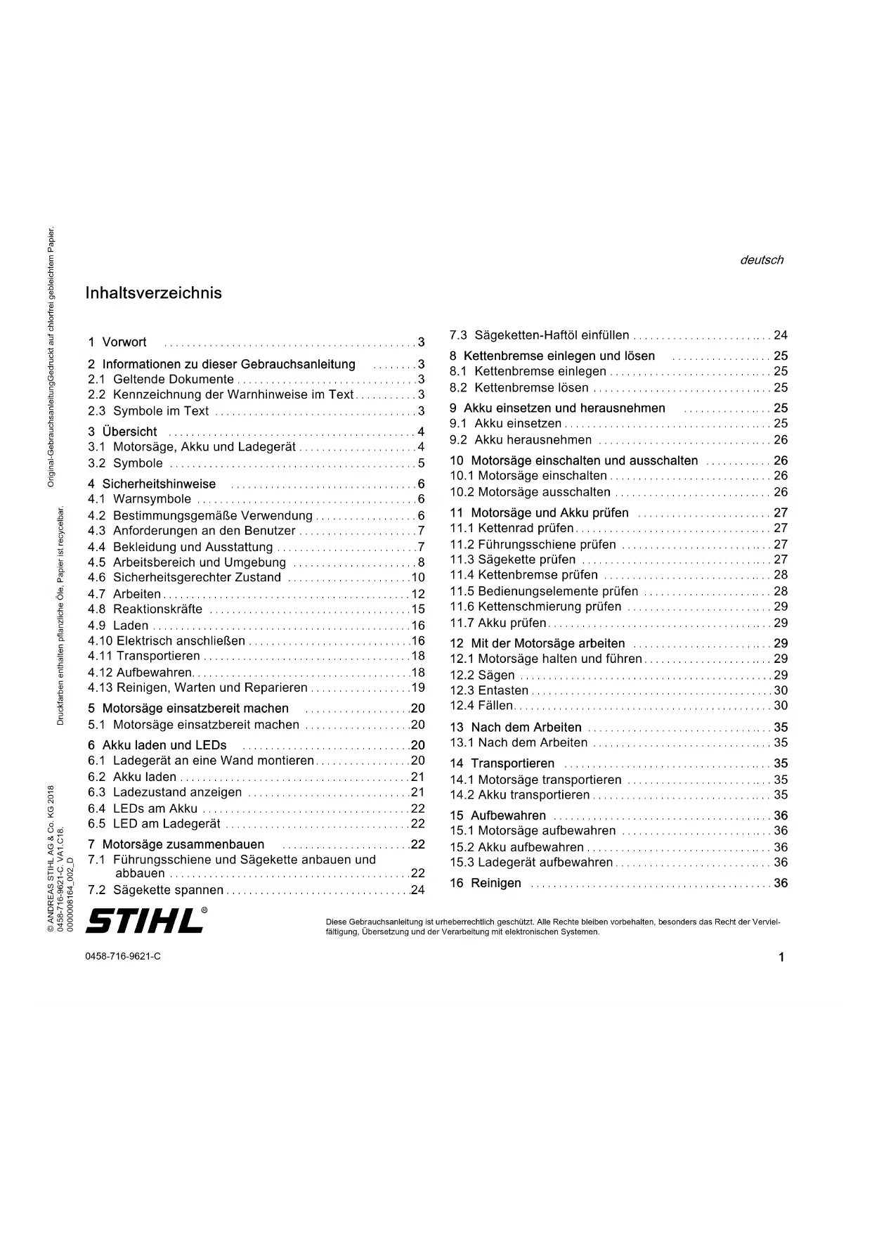 Thomas Elsner, Leiter Produktmanagement und Services 22 Ersatzteile und Zubehör Diese Symbole kennzeichnen original STIHL Ersatzteile und original STIHL Zubehör. 23 Entsorgen 24 EU-Konformitätserklärung0458-716-9621-C