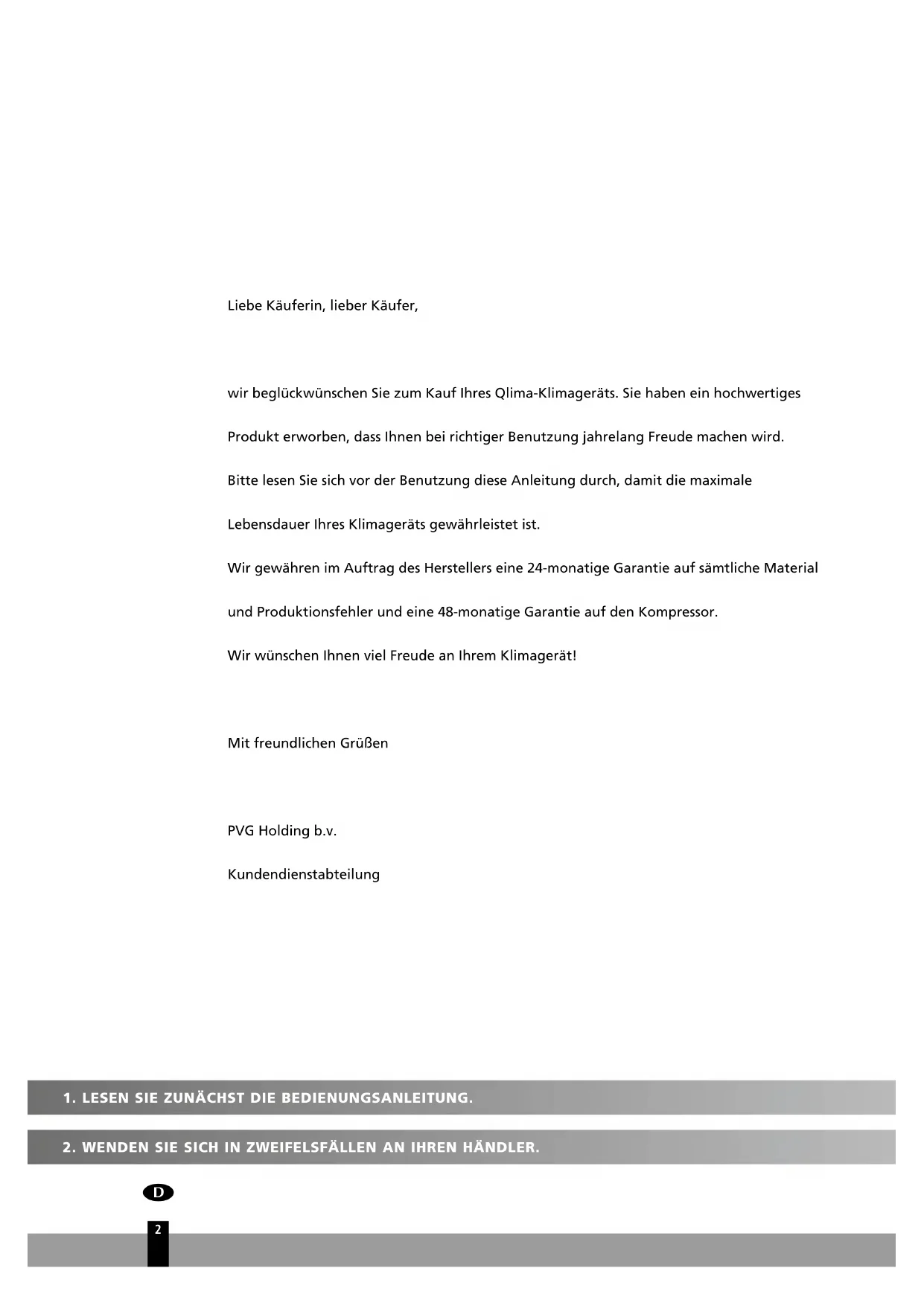Liebe Käuferin, lieber Käufer, wir beglückwünschen Sie zum Kauf Ihres Qlima-Klimageräts. Sie haben ein hochwertiges Produkt erworben, dass Ihnen bei richtiger Benutzung jahrelang Freude machen wird. Bitte lesen Sie sich vor der Benutzung diese Anleitung durch, damit die maximale Lebensdauer Ihres Klimageräts gewährleistet ist. Wir gewähren im Auftrag des Herstellers eine 24-monatige Garantie auf sämtliche Material und Produktionsfehler und eine 48-monatige Garantie auf den Kompressor. Wir wünschen Ihnen viel Freude an Ihrem Klimagerät! Mit freundlichen Grüßen PVG Holding b.v. Kundendienstabteilung3