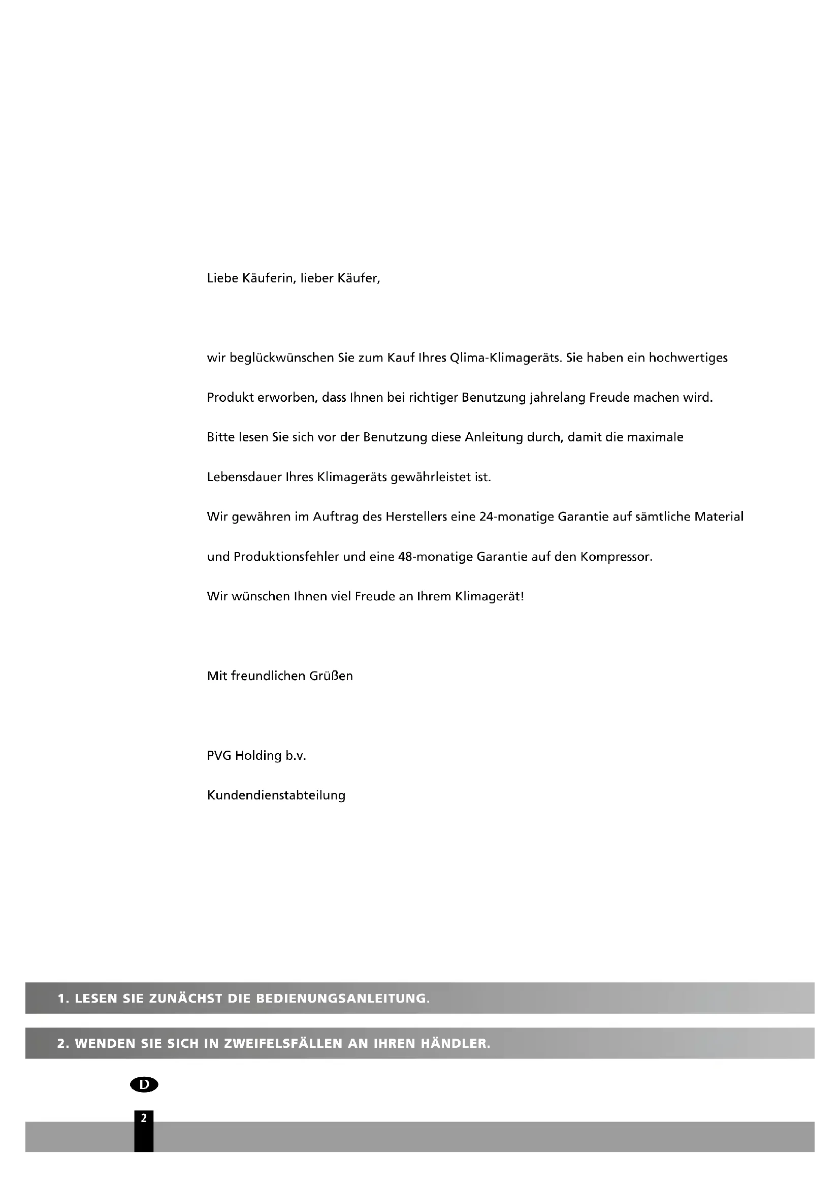 Liebe Käuferin, lieber Käufer, wir beglückwünschen Sie zum Kauf Ihres Qlima-Klimageräts. Sie haben ein hochwertiges Produkt erworben, dass Ihnen bei richtiger Benutzung jahrelang Freude machen wird. Bitte lesen Sie sich vor der Benutzung diese Anleitung durch, damit die maximale Lebensdauer Ihres Klimageräts gewährleistet ist. Wir gewähren im Auftrag des Herstellers eine 24-monatige Garantie auf sämtliche Material und Produktionsfehler und eine 48-monatige Garantie auf den Kompressor. Wir wünschen Ihnen viel Freude an Ihrem Klimagerät! Mit freundlichen Grüßen PVG Holding b.v. Kundendienstabteilung3