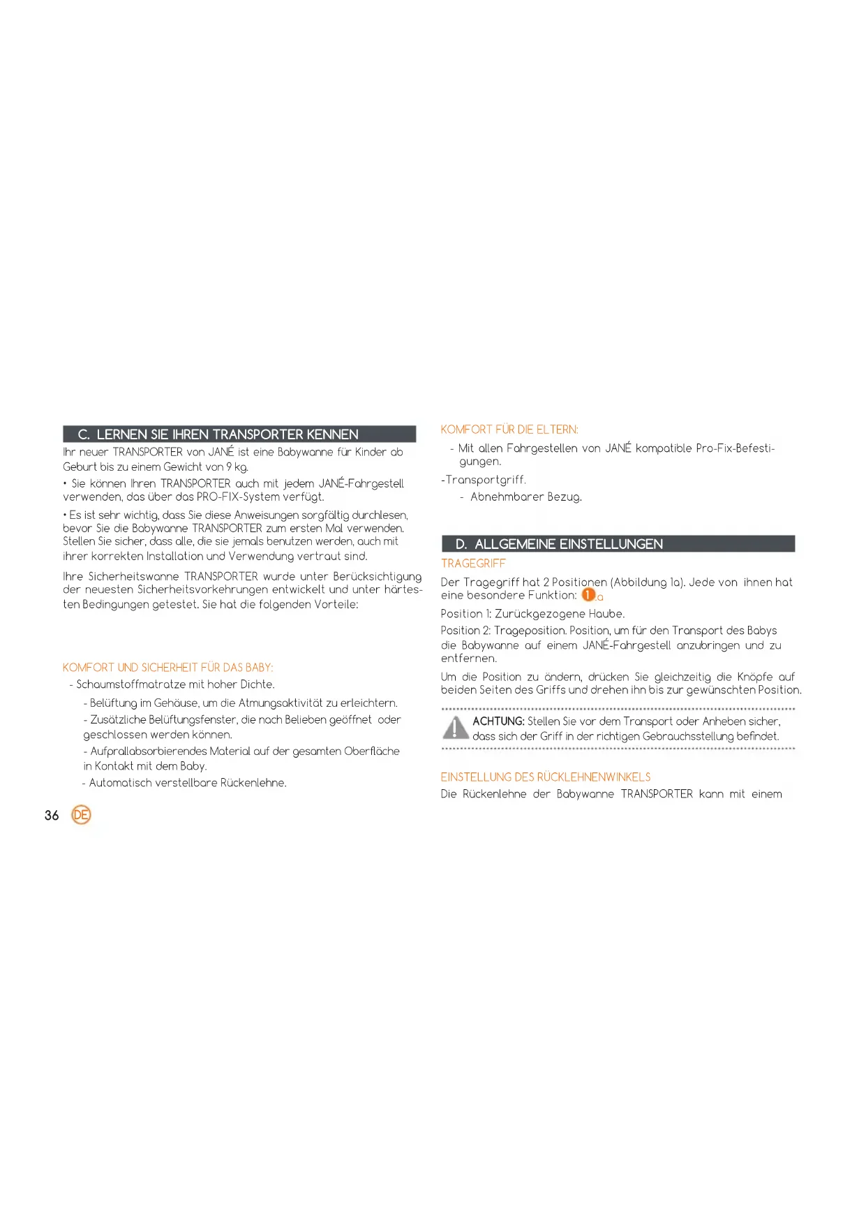 - Es ist sehr wichtig, dass Sie diese Anweisungen sorgfältig durchlesen, bevor Sie die Babywanne TRANSPORTER zum ersten Mal verwenden. Stellen Sie sicher, dass alle, die sie jemals benutzen werden, auch mit ihrer korrekten Installation und Verwendung vertraut sind. Ihre Sicherheitswanne TRANSPORTER wurde unter Berücksichtigung der neuesten Sicherheitsvorkehrungen entwickelt und unter härtes- ten Bedingungen getestet. Sie hat die folgenden Vorteile: KOMFORT UND SICHERHEIT FÜR DAS BABY: - Schaumstoffmatratze mit hoher Dichte. - Belüftung im Gehäuse, um die Atmungsaktivität zu erleichtern. - Zusätzliche Belüftungsfenster, die nach Belieben geöffnet oder geschlossen werden können. - Aufprallabsorbierendes Material auf der gesamten Oberäche in Kontakt mit dem Baby. - Automatisch verstellbare Rückenlehne. KOMFORT FÜR DIE ELTERN: - Mit allen Fahrgestellen von JANÉ kompatible Pro-Fix-Befesti- gungen. - Transportgriff. - Abnehmbarer Bezug.