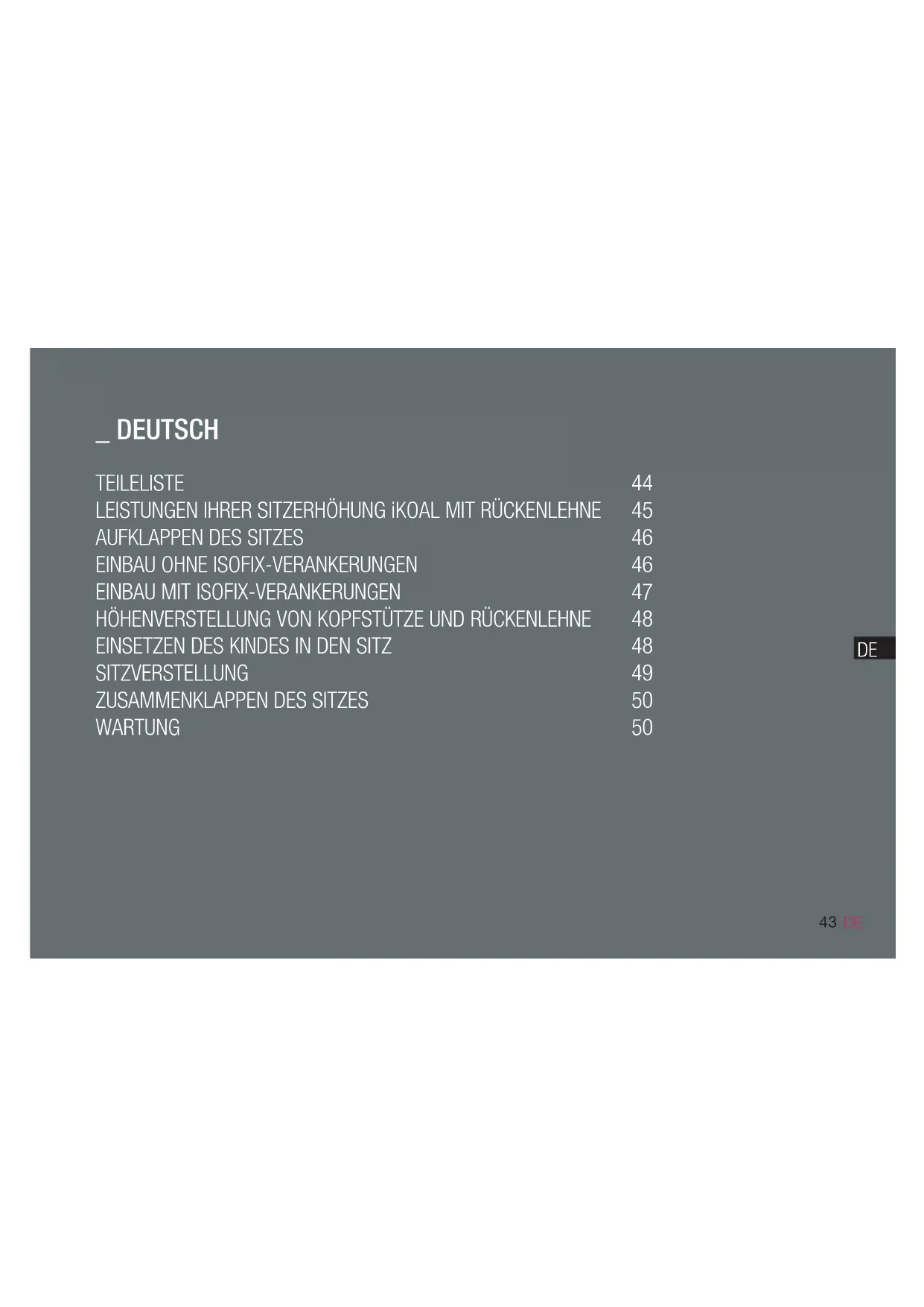 _ TEILELISTE Kopfstütze Rückenlehne Sitz Isofix-Verankerungen Entriegelungsknopf und Isofix-Statusanzeige Sicherheitsknopf Isofix zum Öffnen Schultergurtführung Beckengurtführung Isofix- und Neigungshebel Hebel zur Höhenverstellung Fach für die Anleitung (unter der Polsterung) Knopf zum Zusammenklappen Kissen 100 bis 105 cm hoch