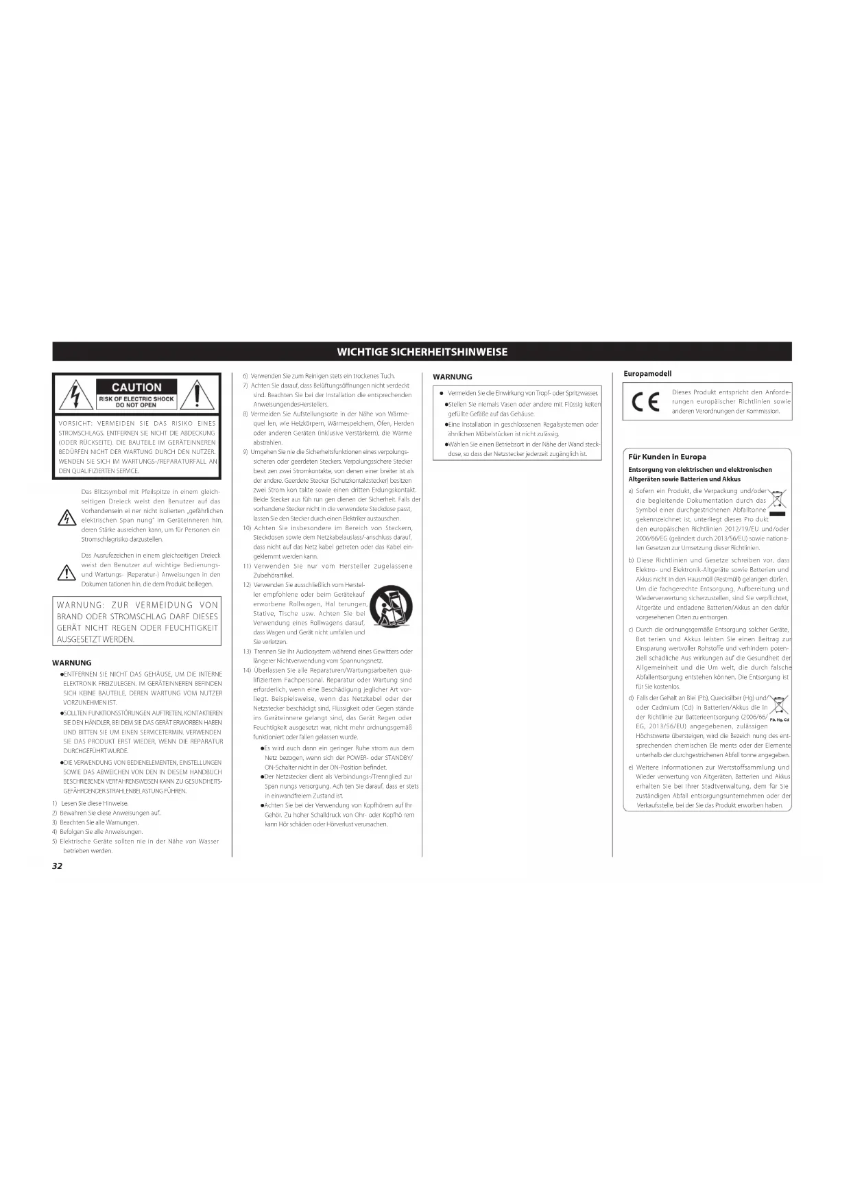 AUSGESETZT WERDEN. WARNUNG o ENTFERNEN SIE NICHT DAS GEHÄUSE, UM DIE INTERNE ELEKTRONIK FREIZULEGEN. IM GERÄTEINNEREN BEFINDEN SICH KEINE BAUTEILE, DEREN WARTUNG VOM NUTZER VORZUNEHMEN IST. o SOLLTEN FUNKTIONSSTÖRUNGEN AUFTRETEN, KONTAKTIEREN SIE DEN HÄNDLER, BEI DEM SIE DAS GERÄT ERWORBEN HABEN UND BITTEN SIE UM EINEN SERVICETERMIN. VERWENDEN SIE DAS PRODUKT ERST WIEDER, WENN DIE REPARATUR DURCHGEFÜHRT WURDE. o DIE VERWENDUNG VON BEDIENELEMENTEN, EINSTELLUNGEN SOWIE DAS ABWEICHEN VON DEN IN DIESEM HANDBUCH BESCHRIEBENEN VERFAHRENSWEISEN KANN ZU GESUNDHEITS-GEFÄHRDENDER STRAHLENBELASTUNG FÜHREN.1) Lesen Sie diese Hinweise.2) Bewahren Sie diese Anweisungen auf.3) Beachten Sie alle Warnungen.4) Befolgen Sie alle Anweisungen.5) Elektrische Geräte sollten nie in der Nähe von Wasser betrieben werden.6) Verwenden Sie zum Reinigen stets ein trockenes Tuch.7) Achten Sie darauf, dass Belüftungsöffnungen nicht verdeckt sind. Beachten Sie bei der Installation die entsprechenden Anwei sun gen des Herstellers.8) Vermeiden Sie Aufstellungsorte in der Nähe von Wärme-quel len, wie Heizkörpern, Wärmespeichern, Öfen, Herden oder anderen Geräten (inklusive Verstärkern), die Wärme abstrahlen.9) Umgehen Sie nie die Sicherheitsfunktionen eines verpolungs-sicheren oder geerdeten Steckers. Verpolungssichere Stecker besit zen zwei Stromkontakte, von denen einer breiter ist als der andere. Geerdete Stecker (Schutzkontaktstecker) besitzen zwei Strom kon takte sowie einen dritten Erdungskontakt. Beide Stecker aus füh run gen dienen der Sicherheit. Falls der vorhandene Stecker nicht in die verwendete Steckdose passt, lassen Sie den Stecker durch einen Elektriker austauschen.10) Achten Sie insbesondere im Bereich von Steckern, Steckdosen sowie dem Netzkabelauslass/-anschluss darauf, dass nicht auf das Netz kabel getreten oder das Kabel ein-geklemmt werden kann.11) Verwenden Sie nur vom Hersteller zugelassene Zubehör artikel.12) Verwenden Sie ausschließlich vom Herstel-ler empfohlene oder beim Gerätekauf erworbene Rollwagen, Hal terungen, Stative, Tische usw. Achten Sie bei Verwendung eines Rollwagens darauf, dass Wagen und Gerät nicht umfallen und Sie verletzen.13) Trennen Sie Ihr Audiosystem während eines Gewitters oder längerer Nichtverwendung vom Spannungsnetz.14) Überlassen Sie alle Reparaturen/Wartungsarbeiten qua-lifiziertem Fachpersonal. Reparatur oder Wartung sind erforderlich, wenn eine Beschädigung jeglicher Art vor-liegt. Beispielsweise, wenn das Netzkabel oder der Netzstecker beschädigt sind, Flüssigkeit oder Gegen stände ins Geräteinnere gelangt sind, das Gerät Regen oder Feuchtigkeit ausgesetzt war, nicht mehr ordnungsgemäß funktioniert oder fallen gelassen wurde. o Es wird auch dann ein geringer Ruhe strom aus dem Netz bezogen, wenn sich der POWER- oder STANDBY/ON-Schalter nicht in der ON-Position befindet. o Der Netzstecker dient als Verbindungs-/Trennglied zur Span nungs versorgung. Ach ten Sie darauf, dass er stets in einwandfreiem Zustand ist. o Achten Sie bei der Verwendung von Kopfhörern auf Ihr Gehör. Zu hoher Schalldruck von Ohr- oder Kopfhö rern kann Hör schäden oder Hörverlust verursachen. WARNUNG o Vermeiden Sie die Einwirkung von Tropf- oder Spritz wasser. o Stellen Sie niemals Vasen oder andere mit Flüssig keiten gefüllte Gefäße auf das Gehäuse. o Eine Installation in geschlossenen Regalsystemen oder ähnlichen Möbelstücken ist nicht zulässig. o Wählen Sie einen Betriebsort in der Nähe der Wand steck-dose, so dass der Netzstecker jederzeit zugänglich ist.EuropamodellDieses Produkt entspricht den Anforde-rungen europäischer Richtlinien sowie anderen Verordnungen der Kommission. Für Kunden in Europa Entsorgung von elektrischen und elektronischen Altgeräten sowie Batterien und Akkusa) Sofern ein Produkt, die Verpackung und/oder die begleitende Dokumentation durch das Symbol einer durchgestrichenen Abfalltonne gekennzeichnet ist, unterliegt dieses Pro dukt den europäischen Richtlinien 2012/19/EU und/oder 2006/66/EG (geändert durch 2013/56/EU) sowie nationa-len Gesetzen zur Umsetzung dieser Richtlinien.b) Diese Richtlinien und Gesetze schreiben vor, dass Elektro- und Elektronik-Altgeräte sowie Batterien und Akkus nicht in den Hausmüll (Restmüll) gelangen dürfen. Um die fachgerechte Entsorgung, Aufbereitung und Wiederverwertung sicherzustellen, sind Sie verpflichtet, Altgeräte und entladene Batterien/Akkus an den dafür vorgesehenen Orten zu entsorgen.c) Durch die ordnungsgemäße Entsorgung solcher Geräte, Bat terien und Akkus leisten Sie einen Beitrag zur Einsparung wertvoller Rohstoffe und verhindern poten-ziell schädliche Aus wirkungen auf die Gesundheit der Allgemeinheit und die Um welt, die durch falsche Abfallentsorgung entstehen können. Die Entsorgung ist für Sie kostenlos.d) Falls der Gehalt an Blei (Pb), Quecksilber (Hg) und/oder Cadmium (Cd) in Batterien/Akkus die in der Richtlinie zur Batterieentsorgung (2006/66/EG, 2013/56/EU) angegebenen, zulässigen Höchstwerte übersteigen, wird die Bezeich nung des ent-sprechenden chemischen Ele ments oder der Elemente unterhalb der durchgestrichenen Abfall tonne angegeben.e) Weitere Informationen zur Wertstoffsammlung und Wieder verwertung von Altgeräten, Batterien und Akkus erhalten Sie bei Ihrer Stadtverwaltung, dem für Sie zuständigen Abfall entsorgungsunternehmen oder der Verkaufsstelle, bei der Sie das Produkt erworben haben. Pb, Hg, Cd 32DEUTSCHDEUTSCH Vorbereitung Wartung Wenn die Geräteoberfläche verschmutzt ist, wischen Sie sie mit einem weichen Tuch ab oder verwenden Sie eine verdünnte, milde Flüssigseife. Lassen Sie die Geräteoberfläche vor dem nächs- ten Einsatz vollständig trocknen. o Verwenden Sie keine chemischen Reinigungstücher, Ver dünner oder ähnliche Substanzen, da sie die Gehäuse- ober fläche angreifen können.