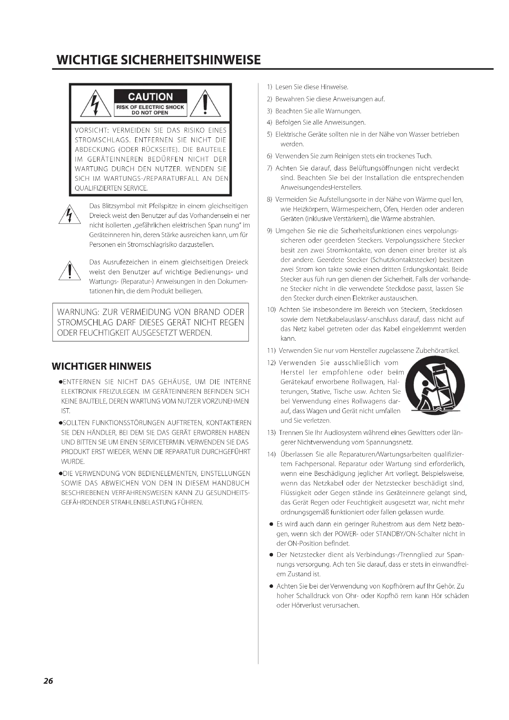 STROMSCHLAG DARF DIESES GERÄT NICHT REGEN ODER FEUCHTIGKEIT AUSGESETZT WERDEN. WICHTIGER HINWEIS o ENTFERNEN SIE NICHT DAS GEHÄUSE, UM DIE INTERNE ELEKTRONIK FREIZULEGEN. IM GERÄTEINNEREN BEFINDEN SICH KEINE BAUTEILE, DEREN WARTUNG VOM NUTZER VORZUNEHMEN IST. o SOLLTEN FUNKTIONSSTÖRUNGEN AUFTRETEN, KONTAKTIEREN SIE DEN HÄNDLER, BEI DEM SIE DAS GERÄT ERWORBEN HABEN UND BITTEN SIE UM EINEN SERVICETERMIN. VERWENDEN SIE DAS PRODUKT ERST WIEDER, WENN DIE REPARATUR DURCHGEFÜHRT WURDE. o DIE VERWENDUNG VON BEDIENELEMENTEN, EINSTELLUNGEN SOWIE DAS ABWEICHEN VON DEN IN DIESEM HANDBUCH