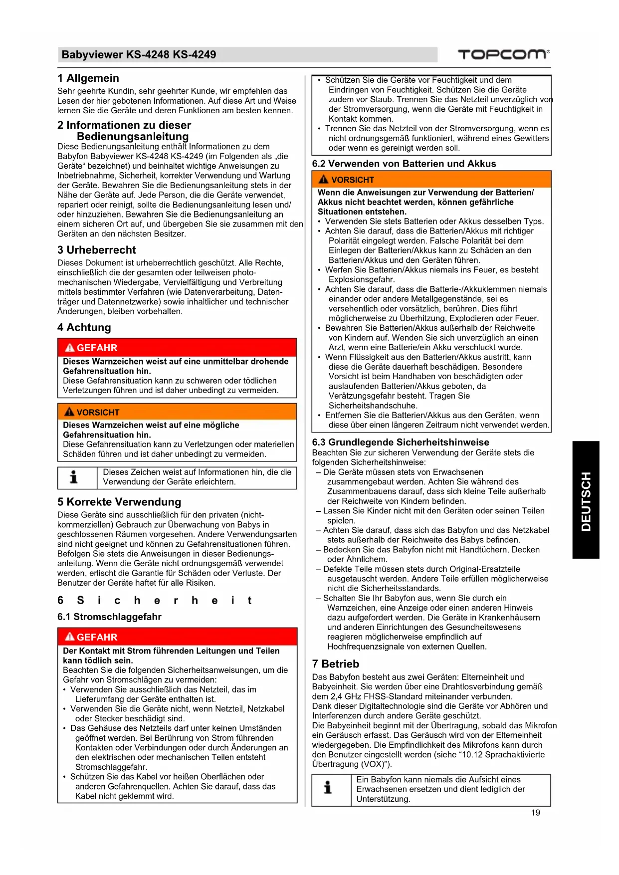 DEUTSCH 1 Allgemein Sehr geehrte Kundin, sehr geehrter Kunde, wir empfehlen das Lesen der hier gebotenen Informationen. Auf diese Art und Weise lernen Sie die Geräte und deren Funktionen am besten kennen. 2 Informationen zu dieser Bedienungsanleitung Diese Bedienungsanleitung enthält Informationen zu dem Babyfon Babyviewer KS-4248 KS-4249 (im Folgenden als „die Geräte“ bezeichnet) und beinhaltet wichtige Anweisungen zu Inbetriebnahme, Sicherheit, korrekter Verwendung und Wartung der Geräte. Bewahren Sie die Bedienungsanleitung stets in der Nähe der Geräte auf. Jede Person, die die Geräte verwendet, repariert oder reinigt, sollte die Bedienungsanleitung lesen und/ oder hinzuziehen. Bewahren Sie die Bedienungsanleitung an einem sicheren Ort auf, und übergeben Sie sie zusammen mit den Geräten an den nächsten Besitzer. 3 Urheberrecht Dieses Dokument ist urheberrechtlich geschützt. Alle Rechte, einschließlich die der gesamten oder teilweisen photo- mechanischen Wiedergabe, Vervielfältigung und Verbreitung mittels bestimmter Verfahren (wie Datenverarbeitung, Daten- träger und Datennetzwerke) sowie inhaltlicher und technischer Änderungen, bleiben vorbehalten. 4 Achtung 5 Korrekte Verwendung Diese Geräte sind ausschließlich für den privaten (nicht- kommerziellen) Gebrauch zur Überwachung von Babys in geschlossenen Räumen vorgesehen. Andere Verwendungsarten sind nicht geeignet und können zu Gefahrensituationen führen. Befolgen Sie stets die Anweisungen in dieser Bedienungs- anleitung. Wenn die Geräte nicht ordnungsgemäß verwendet werden, erlischt die Garantie für Schäden oder Verluste. Der Benutzer der Geräte haftet für alle Risiken. 6Sicherheit