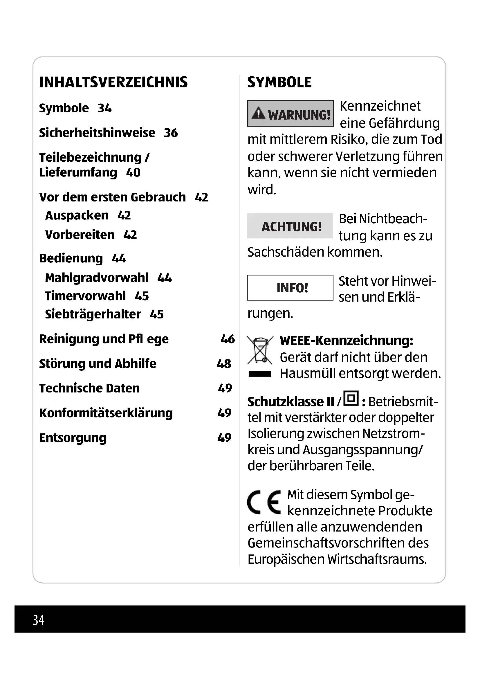 - Éliminez l’emballage et l’appa- reil en respectant les règles de tri par matières. Il est interdit de jeter l’appa- reil dans les déchets ména- gers. Si un appareil ne peut plus être utilisé, tout utilisateur a l’obliga- tion légale d’éliminer les appareils hors d’usage différemment des ordures ménagères, par exemple à un point de collecte de sa com- mune/de son quartier. Ceci per- met de garantir que les appareils hors d’usage sont traités profes- sionnellement et d’éviter des ef- fets négatifs sur l’environnement.34 INHALTSVERZEICHNIS Symbole 34 Sicherheitshinweise 36 Teilebezeichnung / Lieferumfang 40 Vor dem ersten Gebrauch 42 Auspacken 42 Vorbereiten 42 Bedienung 44 Mahlgradvorwahl 44 Timervorwahl 45 Siebträgerhalter 45 Reinigung und Pfl ege 46 Störung und Abhilfe 48 Technische Daten 49 Konformitätserklärung 49 Entsorgung 49 SYMBOLE WARNUNG! Kennzeichnet eine Gefährdung mit mittlerem Risiko, die zum Tod oder schwerer Verletzung führen kann, wenn sie nicht vermieden wird. ACHTUNG! Bei Nichtbeach- tung kann es zu Sachschäden kommen. INFO! Steht vor Hinwei- sen und Erklä- rungen. WEEE-Kennzeichnung: Gerät darf nicht über den Hausmüll entsorgt werden. Schutzklasse II / : Betriebsmit- tel mit verstärkter oder doppelter Isolierung zwischen Netzstrom- kreis und Ausgangsspannung/ der berührbaren Teile. Mit diesem Symbol ge- kennzeichnete Produkte erfüllen alle anzuwendenden Gemeinschaftsvorschriften des Europäischen Wirtschaftsraums.35 Das Siegel Geprüfte Sicher- heit (GS-Zeichen) beschei- nigt, dass ein Produkt den Anfor- derungen des deutschen Produktsicherheitsgesetzes (ProdSG) entspricht. Das GS-Zei- chen zeigt an, dass bei bestim- mungsgemäßer Verwendung und bei vorhersehbarer Fehlan- wendung des gekennzeichneten Produktes die Sicherheit und Gesundheit des Nutzers nicht gefährdet sind. Es handelt sich hierbei um ein freiwilliges Sicher- heitszeichen. Sehr geehrte Kundin, sehr geehrter Kunde, vielen Dank, dass Sie sich für den Kauf dieses Produktes ent- schieden haben. Wir hoffen sehr, dass es Ihnen gefällt und Sie es gerne benutzen. In dieser Original-Bedienungs- anleitung haben wir genau be- schrieben, wie Sie den Artikel optimal und sicher nutzen kön- nen. Wir wünschen Ihnen viel Freu- de damit! Lesen und befolgen Sie diese Original-Bedienungsanleitung vollständig vor Gebrauch des Gerätes, insbesondere die Si- cherheitshinweise, und be- wahren Sie sie auf, falls Sie spä- ter etwas nachlesen möchten. Die Nichtbeachtung dieser Be- dienungsanleitung kann zu schweren Verletzungen oder zu Schäden an der elektrischen Kaffeemühle führen. Wenn Sie den Artikel an jemand anderen weitergeben, geben Sie auch diese Bedienungsan- leitung mit. Diese Original-Bedienungsanlei- tung kann auch als PDF-Datei von unserer Homepage www.gt-support.de heruntergeladen werden.36 SICHERHEITSHINWEISE Bestimmungsgemäßer Gebrauch