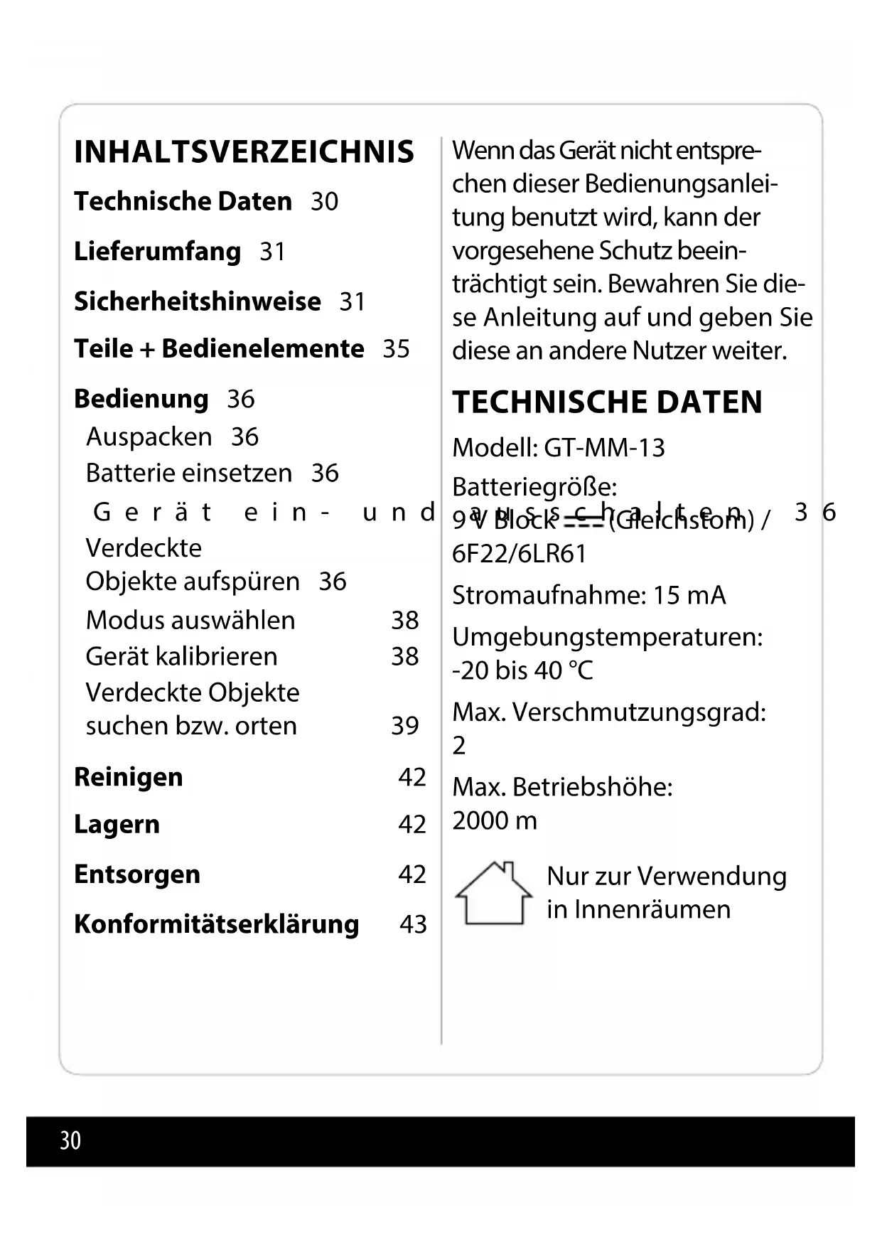 Max. Betriebshöhe: 2000 m Nur zur Verwendung in Innenräumen INHALTSVERZEICHNIS Technische Daten 30 Lieferumfang 31 Sicherheitshinweise 31 Teile + Bedienelemente 35 Bedienung 36 Auspacken 36 Batterie einsetzen 36 Gerät ein- und ausschalten 36 Verdeckte Objekte aufspüren 36 Modus auswählen 38 Gerät kalibrieren 38 Verdeckte Objekte suchen bzw. orten 39 Reinigen 42 Lagern 42 Entsorgen 42 Konformitätserklärung 4331 Da unsere Produkte ständig weiterentwickelt und verbessert werden, sind Design- und tech- nische Änderungen möglich. Diese Bedienungsanleitung kann auch als PDF-Datei von unserer Homepage www.gt-support.de heruntergeladen werden. LIEFERUMFANG Multi-Messgerät 9 V Blockbatterie der Größe 6F22 Bedienungsanleitung/ Garantiekarte SICHERHEITSHINWEISE Lesen Sie die folgenden Hinweise aufmerksam durch und bewahren Sie diese Bedienungsanleitung auf, falls Sie später etwas nachlesen möchten. Wenn Sie den Artikel an jemand anderen weitergeben, geben Sie auch diese Bedienungsan- leitung mit. Warnung! Bei der Verwen- dung von batteriebetrie- benen Geräten sind zum Schutz gegen Feuergefahr sowie gegen Körper – und Sachschäden grundlegende Sicherheitsmaßnahmen, einschließlich der folgenden Vorschriften zu beachten. Halten Sie Ihren Arbeitsbe- reich in Ordnung!