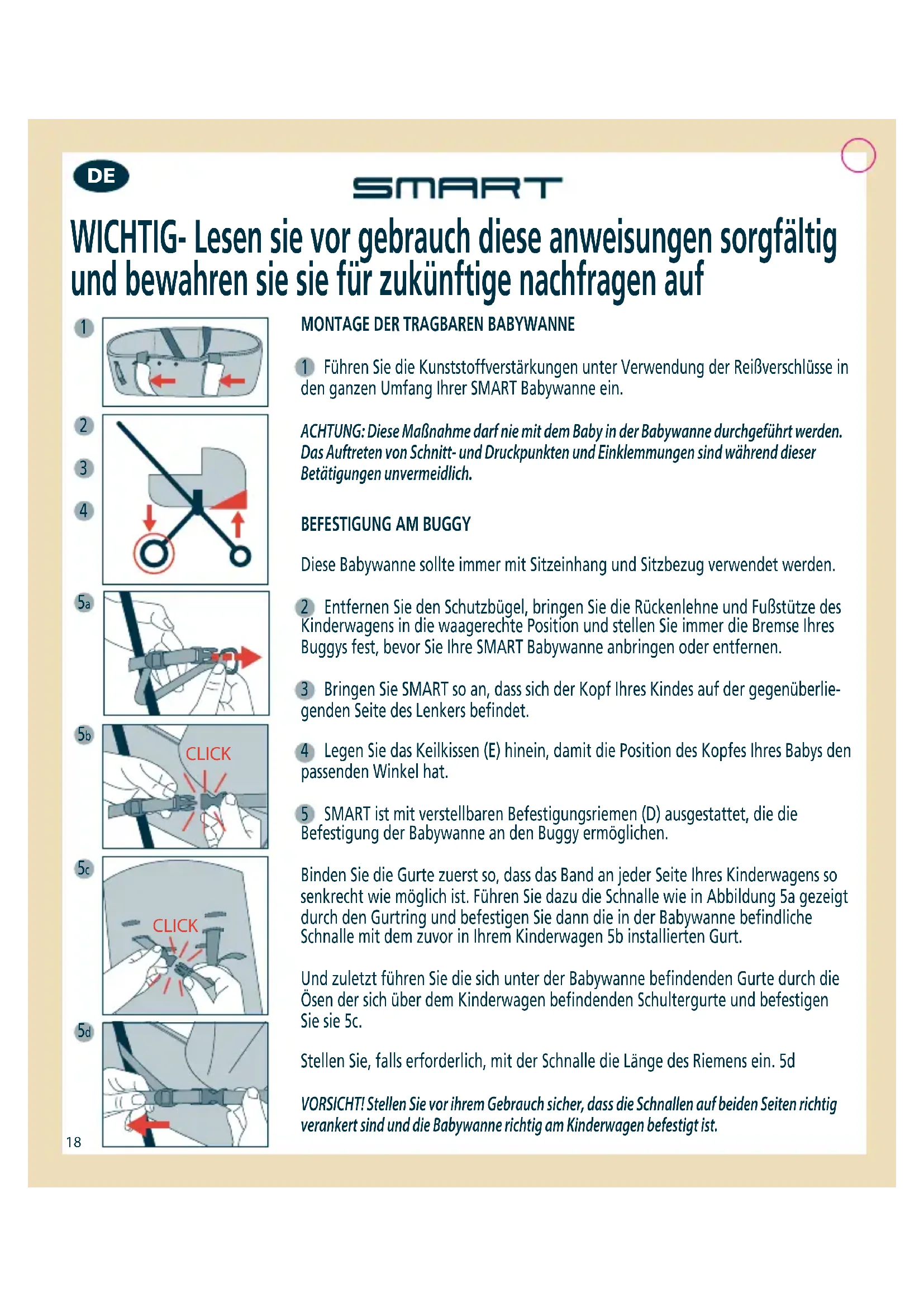 Diese Babywanne sollte immer mit Sitzeinhang und Sitzbezug verwendet werden. 2 Entfernen Sie den Schutzbügel, bringen Sie die Rückenlehne und Fußstütze des Kinderwagens in die waagerechte Position und stellen Sie immer die Bremse Ihres Buggys fest, bevor Sie Ihre SMART Babywanne anbringen oder entfernen. 3 Bringen Sie SMART so an, dass sich der Kopf Ihres Kindes auf der gegenüberlie- genden Seite des Lenkers befindet. 4 Legen Sie das Keilkissen (E) hinein, damit die Position des Kopfes Ihres Babys den passenden Winkel hat. 5 SMART ist mit verstellbaren Befestigungsriemen (D) ausgestattet, die die Befestigung der Babywanne an den Buggy ermöglichen. Binden Sie die Gurte zuerst so, dass das Band an jeder Seite Ihres Kinderwagens so senkrecht wie möglich ist. Führen Sie dazu die Schnalle wie in Abbildung 5a gezeigt durch den Gurtring und befestigen Sie dann die in der Babywanne befindliche Schnalle mit dem zuvor in Ihrem Kinderwagen 5b installierten Gurt. Und zuletzt führen Sie die sich unter der Babywanne befindenden Gurte durch die Ösen der sich über dem Kinderwagen befindenden Schultergurte und befestigen Sie sie 5c. Stellen Sie, falls erforderlich, mit der Schnalle die Länge des Riemens ein. 5d VORSICHT! Stellen Sie vor ihrem Gebrauch sicher, dass die Schnallen auf beiden Seiten richtig verankert sind und die Babywanne richtig am Kinderwagen befestigt ist. WICHTIG- Lesen sie vor gebrauch diese anweisungen sorgfältig und bewahren sie sie für zukünftige nachfragen auf
