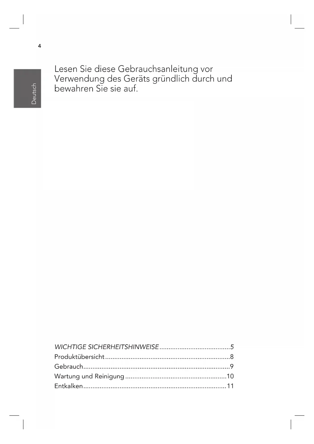 - Entkalken Lesen Sie diese Gebrauchsanleitung vor Verwendung des Geräts gründlich durch und bewahren Sie sie auf.5 Deutsch Deutsch Deutsch Deutsch WICHTIGE SICHERHEITSHINWEISE p. 11