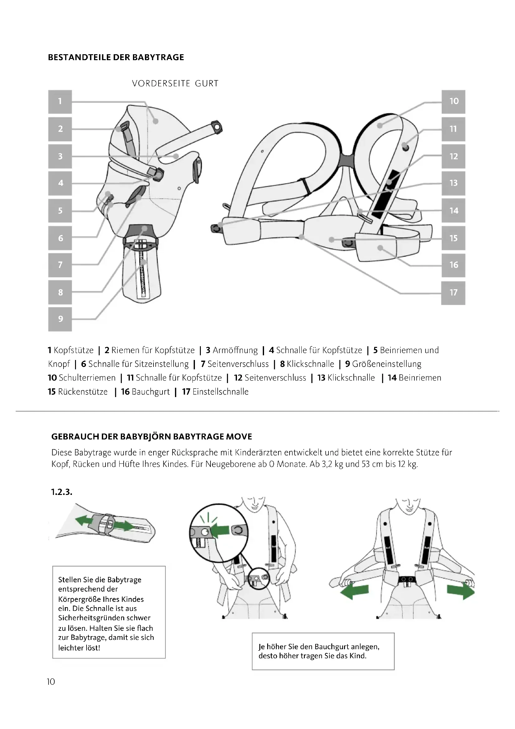 1 Kopfstütze | 2 Riemen für Kopfstütze | 3 Armönung | 4 Schnalle für Kopfstütze | 5 Beinriemen und Knopf | 6 Schnalle für Sitzeinstellung | 7 Seitenverschluss | 8 Klickschnalle | 9 Größeneinstellung 10 Schulterriemen | 11 Schnalle für Kopfstütze | 12 Seitenverschluss | 13 Klickschnalle | 14 Beinriemen 15 Rückenstütze | 16 Bauchgurt | 17 Einstellschnalle Stellen Sie die Babytrage entsprechend der Körpergröße Ihres Kindes ein. Die Schnalle ist aus Sicherheitsgründen schwer zu lösen. Halten Sie sie flach zur Babytrage, damit sie sich leichter löst! Je höher Sie den Bauchgurt anlegen, desto höher tragen Sie das Kind.11