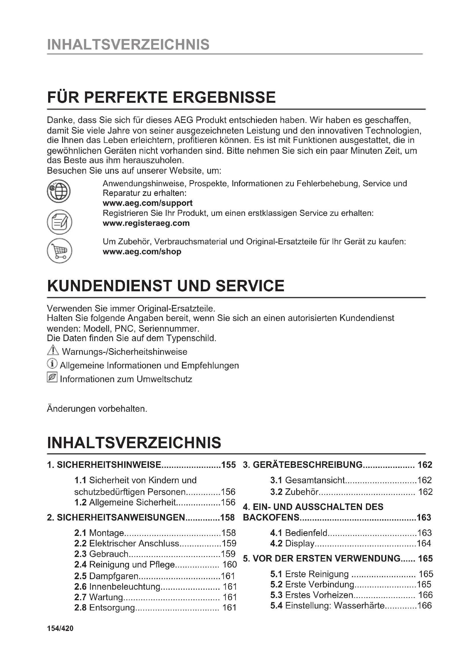 L'ENVIRONNEMENT Recyclez les matériaux portant le symbole . Déposez les emballages dans les conteneurs prévus à cet effet. Contribuez à la protection de l'environnement et à votre sécurité, recyclez vos produits électriques et électroniques. Ne jetez pas les appareils portant le symbole avec les ordures ménagères. Emmenez un tel produit dans votre centre local de recyclage ou contactez vos services municipaux. 153/420 PRENEZ UN RACCOURCI !FÜR PERFEKTE ERGEBNISSE Danke, dass Sie sich für dieses AEG Produkt entschieden haben. Wir haben es geschaffen, damit Sie viele Jahre von seiner ausgezeichneten Leistung und den innovativen Technologien, die Ihnen das Leben erleichtern, profitieren können. Es ist mit Funktionen ausgestattet, die in gewöhnlichen Geräten nicht vorhanden sind. Bitte nehmen Sie sich ein paar Minuten Zeit, um das Beste aus ihm herauszuholen. Besuchen Sie uns auf unserer Website, um: Anwendungshinweise, Prospekte, Informationen zu Fehlerbehebung, Service und Reparatur zu erhalten: www.aeg.com/support Registrieren Sie Ihr Produkt, um einen erstklassigen Service zu erhalten: www.registeraeg.com Um Zubehör, Verbrauchsmaterial und Original-Ersatzteile für Ihr Gerät zu kaufen: www.aeg.com/shop