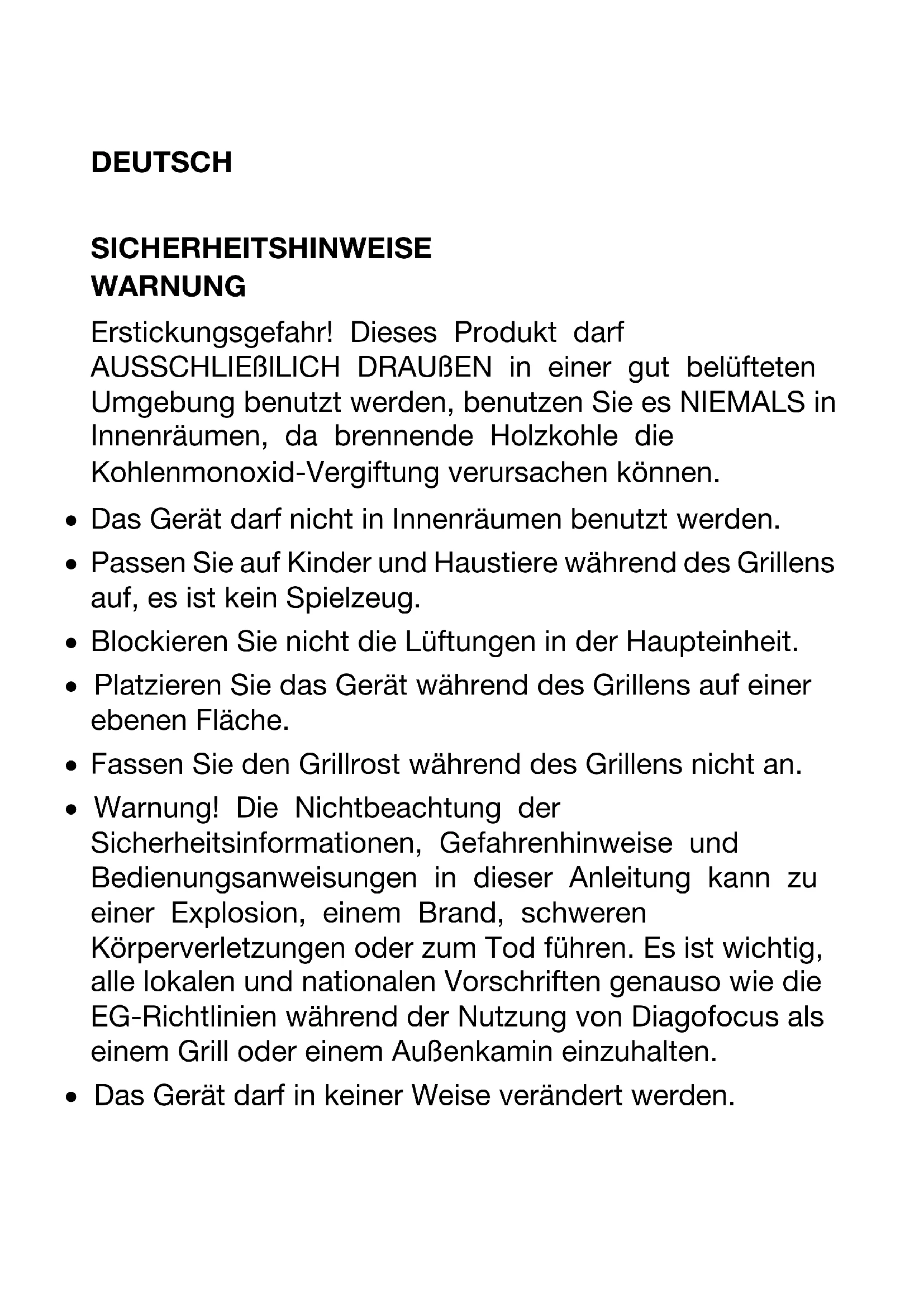 - Warnung! Die Nichtbeachtung der Sicherheitsinformationen, Gefahrenhinweise und Bedienungsanweisungen in dieser Anleitung kann zu einer Explosion, einem Brand, schweren Körperverletzungen oder zum Tod führen. Es ist wichtig, alle lokalen und nationalen Vorschriften genauso wie die EG-Richtlinien während der Nutzung von Diagofocus als einem Grill oder einem Außenkamin einzuhalten.