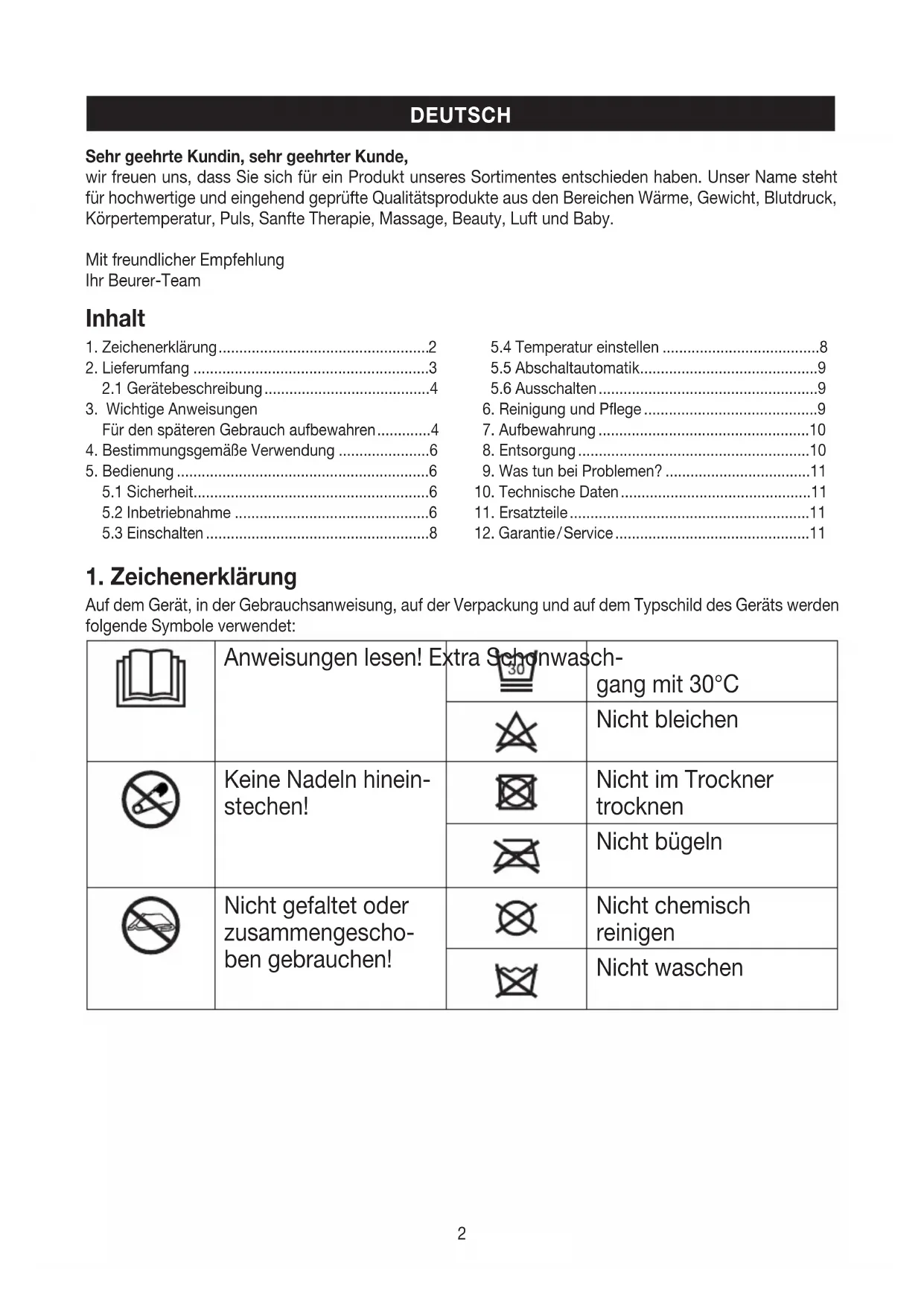 Sehr geehrte Kundin, sehr geehrter Kunde, wir freuen uns, dass Sie sich für ein Produkt unseres Sortimentes entschieden haben. Unser Name steht für hochwertige und eingehend geprüfte Qualitätsprodukte aus den Bereichen Wärme, Gewicht, Blutdruck, Körpertemperatur, Puls, Sanfte Therapie, Massage, Beauty, Luft und Baby. Mit freundlicher Empfehlung Ihr Beurer-Team3 Darf nicht von sehr jungen Kindern (0-3 Jahren) benutzt werden. Die bei diesem Gerät eingesetzten Textili