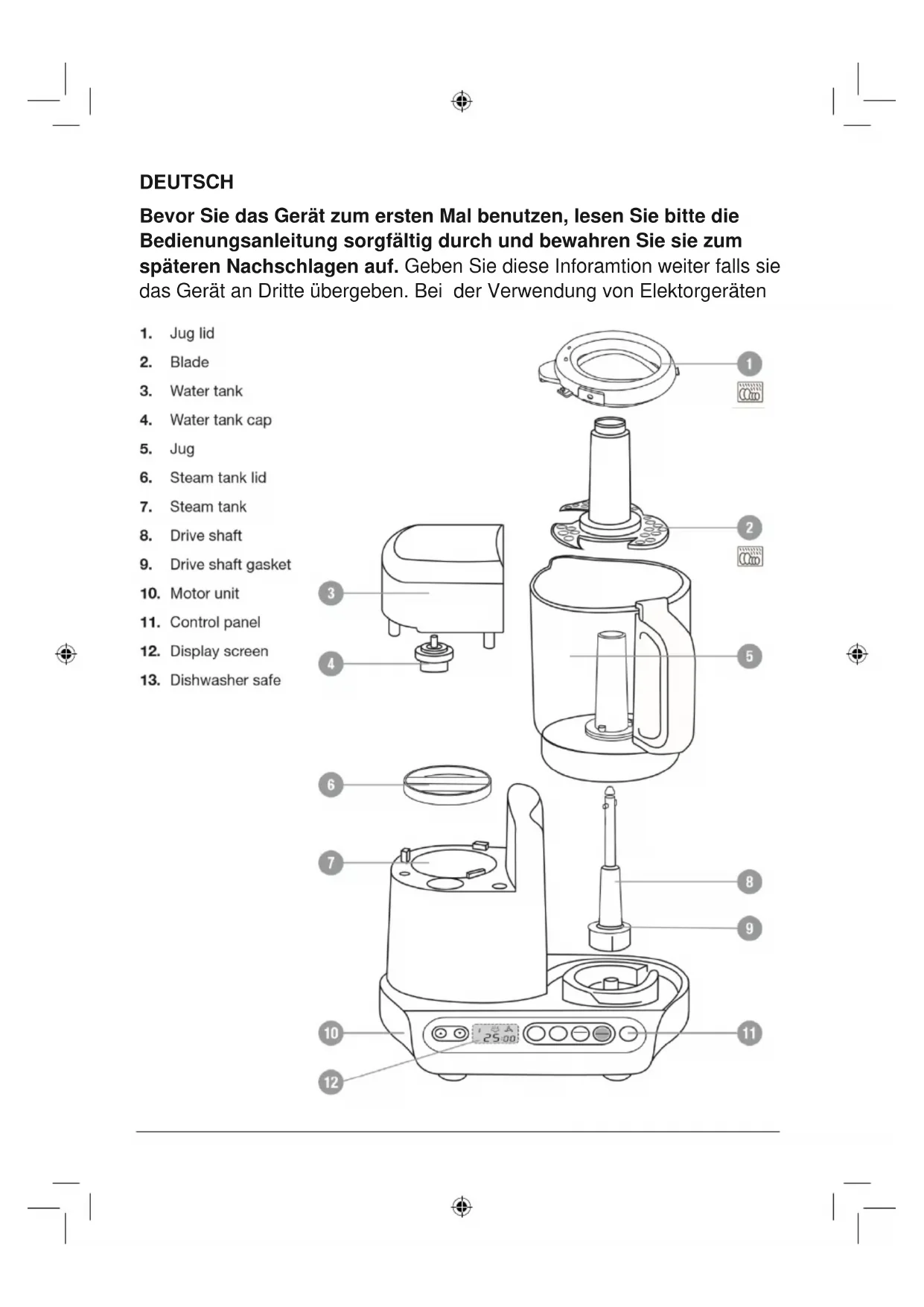 - Verwenden Sie keine rauen Scheuerschwämme oder Reinigungsmittel auf dem Zubehör.FEHLERBEHEBUNG Zustand Möglicher Grund Mögliche Hilfe Maschine will nicht starten. Sicherheitsverriegelung am Kannendeckel ist noch nicht vollständig in die Basis eingesetzt. Stellen Sie sicher, das der Becherdeckel gegen den Uhrzeigersinn so weit wie möglich gedreht ist und Sicherheitsverriegelung am Kannendeckel vollständig in Sockel eingesetzt ist. Wasser- / Dampftank ist trocken. (Gerät gibt wiederholt einen Signalton, um anzuzeigen, dass der Dampftank trocken ist) Fügen Sie Wasser in den Tank. Maschine stoppt während des Betriebs Steam Tank is dry. (Machine will beep repeatedly to indicate that the Steam Tank is Dry) Add water to Water Tank. Sicherheitsverriegelung am Kannendeckel ist von der Basis gelöst worden. Stellen Sie sicher, dass der Becherdeckel gegen den Uhrzeigersinn so weit wie möglich gedreht und Sicherheitsverriegelung am Kannendeckel vollständig in Sockel eingesetzt ist. Fertige Püree Konsistenz ist nicht glatt, wie ich es möchte Rohkost ist nicht fein genug ist gewürfelt, bevor Sie es in die Kanne geben. Nahrung in kleinere Stücke schneiden, ca. 1-2cm, bevor Sie in die Kanne gegebenwerden. Niedriger Wassergehalt von Rohkost. Fügen Sie zusätzliches Wasser, Formula, Muttermilch oder eine andere Flüssigkeit hinzu nach dem garen und mischen Sie länger. Lebensmittel nicht lange genug gemischt Verwenden Sie die PULSE-Taste, um Lebensmittel länger zu mischen. Weiteres Dämpfen erforderlich Verwenden Sie die manuelle Dampffunktion, um mehr zu kochen. Das Essen ist zu wässrig, nachdem es gemischt wird Wasser aus Dampf sowie Wassergehalt in der Nahrung ist zu hoch. Vor dem Mischen, stoppen Sie den dampfenden Prozess und entfernen Sie überschüssiges Wasser. Leckriss unter der Einheit. Antriebswellendichtung darf nicht vorhanden sein. Überprüfen Sie ob die Antriebswellendichtung richtig eingesetzt ist über die Antriebswelle in der Kanne. Undichte in der Nähe des Wassertankes Dampfbehälterdeckel und Wassertankverschluss darf nicht vorhanden sein. Überprüfen Sie, ob die Dampfbehälterdeckel und Wassertankverschluss korrekt vorhanden sind. WICHTIGE SICHERHEITSHINWEISE Beim Betrieb des Gerätes sollten immer grundlegende Sicherheitsregeln beachtet werden, einschließlich der folgenden:Lesen Sie alle Anweisungen durch, und befolgen Sie sie bei Verwendung dieses Gerätes.