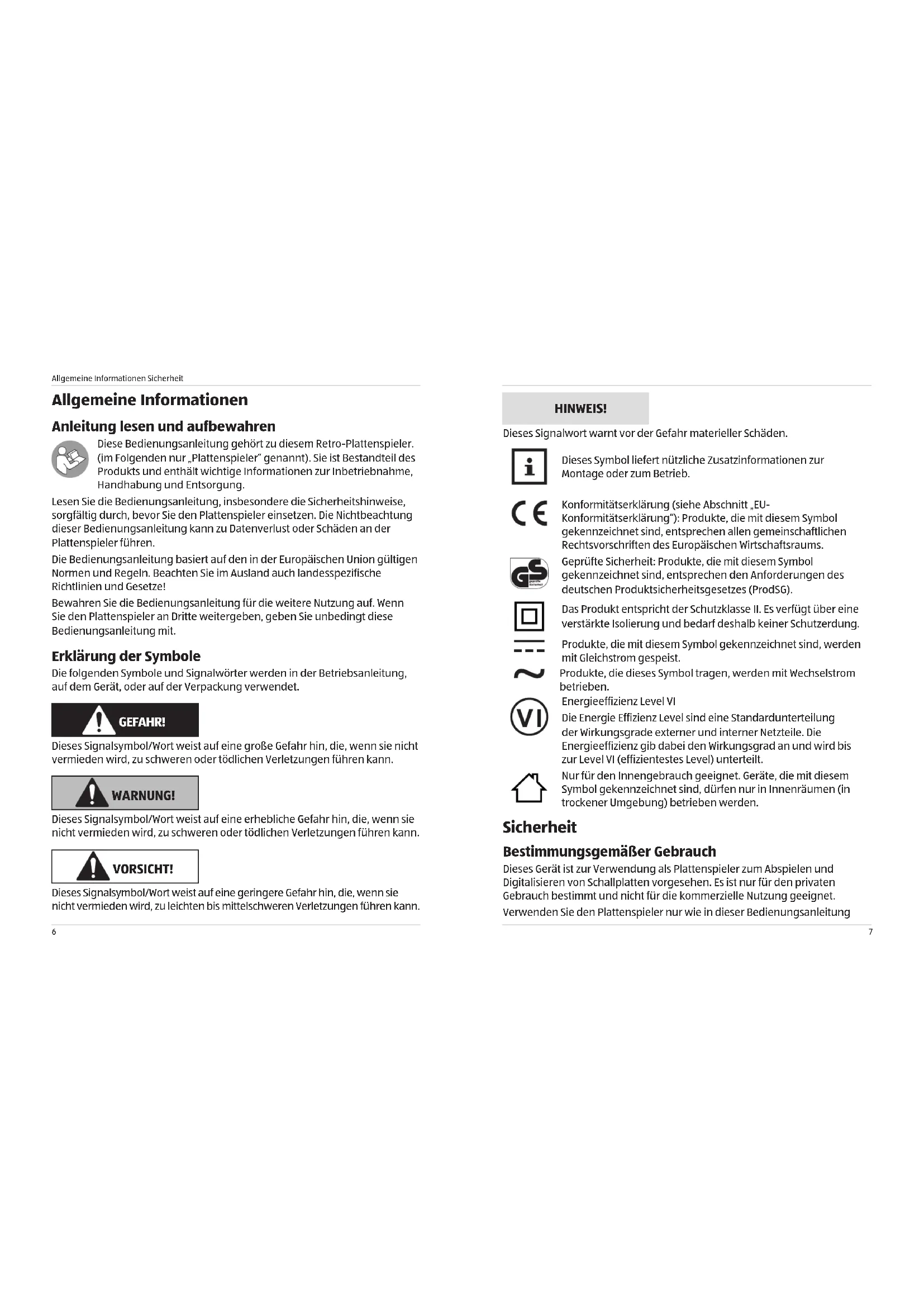 HINWEIS! Dieses Signalwort warnt vor der Gefahr materieller Schäden. Dieses Symbol liefert nützliche Zusatzinformationen zur Montage oder zum Betrieb. Konformitätserklärung (siehe Abschnitt „EU- Konformitätserklärung“): Produkte, die mit diesem Symbol gekennzeichnet sind, entsprechen allen gemeinschaftlichen Rechtsvorschriften des Europäischen Wirtschaftsraums. Geprüfte Sicherheit: Produkte, die mit diesem Symbol gekennzeichnet sind, entsprechen den Anforderungen des deutschen Produktsicherheitsgesetzes (ProdSG). Das Produkt entspricht der Schutzklasse II. Es verfügt über eine verstärkte Isolierung und bedarf deshalb keiner Schutzerdung. Produkte, die mit diesem Symbol gekennzeichnet sind, werden mit Gleichstrom gespeist. Produkte, die dieses Symbol tragen, werden mit Wechselstrom betrieben. Energieeffizienz Level VI Die Energie Effizienz Level sind eine Standardunterteilung der Wirkungsgrade externer und interner Netzteile. Die Energieeffizienz gib dabei den Wirkungsgrad an und wird bis zur Level VI (effizientestes Level) unterteilt. Nur für den Innengebrauch geeignet. Geräte, die mit diesem Symbol gekennzeichnet sind, dürfen nur in Innenräumen (in trockener Umgebung) betrieben werden. Sicherheit Bestimmungsgemäßer Gebrauch Dieses Gerät ist zur Verwendung als Plattenspieler zum Abspielen und Digitalisieren von Schallplatten vorgesehen. Es ist nur für den privaten Gebrauch bestimmt und nicht für die kommerzielle Nutzung geeignet. Verwenden Sie den Plattenspieler nur wie in dieser Bedienungsanleitung Allgemeine Informationen Anleitung lesen und aufbewahren Diese Bedienungsanleitung gehört zu diesem Retro-Plattenspieler. (im Folgenden nur „Plattenspieler“ genannt). Sie ist Bestandteil des Produkts und enthält wichtige Informationen zur Inbetriebnahme, Handhabung und Entsorgung. Lesen Sie die Bedienungsanleitung, insbesondere die Sicherheitshinweise, sorgfältig durch, bevor Sie den Plattenspieler einsetzen. Die Nichtbeachtung dieser Bedienungsanleitung kann zu Datenverlust oder Schäden an der Plattenspieler führen. Die Bedienungsanleitung basiert auf den in der Europäischen Union gültigen Normen und Regeln. Beachten Sie im Ausland auch landesspezifische Richtlinien und Gesetze! Bewahren Sie die Bedienungsanleitung für die weitere Nutzung auf. Wenn Sie den Plattenspieler an Dritte weitergeben, geben Sie unbedingt diese Bedienungsanleitung mit. Erklärung der Symbole Die folgenden Symbole und Signalwörter werden in der Betriebsanleitung, auf dem Gerät, oder auf der Verpackung verwendet. GEFAHR! Dieses Signalsymbol/Wort weist auf eine große Gefahr hin, die, wenn sie nicht vermieden wird, zu schweren oder tödlichen Verletzungen führen kann. WARNUNG! Dieses Signalsymbol/Wort weist auf eine erhebliche Gefahr hin, die, wenn sie nicht vermieden wird, zu schweren oder tödlichen Verletzungen führen kann. VORSICHT! Dieses Signalsymbol/Wort weist auf eine geringere Gefahr hin, die, wenn sie nicht vermieden wird, zu leichten bis mittelschweren Verletzungen führen kann.Sicherheit Sicherheit