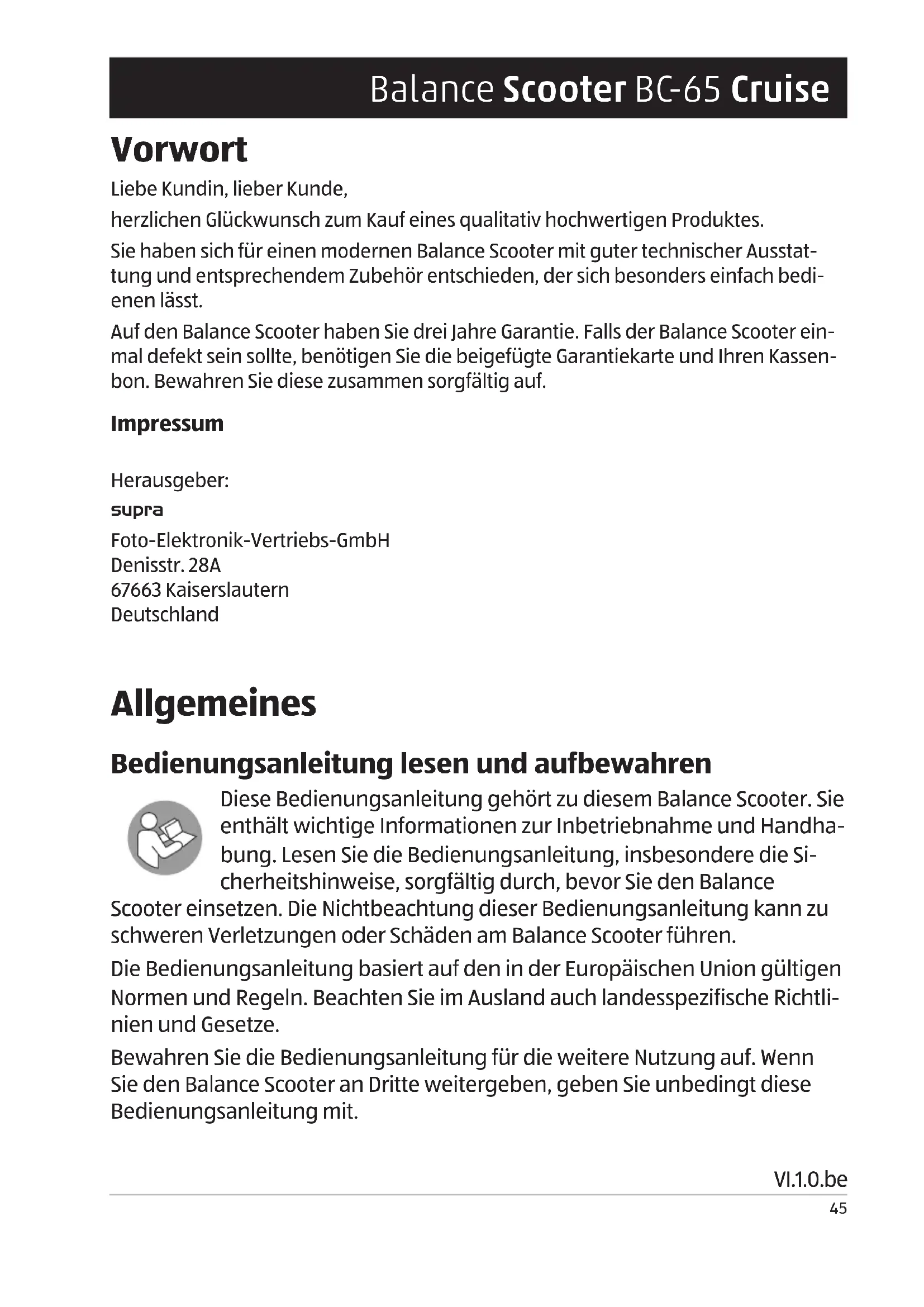 Tuch aus. Lassen Sie alle Teile danach vollständig trocknen.58 Balance Scoot er B C- 6 5 Cr uise Aufbewahrung − Bei Nichtbenutzung trennen Sie bitte den Balance Scooter von der Strom- versorgung und bewahren Sie diese an einem sauberen und trocken Ort, außerhalb der Reichweite von Kindern, auf. Konformitätserklärung Die EU-Konformitätserklärung kann bei der nachstehend ange- führten Adresse angefordert werden. Hiermit erklärt der Hersteller, dass in Übereinstimmung mit den grundlegen- den Anforderungen und den übrigen einschlägigen Bestimmungen mit den folgenden Europäischen Richtlinien an diesem Gerät die CE-Kennzeichnung angebracht wurde: 2011/65/EU RoHs-Richtlinie 2014/30/EU EMV-Richtlinie 2009/125/EG ErP-Richtlinie supra Foto-Elektronik-Vertriebs-GmbH Denisstraße 28A, 67663 Kaiserslautern Deutschland59 Balance Scooter B C- 6 5 Cruise Technische Daten Modell: Balance Scooter BC-65 Max. Reichweite: 12-14 Kilometer (abhängig vom Körpergewicht) Max. Steigungswinkel: 15 Grad (abhängig vom Körpergewicht) Max. Tragkraft: 100 kg Max. Geschwindigkeit: 10 km/h Akku: 4000 mAh Akkulaufzeit: 80 Minuten Akku-Ladezeit: 2-3 Stunden Reifendurchmesser: 6,5 Zoll Reifenmaterial: Hartgummi Gewicht: ca. 10,5 kg Hinweis: Im Zuge von Produktverbesserungen behalten wir uns techni- sche und optische Veränderungen am Artikel vor.60 Balance Scoot er B C- 6 5 Cr uise Entsorgung Verpackung entsorgen Entsorgen Sie die Verpackung sortenrein. Geben Sie Pappe und Karton zum Altpapier, Folien in die Wertstoff-Sammlung. Altgerät entsorgen (Anwendbar in der Europäischen Union und anderen europäischen Staaten mit Systemen zur getrennten Sammlung von Wertstoffen) Altgeräte dürfen nicht in den Hausmüll! Sollte der Balance Scooter einmal nicht mehr benutzt werden können, so ist jeder Verbraucher gesetzlich verpflichtet, Altgeräte getrennt vom Hausmüll, z. B. bei einer Sammelstelle seiner Gemeinde/seines Stadtteils, abzugeben. Damit wird gewährleistet, dass Altgeräte fachgerecht verwertet und negative Auswirkungen auf die Umwelt vermieden werden. Deswegen sind Elektrogeräte mit dem nebenstehendem Symbol gekennzeichnet. Batterien und Akkus dürfen nicht in den Hausmüll! Als Verbraucher sind Sie gesetzlich verpflichtet, alle Batterien und Akkus, egal ob sie Schadstoffe* enthalten oder nicht, bei einer Sammelstelle in Ihrer Gemeinde/ Ihrem Stadtteil oder im Handel abzugeben, damit sie einer umweltschonenden Entsorgung zugeführt werden können.
