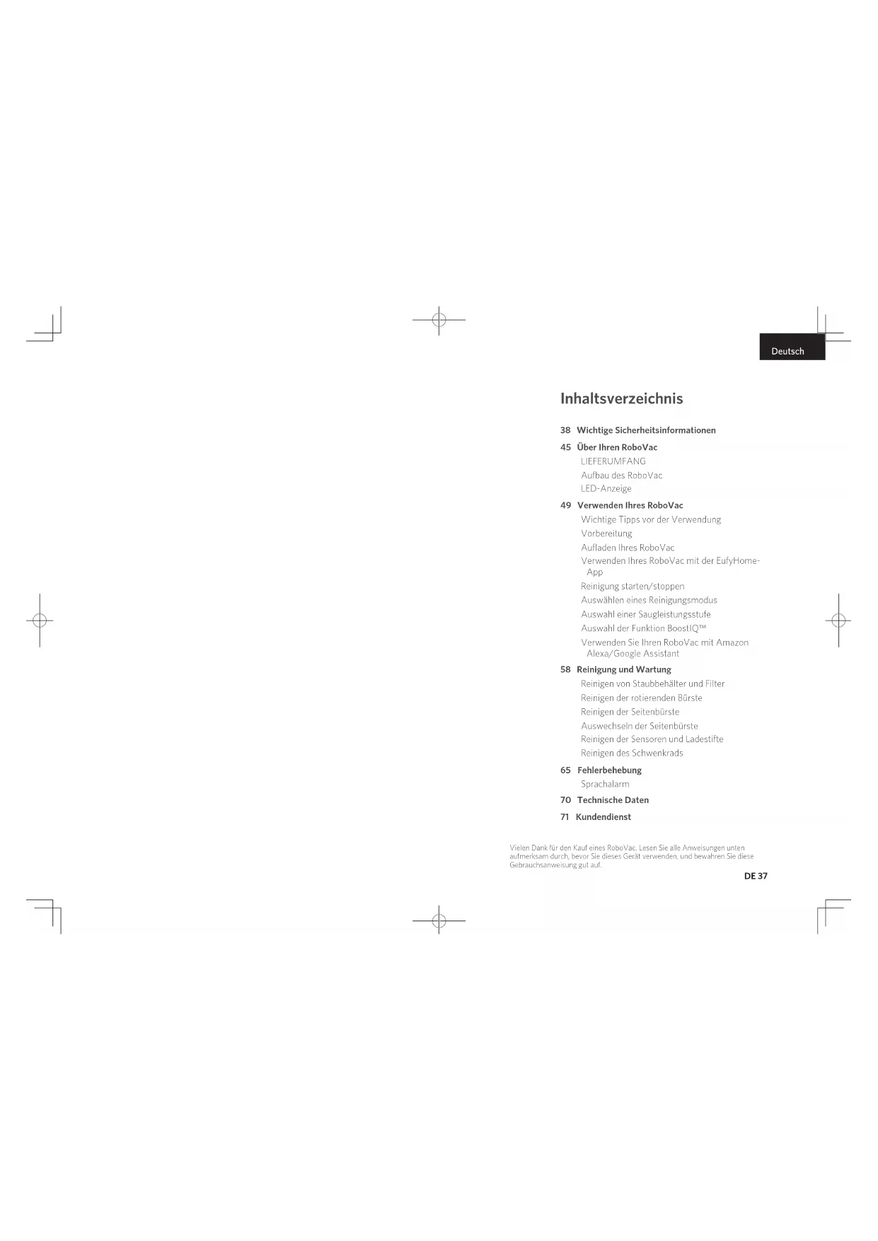 Frequency 50/60 Hz Customer Service For tutorial videos, FAQs, manuals, and more information, please visit: support.eufylife.com. Contact Us support@eufylife.com (US) +1 (800) 988 7973 Mon-Fri 6:15 - 17:00 (PT); Sat-Sun 6:30-16:30 (PT) (UK) +44 (0) 1604 936200 Mon-Fri 6:00 - 17:00; Sat-Sun 6:00-14:00 (DE) +49 (0) 69 9579 7960 Mo-Fr 8:00 - 16:00 (日本) 03 4455 7823 月-金 9:00 - 17:00 www.eufylife.com For more support phone numbers, please visit: support.eufylife.com/s/phonecontactus Or scan the QR code below: Anker Innovations Limited Room 1318-19, Hollywood Plaza, 610 Nathan Road, Mongkok, Kowloon, Hong KongDeutsch DE 37 Vielen Dank für den Kauf eines RoboVac. Lesen Sie alle Anweisungen unten aufmerksam durch, bevor Sie dieses Gerät verwenden, und bewahren Sie diese Gebrauchsanweisung gut auf. Inhaltsverzeichnis 38 Wichtige Sicherheitsinformationen 45 Über Ihren RoboVac LIEFERUMFANG Aufbau des RoboVac LED-Anzeige 49 Verwenden Ihres RoboVac Wichtige Tipps vor der Verwendung Vorbereitung Aufladen Ihres RoboVac Verwenden Ihres RoboVac mit der EufyHome- App Reinigung starten/stoppen Auswählen eines Reinigungsmodus Auswahl einer Saugleistungsstufe Auswahl der Funktion BoostIQ™ Verwenden Sie Ihren RoboVac mit Amazon Alexa/Google Assistant 58 Reinigung und Wartung Reinigen von Staubbehälter und Filter Reinigen der rotierenden Bürste Reinigen der Seitenbürste Auswechseln der Seitenbürste Reinigen der Sensoren und Ladestifte Reinigen des Schwenkrads 65 Fehlerbehebung Sprachalarm 70 Technische Daten 71 KundendienstDeutsch Deutsch 38 DE DE 39 Wichtige Sicherheitsinformationen Halten Sie diese Anweisung bei der Einrichtung, Verwendung und Wartung dieses Gerätes griffbereit, um das Risiko von Verletzungen und Beschädigungen zu verringern. VERWENDETE WARNSYMBOLE Dies ist das Sicherheitswarnsymbol. Dieses Symbol weist Sie auf mögliche Gefahren hin, die zu Sachschäden und/ oder schweren Verletzungen oder Todesfällen führen können.