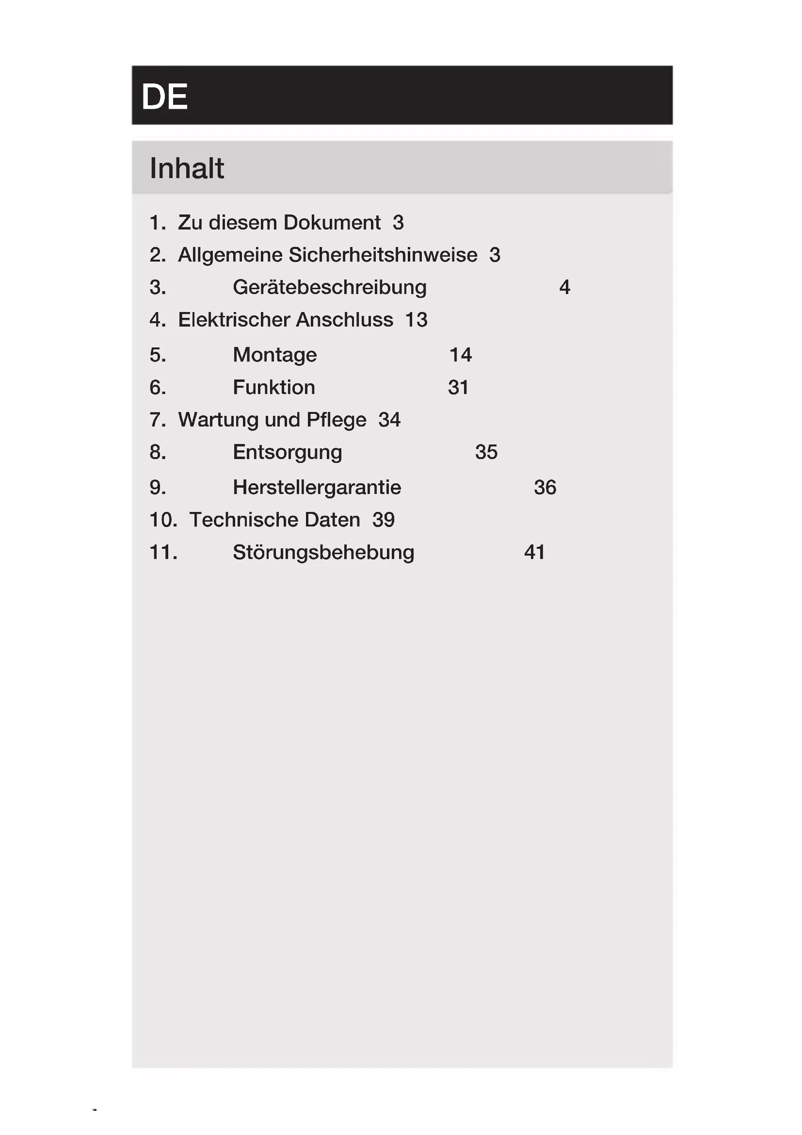 - Zugänglich aufbewahren. – Der Umgang mit elektrischem Strom kann zu gefährlichen Situationen führen. Die Berührung von strom führenden Teilen kann zu elektrischem Schock, Verbrennungen oder Tod führen. – Die Arbeit an der Netzspannung ist nur durch qualifizier- tes Fachpersonal zulässig. – Landesübliche Installationsvorschriften und Anschluss- bedingungen sind zu beachten (z.B. D: VDE 0100, A: ÖVE-ÖNORM E8001-1, CH:SEV 1000).– 4 – Inhalt – Nur Original-Ersatzteile verwenden. – Reparaturen sind nur durch Fachbetriebe zulässig.